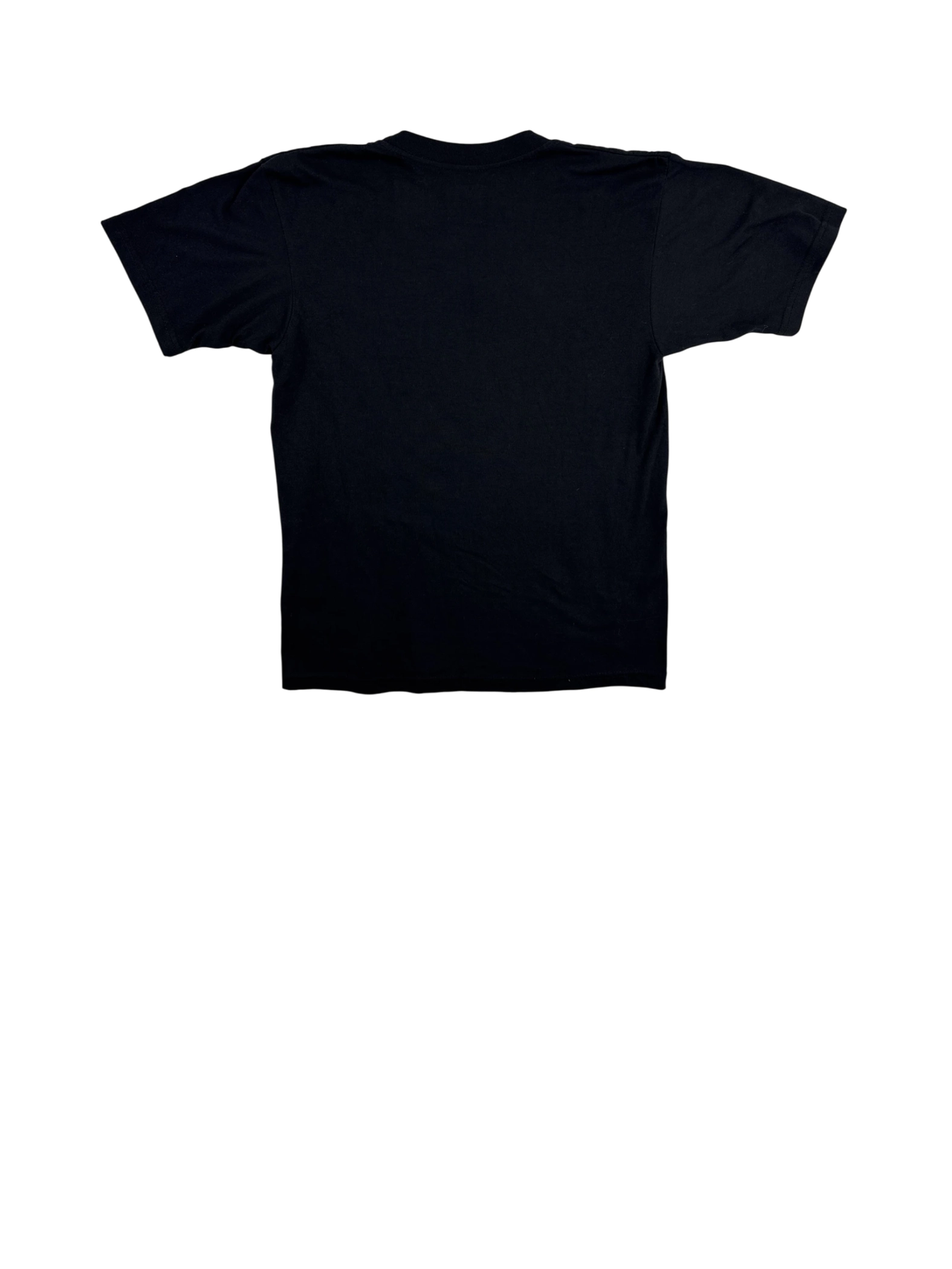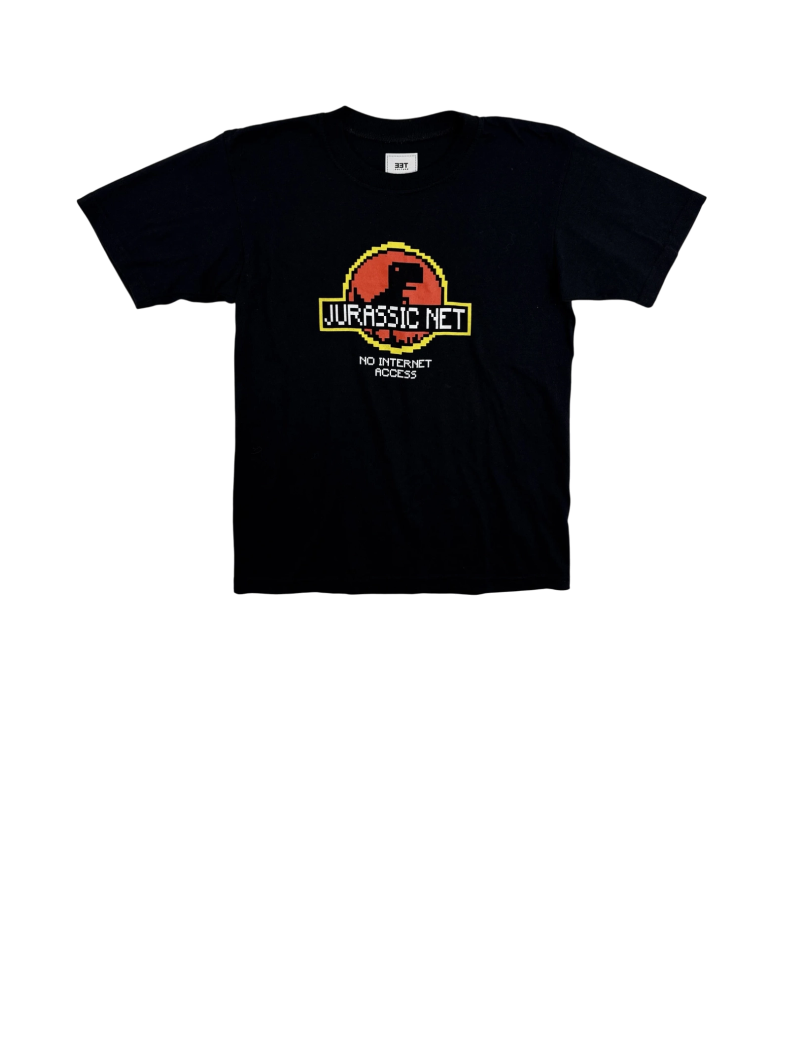 This pre-owned 33T Culture t-shirt is a stylish addition to any wardrobe. Featuring a unique graphic design that parodies Jurassic Park, this tee is made from comfortable cotton. Perfect for casual wear, it's ideal for warm weather. Available in size small, this black t-shirt has a classic round neck and short sleeves.