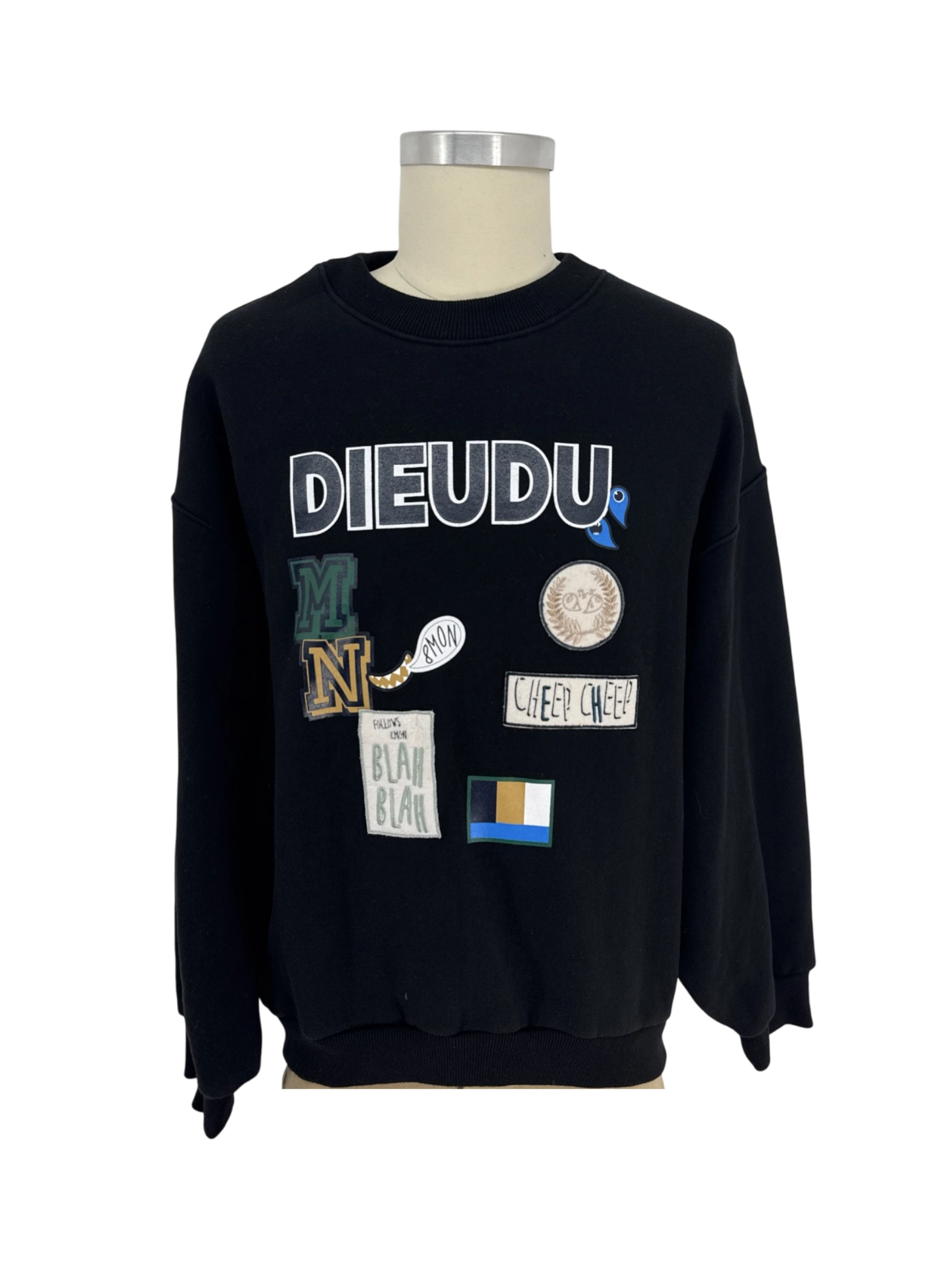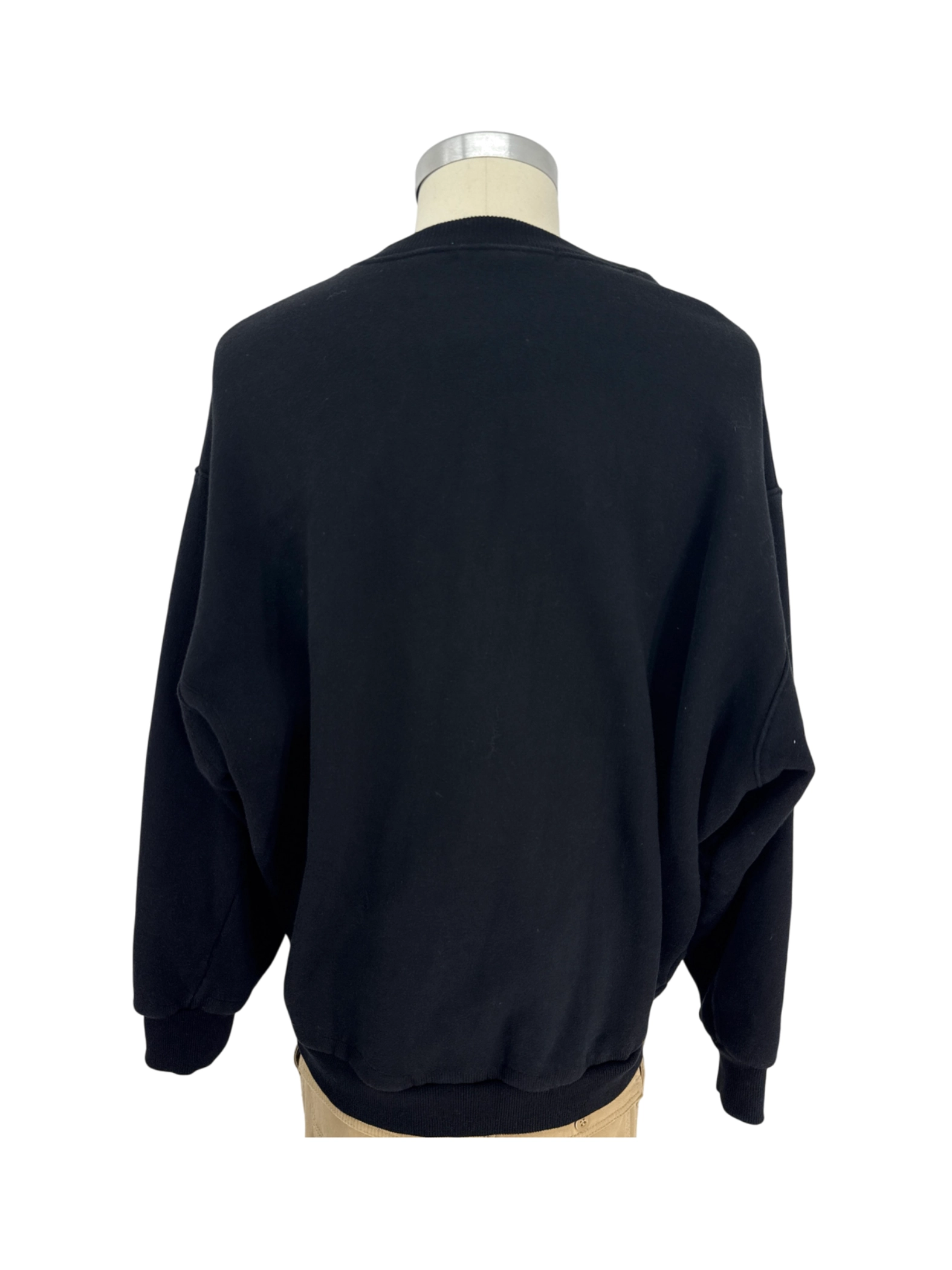 Elevate your casual wardrobe with this pre-owned 8 crewneck sweatshirt. This stylish pullover features a classic crew neck and long sleeves, perfect for cooler weather. The black base is adorned with playful and colorful graphic appliques, adding a unique touch. Crafted from a comfortable cotton blend with a hint of polyester for durability, this sweater offers a relaxed fit ideal for everyday wear. This is a perfect way to add personality to your outfit.
