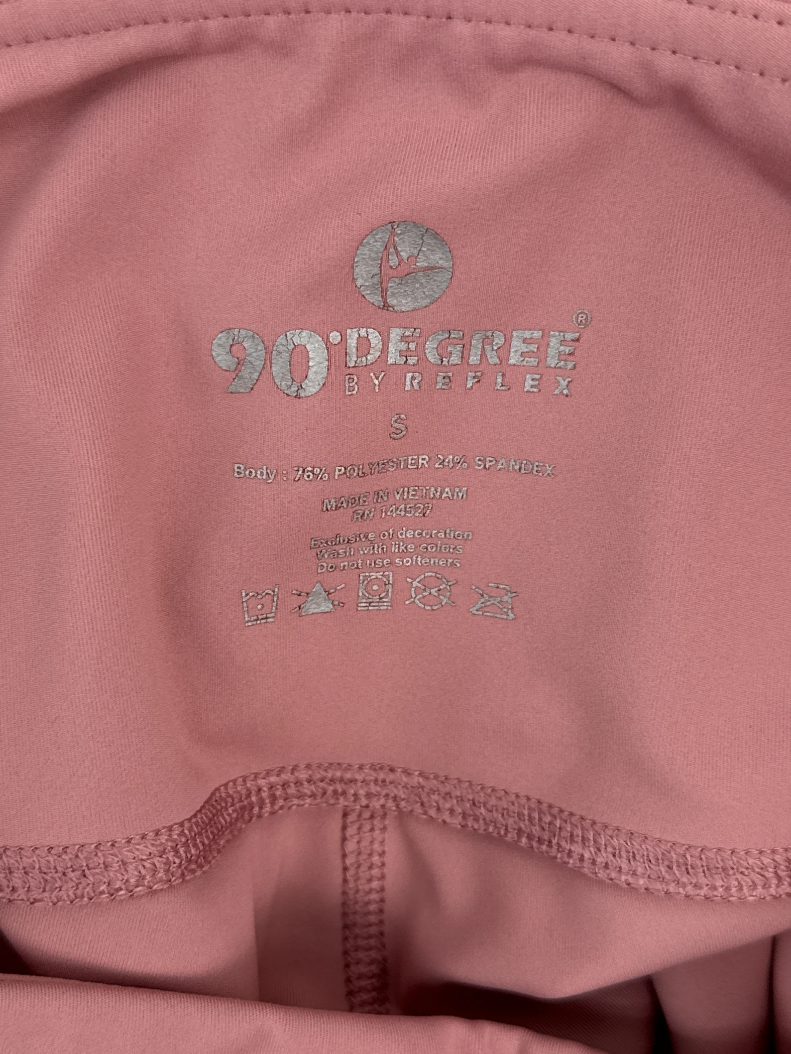 These pre-owned 90 Degree by Reflex activewear capri leggings are perfect for your workout routine or everyday wear. Crafted from a blend of polyester and spandex, these leggings offer a comfortable and flexible fit. The high-waisted design provides support, while the dusty pink color adds a touch of style. They are a versatile addition to your activewear collection.
