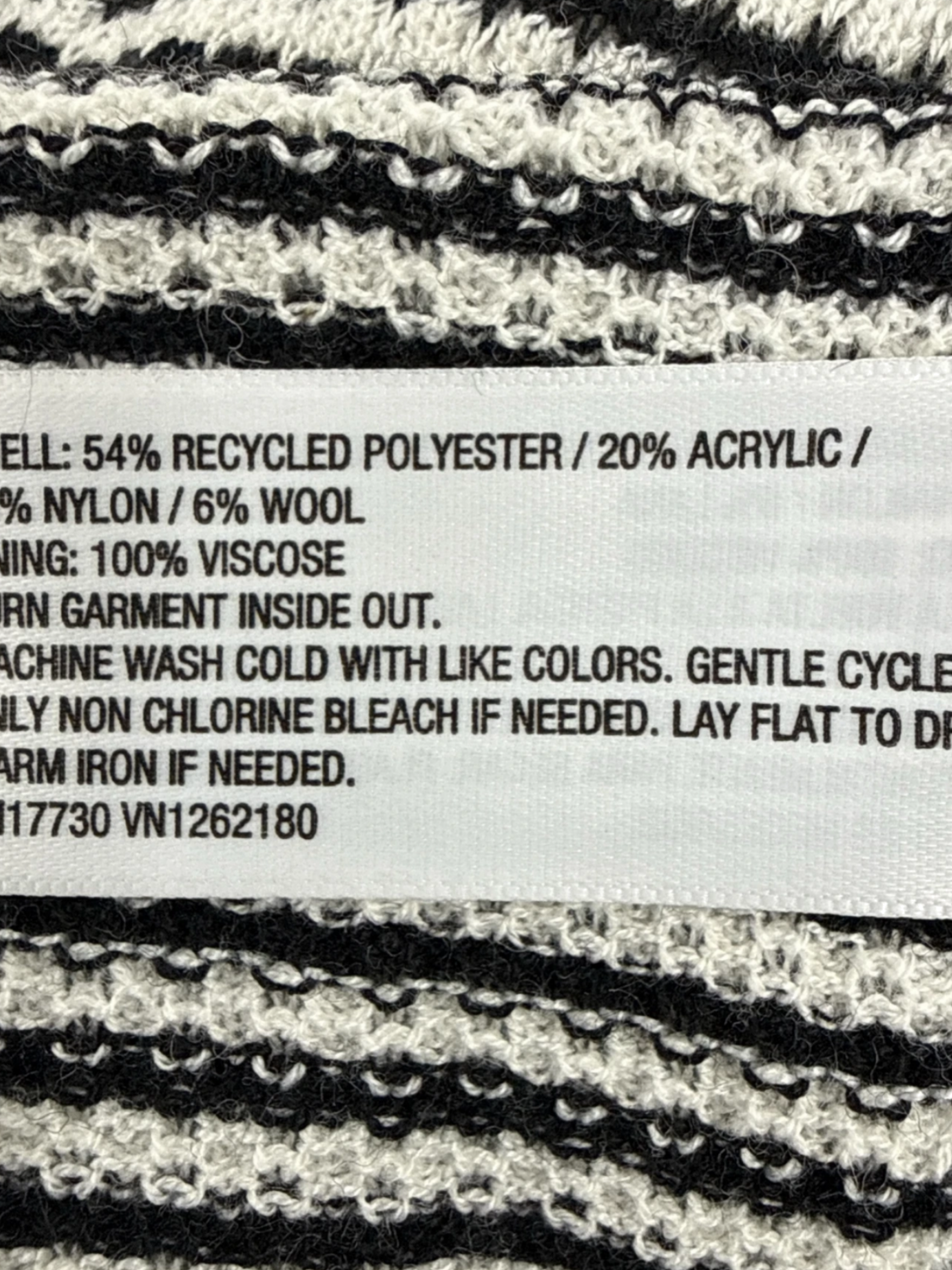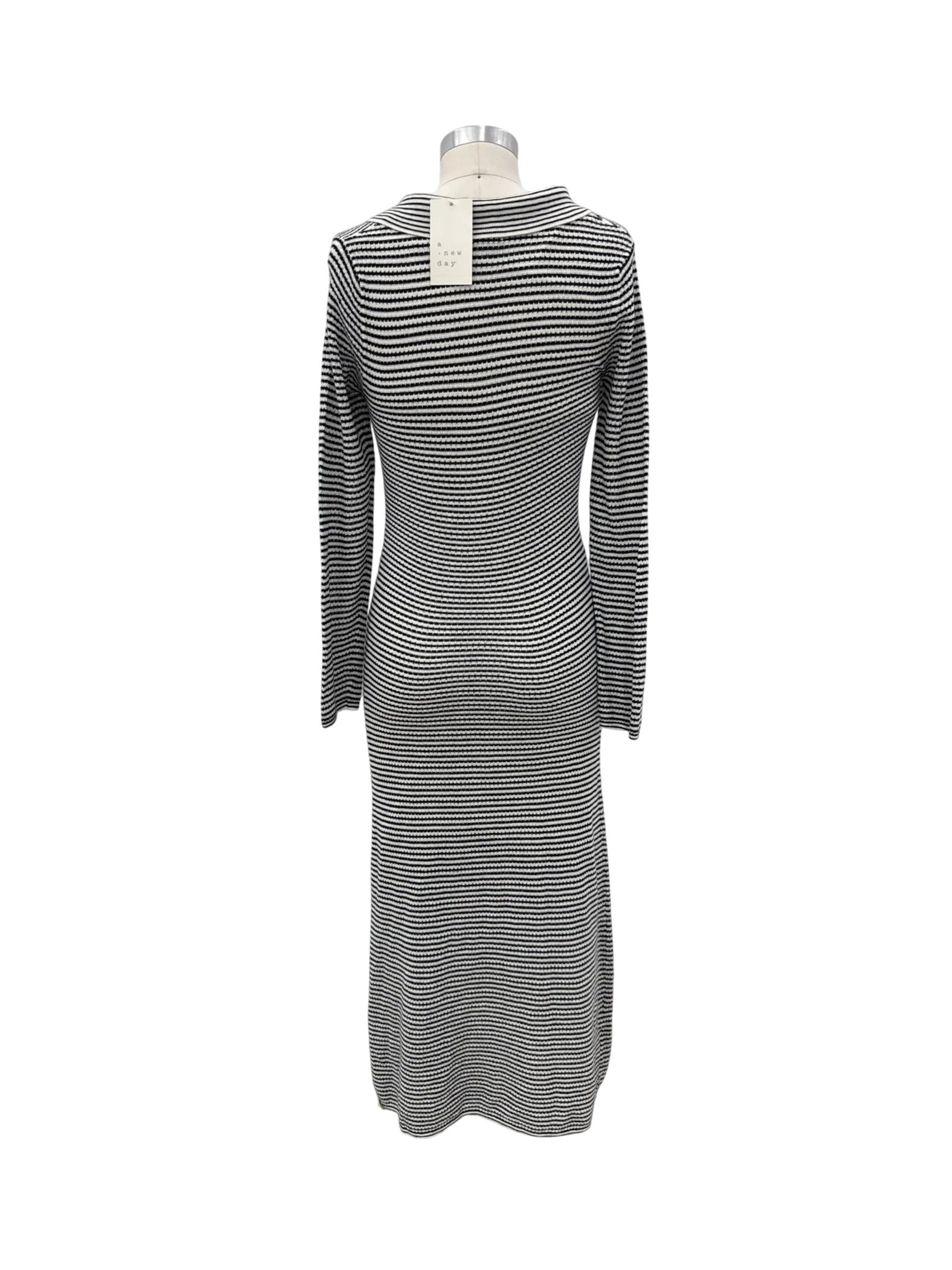 A New Day striped midi dress, perfect for the fall and winter seasons. Features a classic V-neck collar, long sleeves, and a flattering A-line silhouette. Made with a blend of polyester, acrylic, nylon, wool, and viscose for a comfortable fit. This pre-owned dress is a versatile addition to any wardrobe, ideal for everyday wear. The black and white striped pattern adds a touch of sophistication.