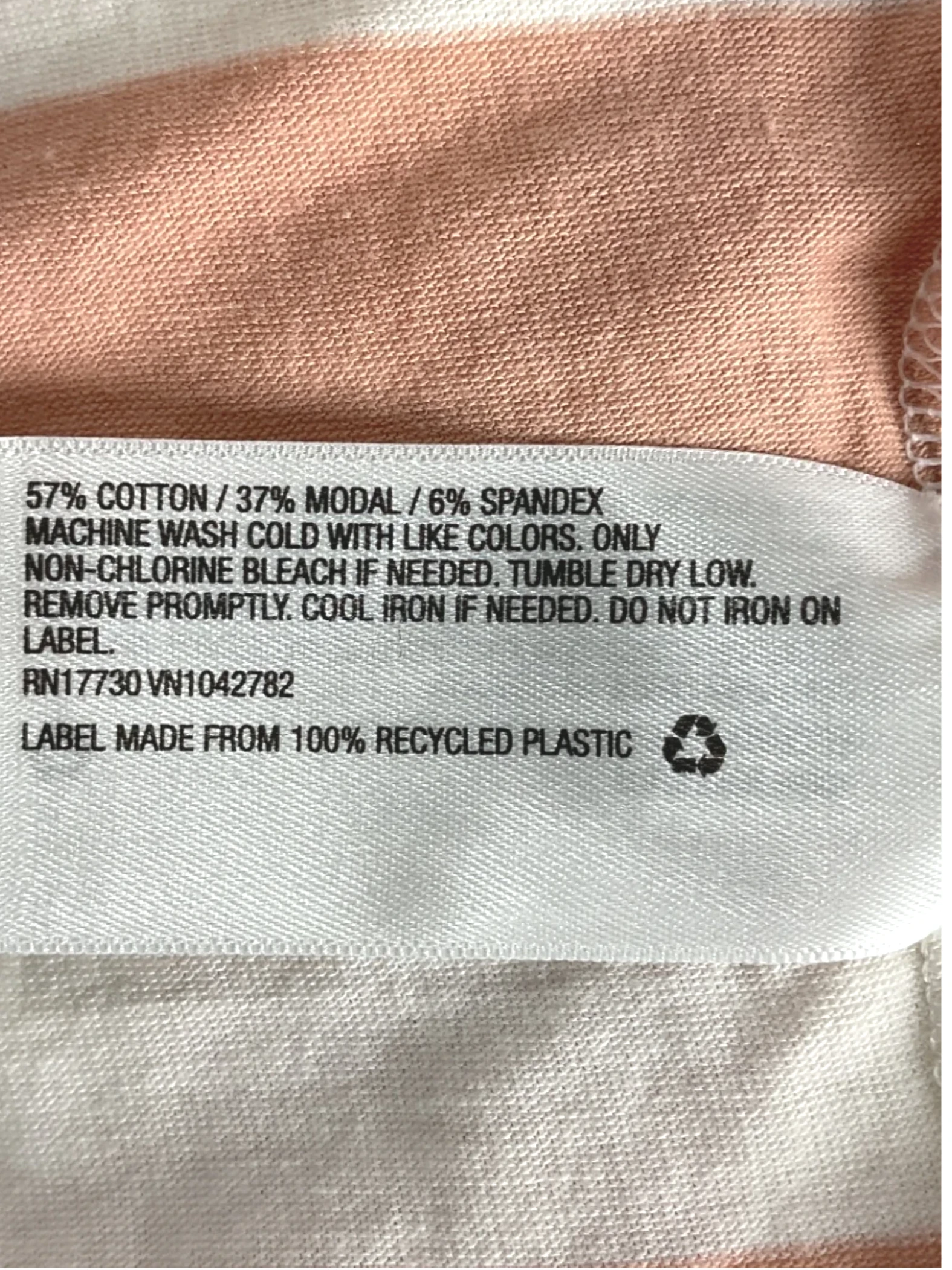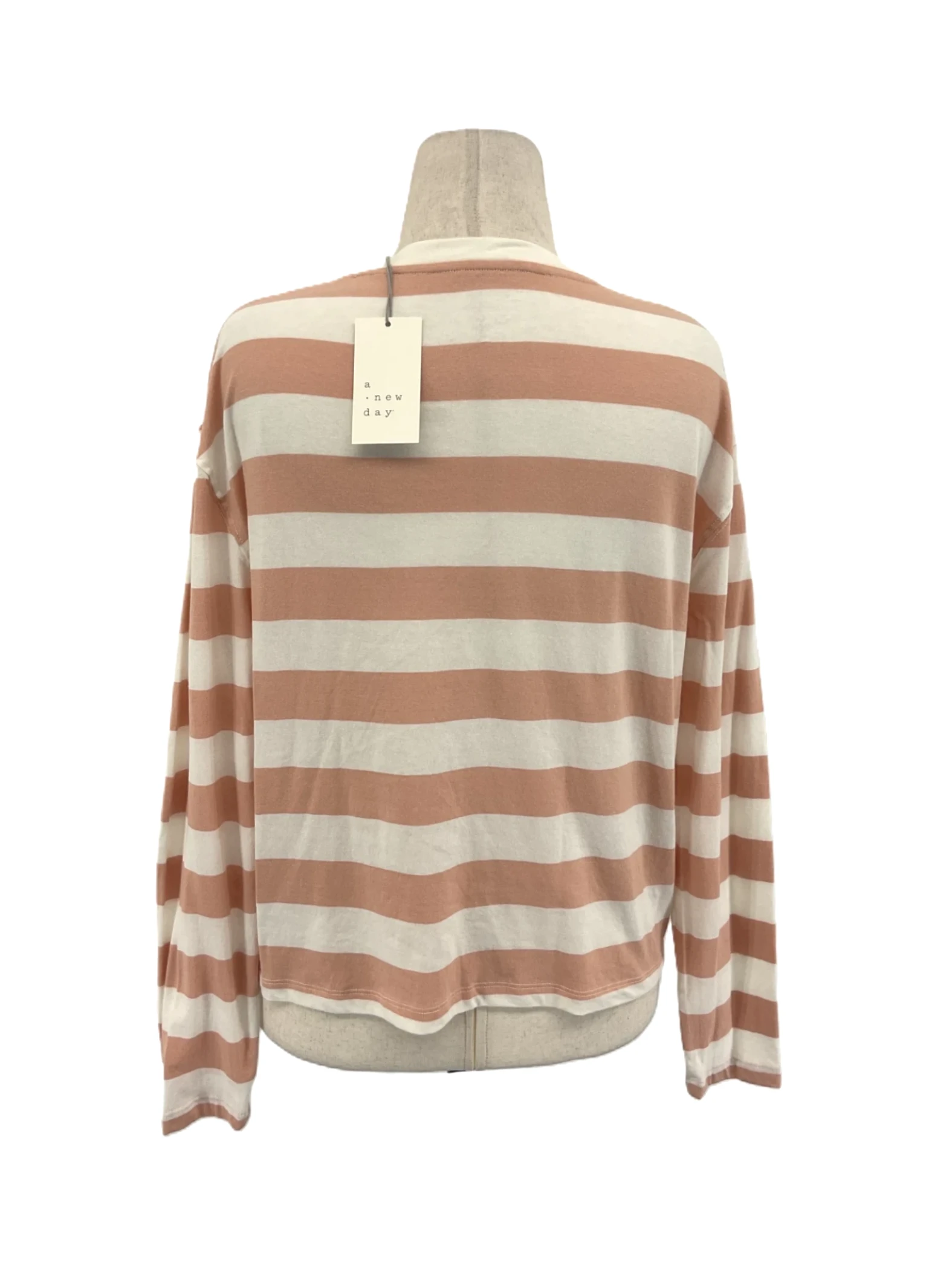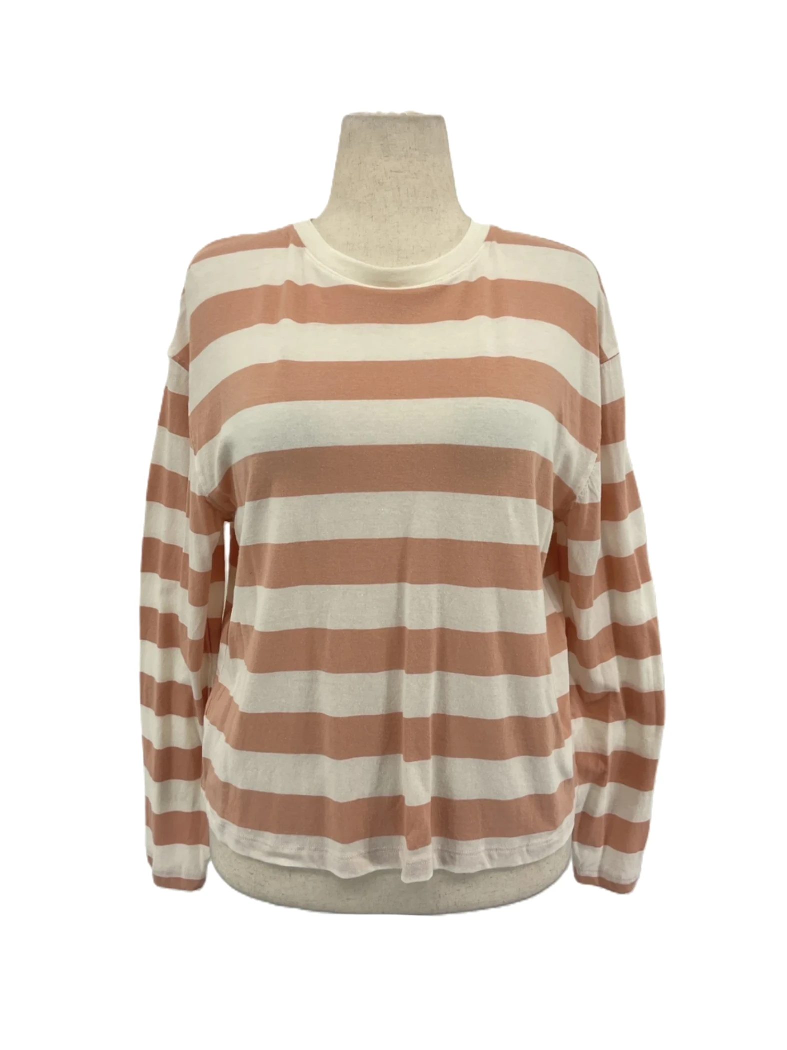 The shirt is women's long sleeve with rose gold and ivory stripes.
