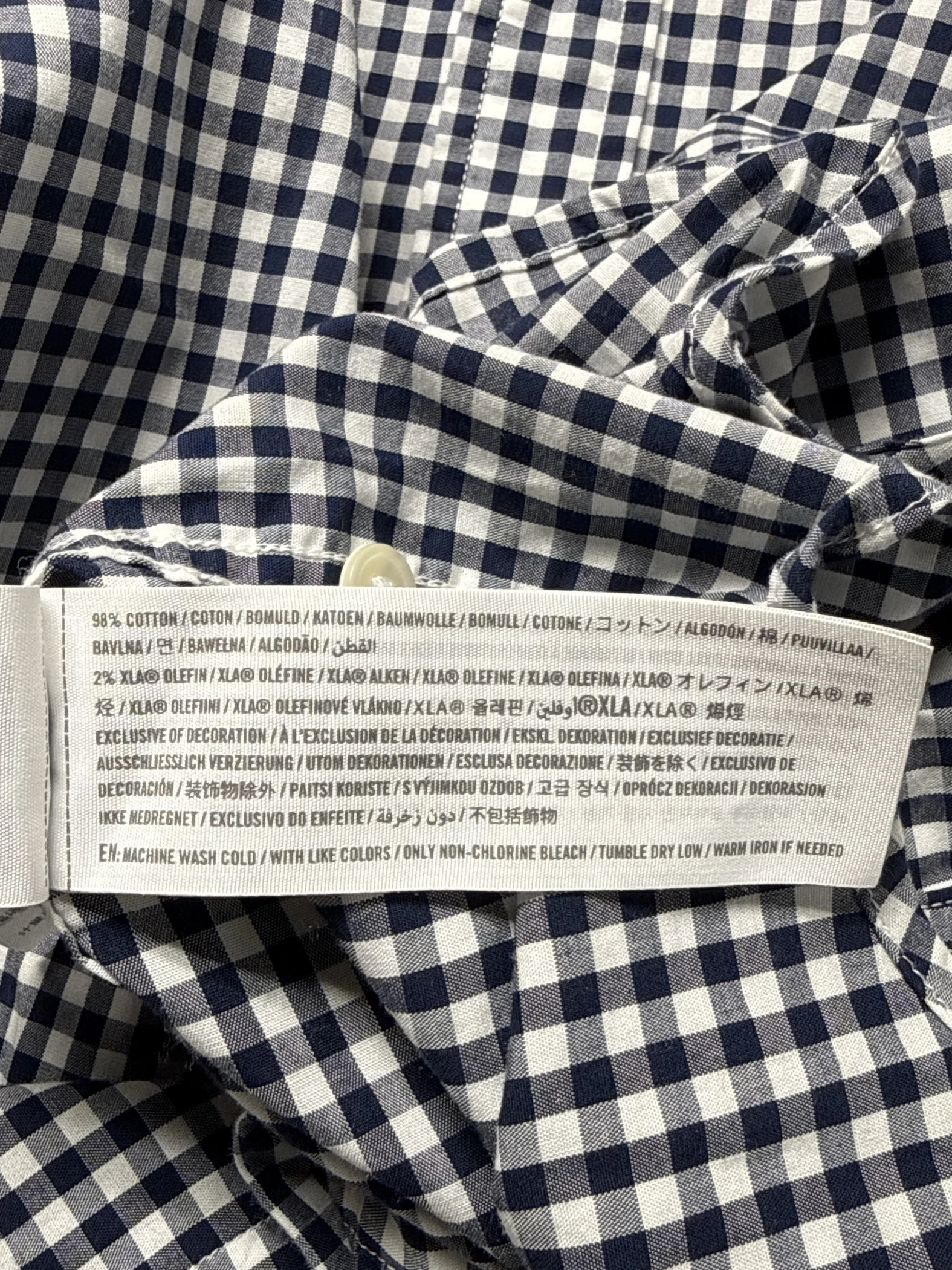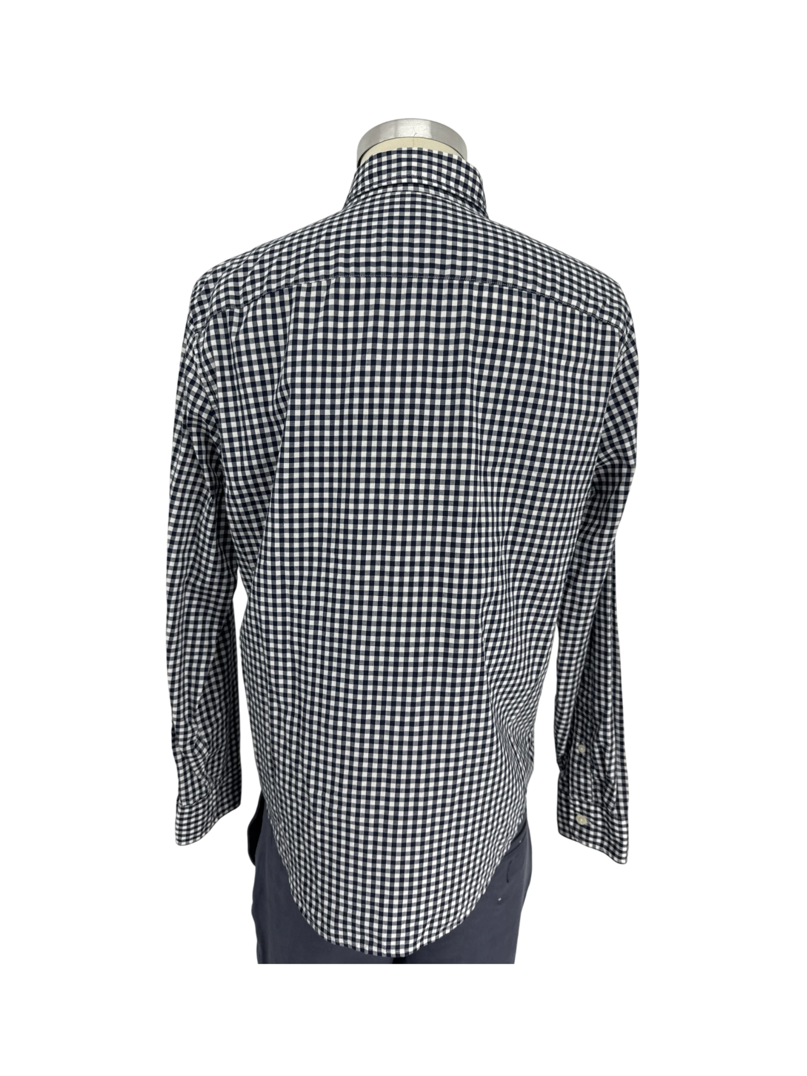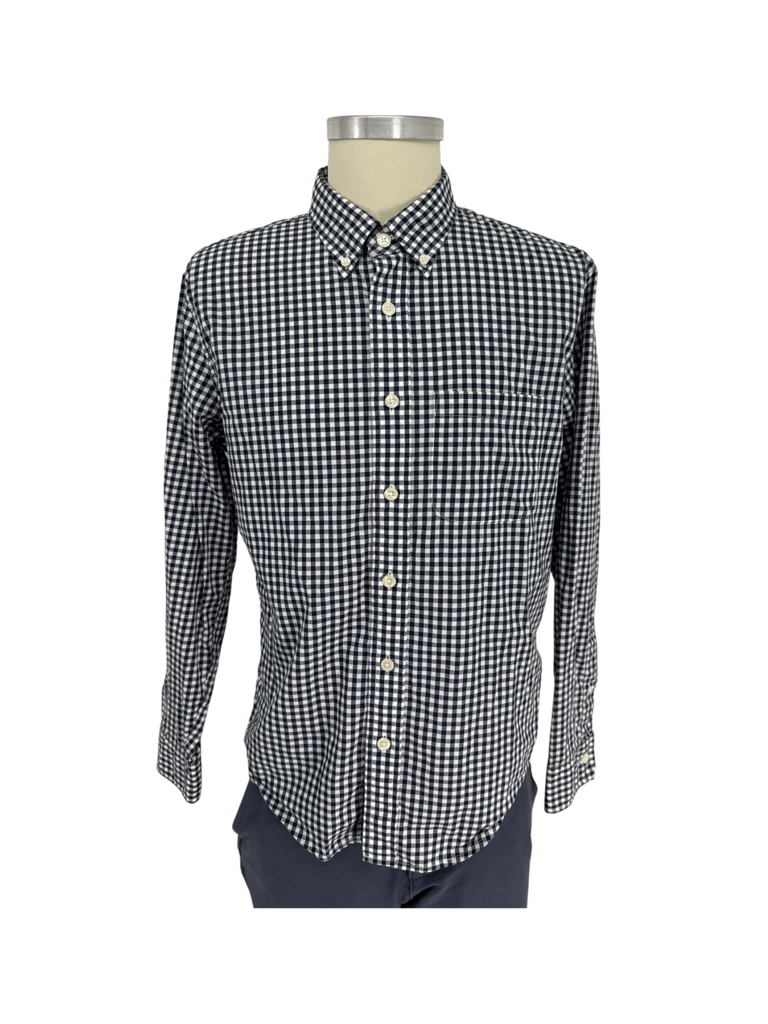 Elevate your wardrobe with this pre-owned Abercrombie & Fitch long sleeve shirt. Crafted from a soft cotton blend, this shirt features a classic checkered pattern in navy blue, perfect for a casual yet stylish look. It has a button-up closure and a collared neckline. Ideal for layering in spring, fall, or winter. This shirt is in excellent condition. Add this timeless piece to your collection today and enjoy a blend of comfort and style.
