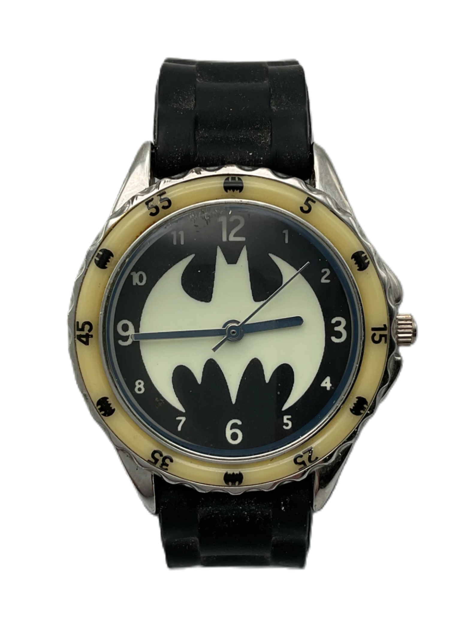 The watch is a men's black and beige Batman watch with a stainless steel case back.