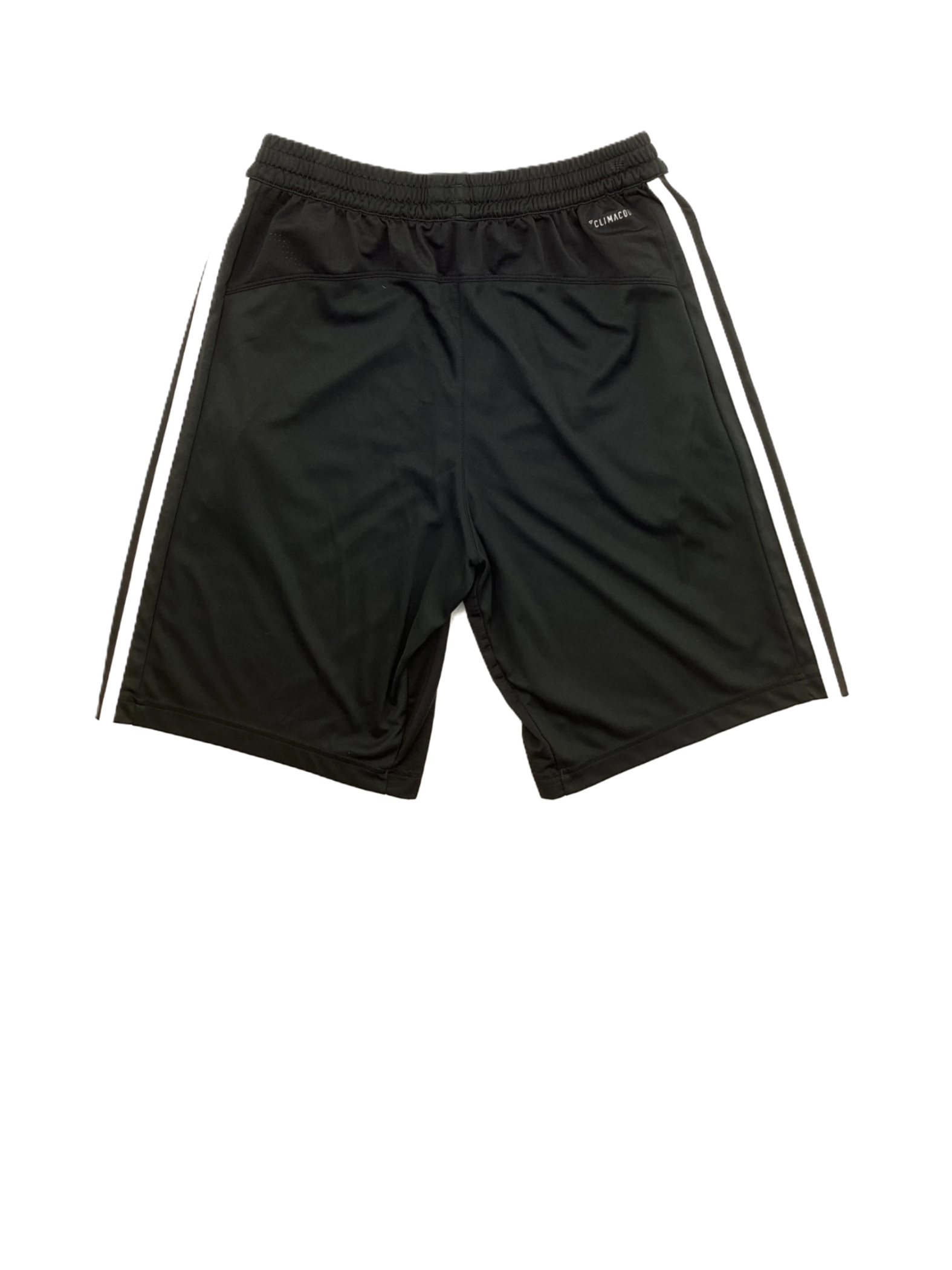 Used Adidas men's black athletic shorts in excellent condition. These shorts feature the iconic Adidas three-stripe design and are made from comfortable polyester material. Perfect for workouts or casual wear, they offer a great fit and feel. The shorts are designed with a focus on comfort and style, making them a versatile addition to any wardrobe. They come with an elastic waistband for an adjustable fit.