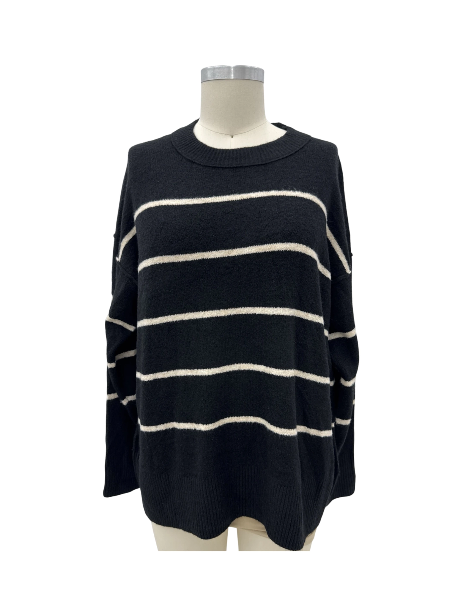 This pre-owned Aerie sweater is a stylish addition to any wardrobe. Featuring a classic striped pattern in black and white, this cozy sweater offers a comfortable and chic look. Made with a blend of recycled polyester, acrylic, and elastane, it's perfect for the fall and winter seasons. The pullover style and round neckline provide a versatile design suitable for casual outings. It's a great choice for those seeking both style and sustainability in their everyday wear.