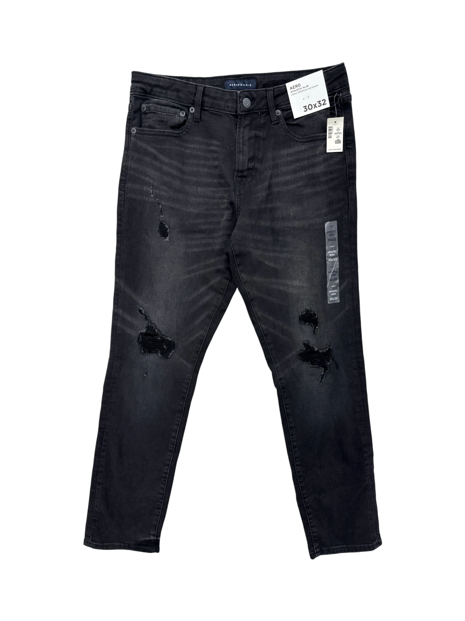 These pre-owned Aeropostale men's jeans are a stylish and comfortable choice for any wardrobe. The black denim features a classic straight fit, perfect for a casual yet put-together look. These jeans are made from a blend of cotton, polyester, and spandex for added stretch and durability. They are in great condition and ready to become your new go-to pair.