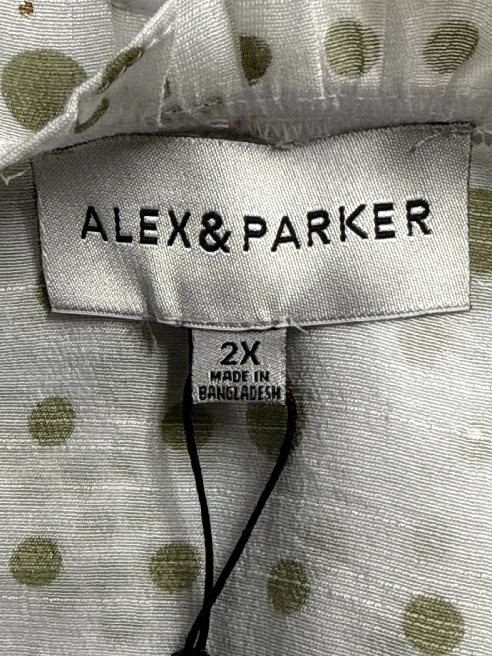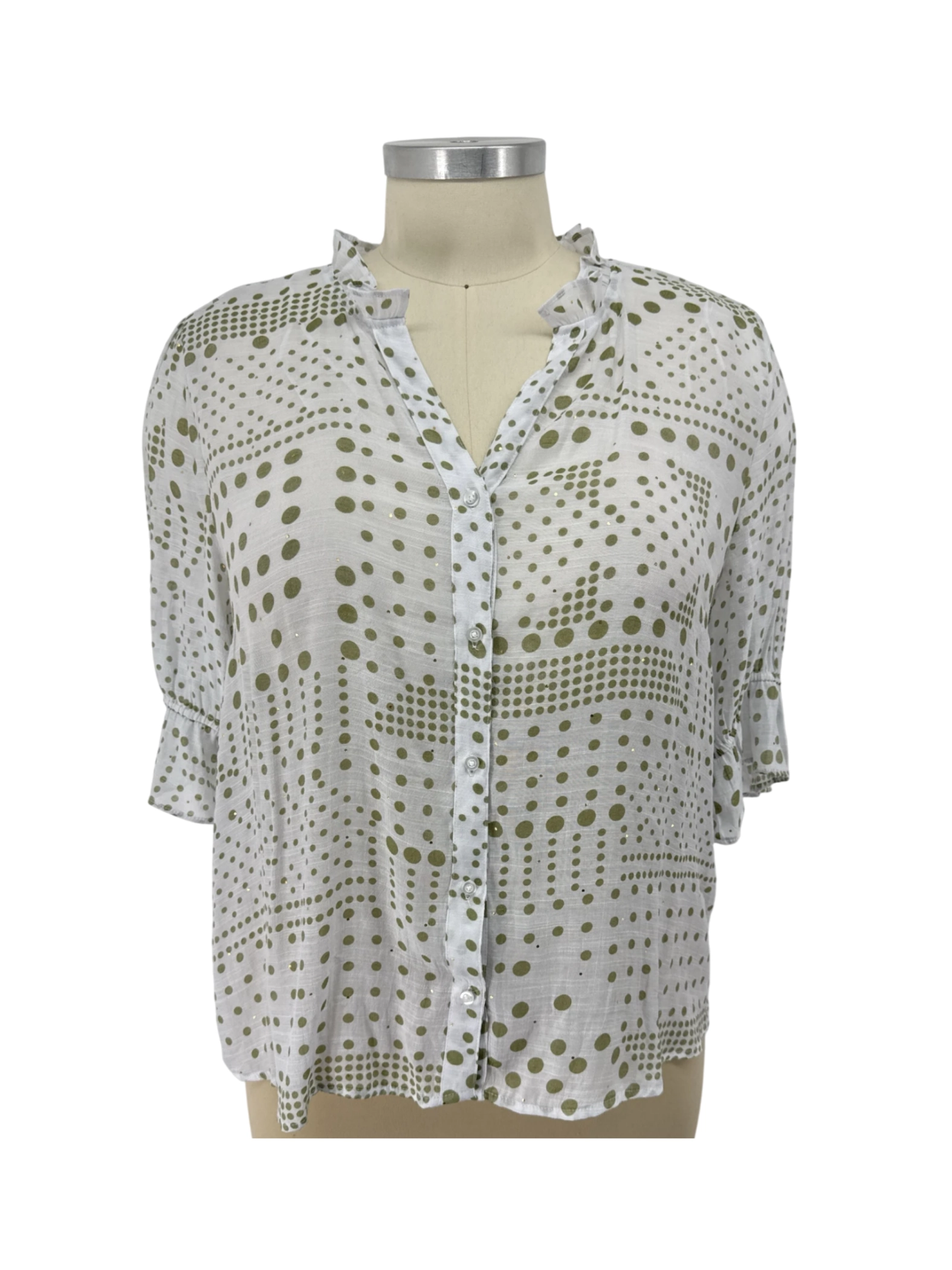 This ALEX & PARKER blouse is a stylish addition to any wardrobe. Featuring a classic polka dot pattern on a white base, the blouse is perfect for spring and summer. Designed with a round neck and short sleeves. This pre-owned blouse offers both comfort and style. The blouse made from a blend of rayon and polyester, this blouse ensures a comfortable fit and easy care. A versatile piece suitable for both casual and slightly more formal occasions.