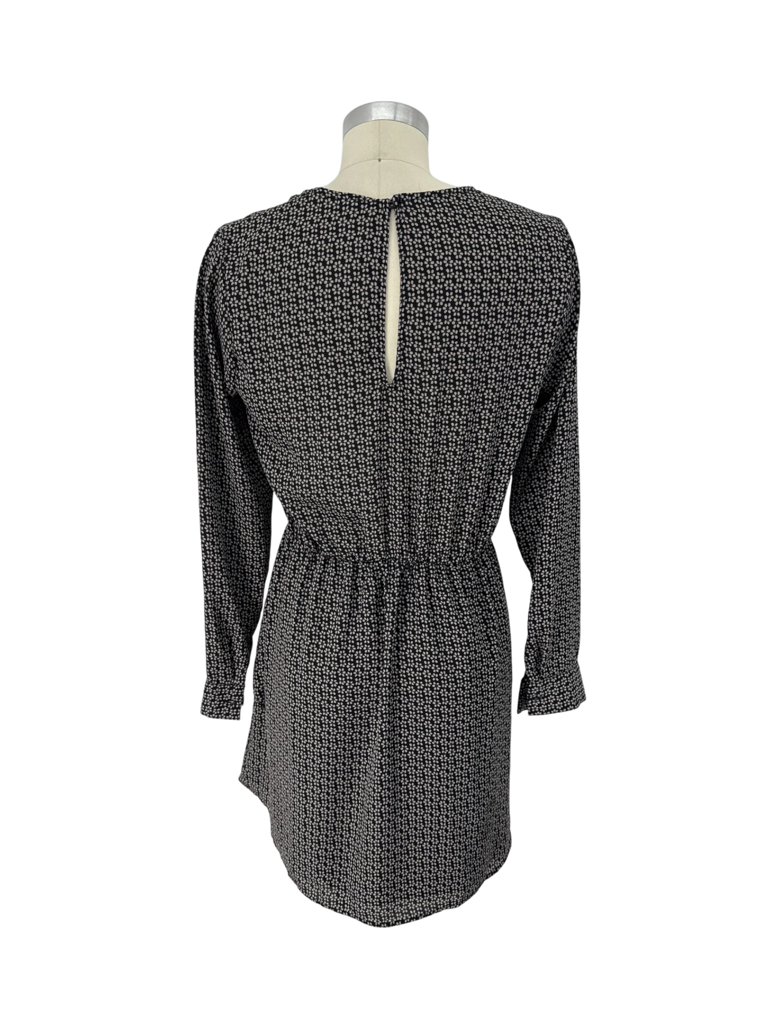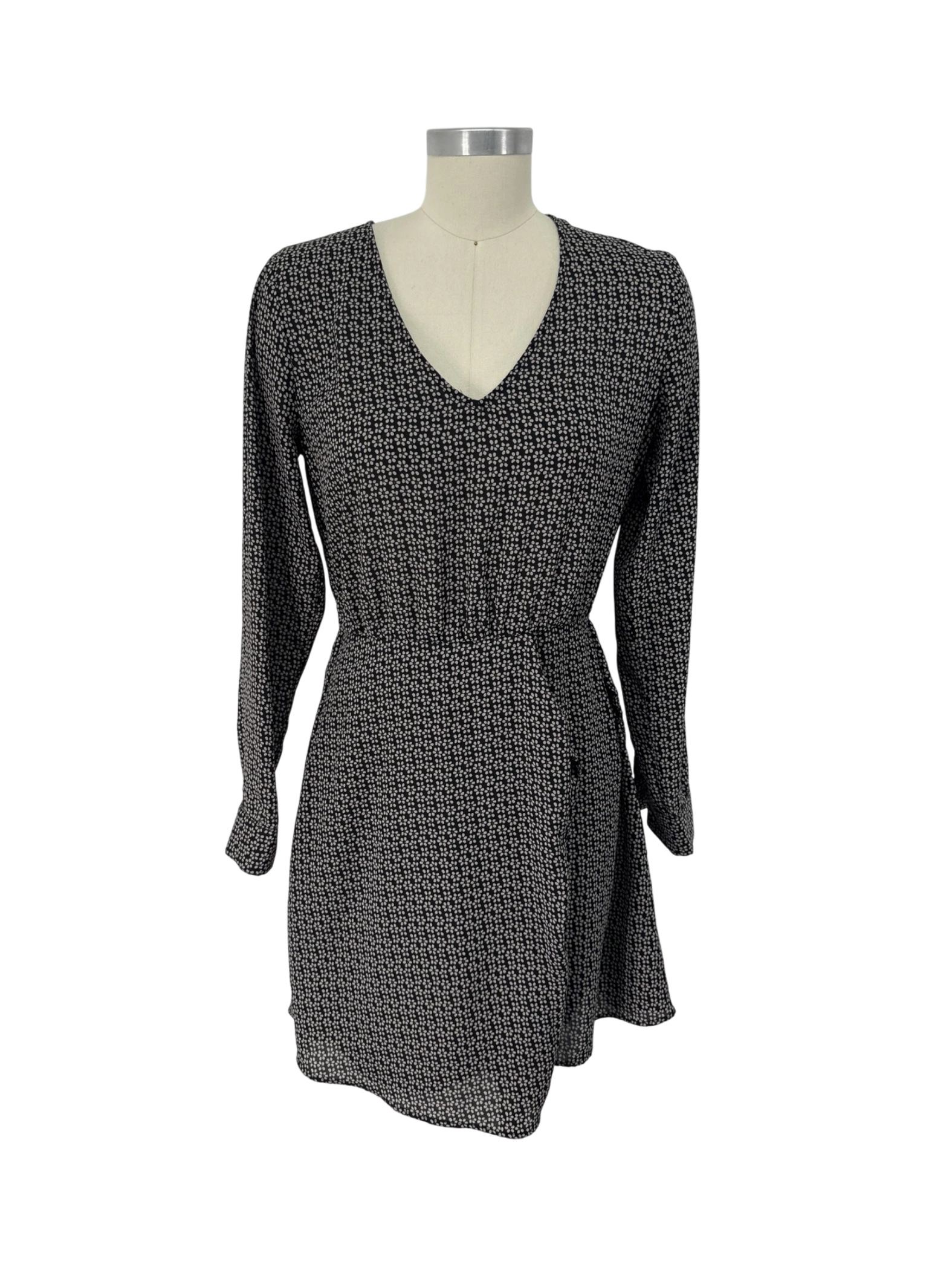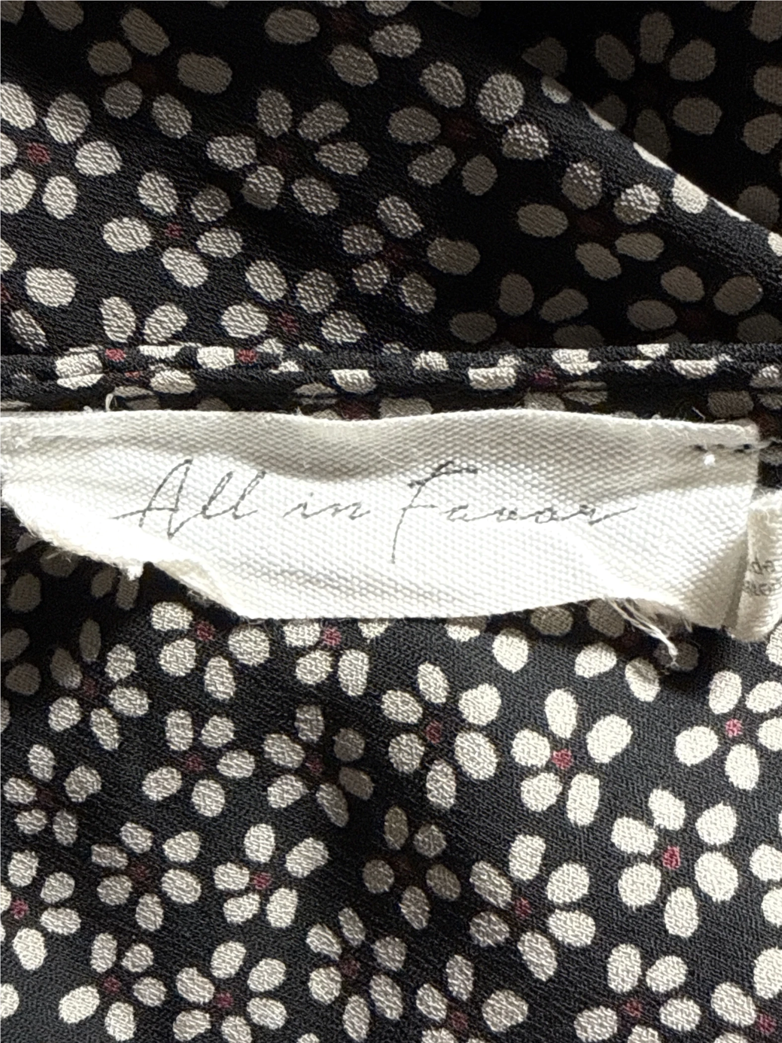 Elevate your everyday wardrobe with this stylish All in Favor dress. This pre-owned A-line dress features a flattering V-neck and long sleeves. The black floral print adds a touch of elegance, perfect for casual outings. Crafted from comfortable polyester, this dress offers a versatile mini-length silhouette. Ideal for Spring or Fall, it's a must-have addition to your dress collection. It's in great condition and ready to wear.