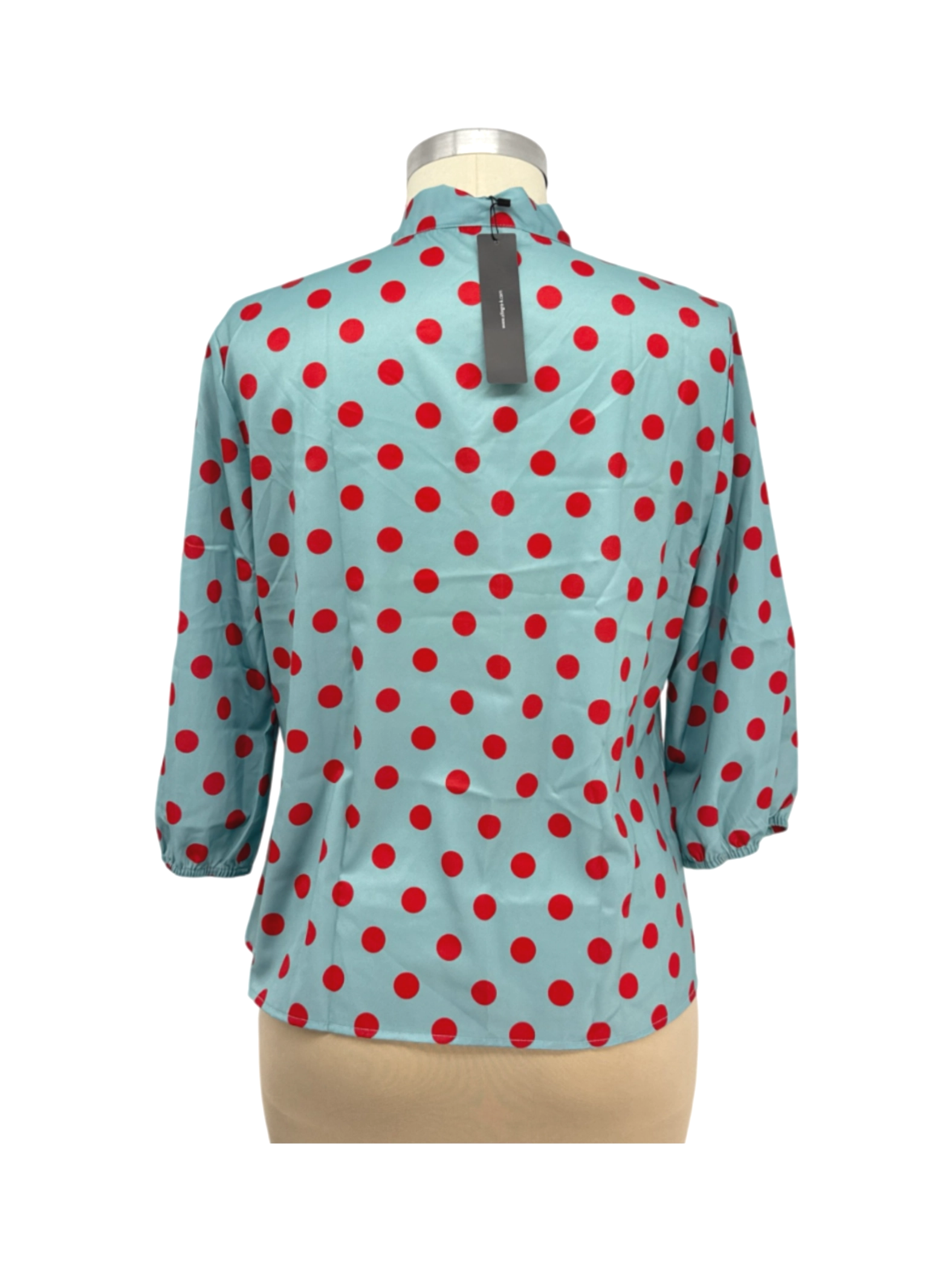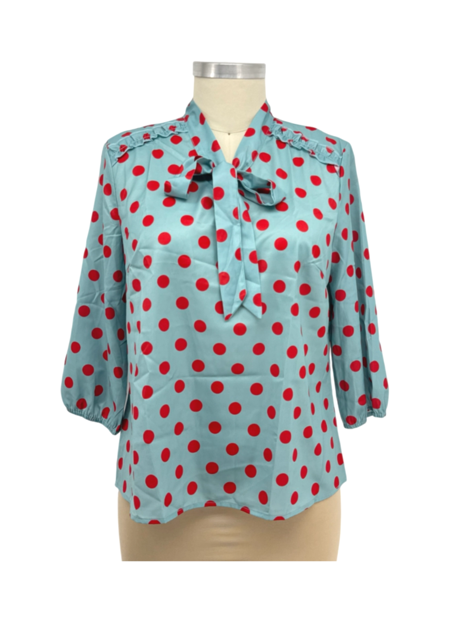 Charming Allegra K polka dot blouse, perfect for adding a playful touch to your wardrobe. This pre-owned blouse features a vibrant blue base with red polka dots. The ¾ sleeves and round neck design make it suitable for various seasons. Made from a soft polyester fabric, this blouse combines style and comfort. Great for casual and semi-formal occasions, pair it with jeans, skirts, or trousers for a chic, easy-to-wear outfit.