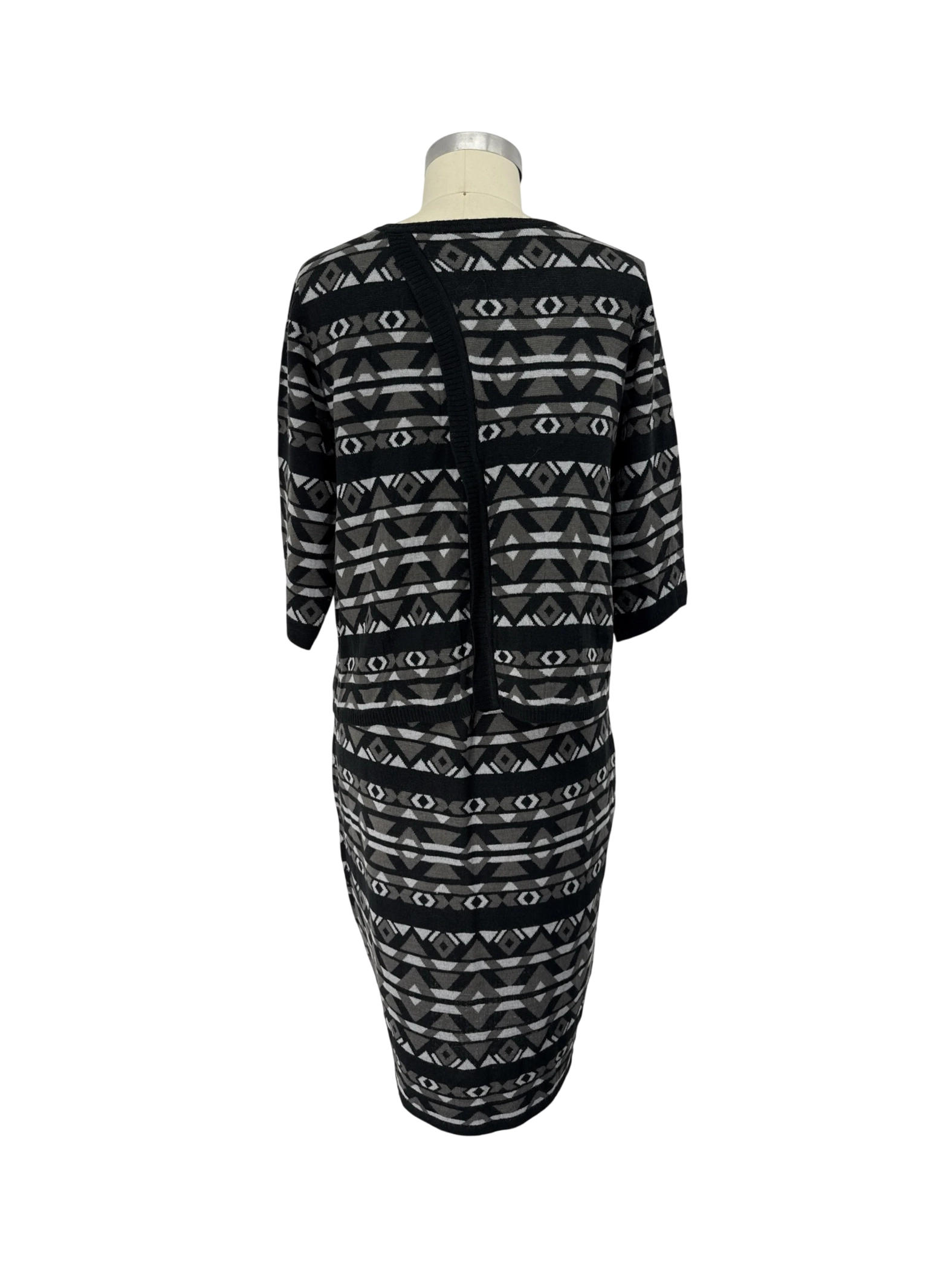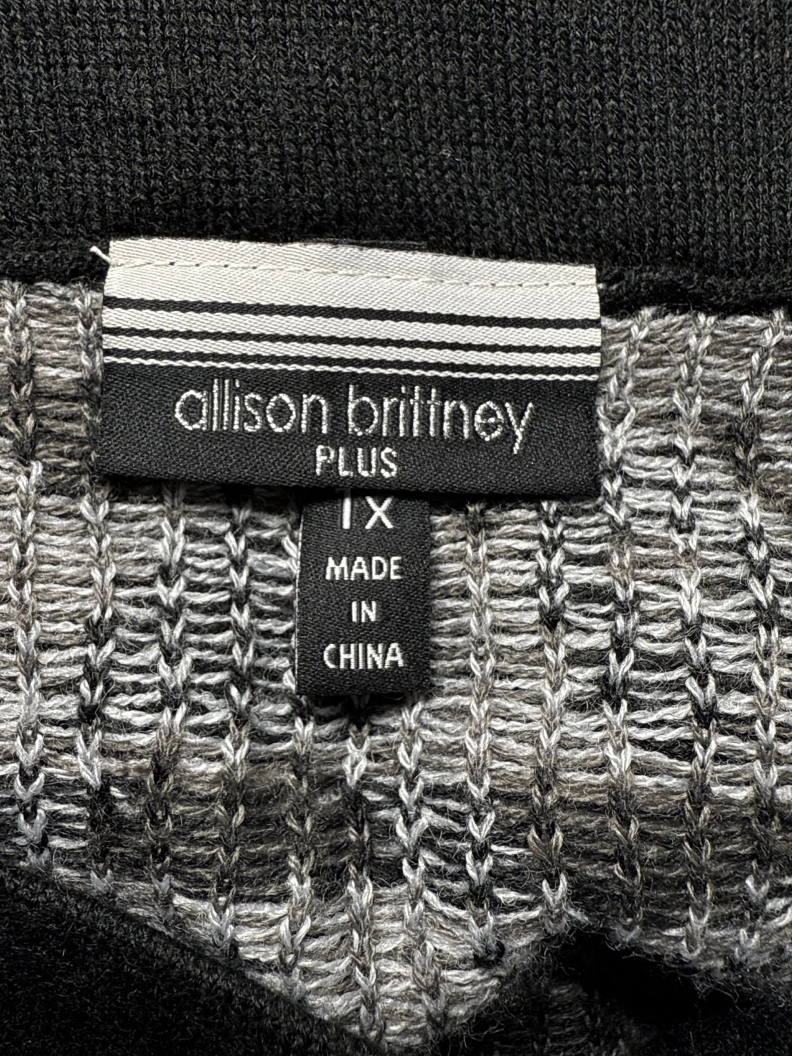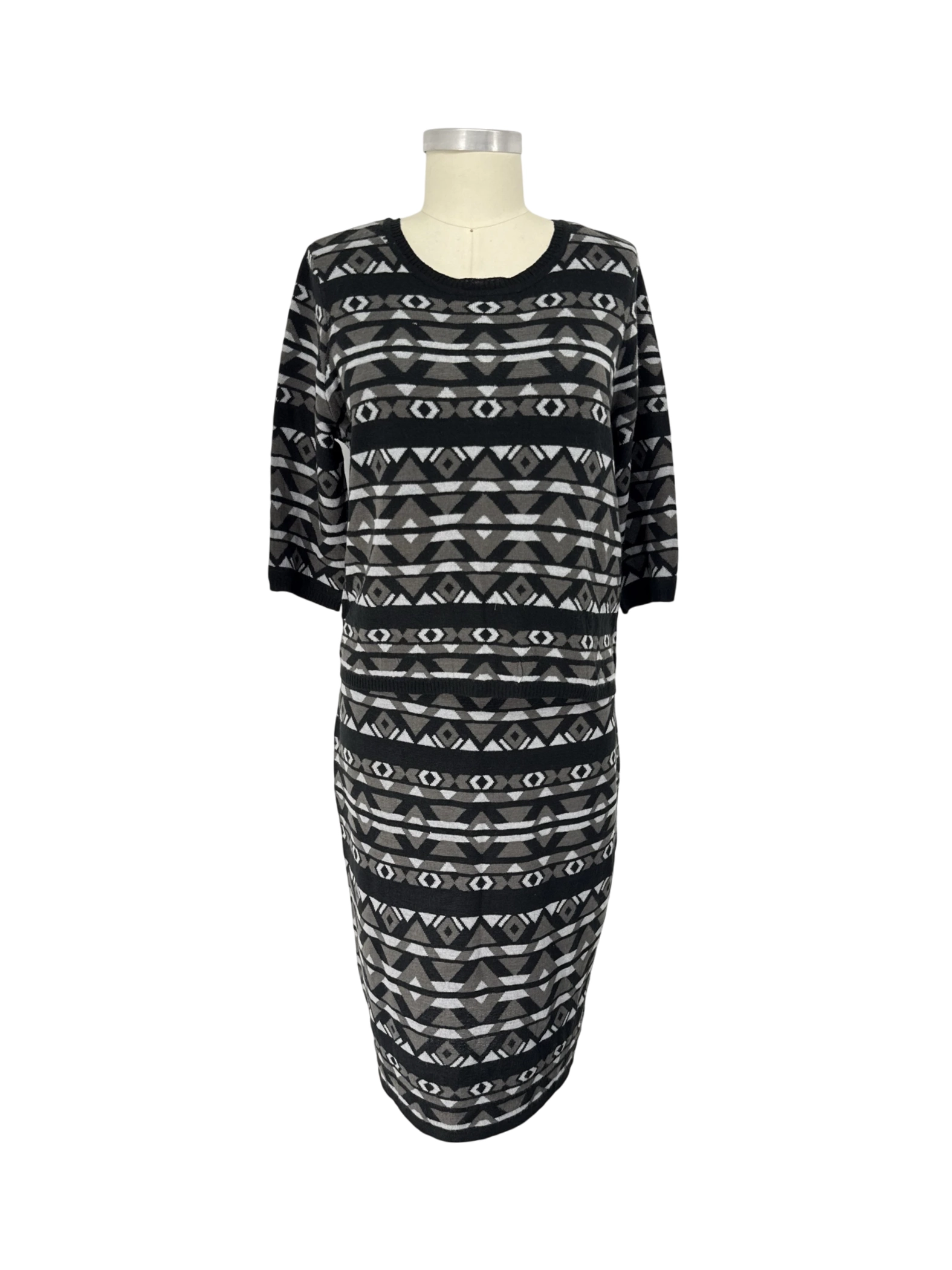 Size 1X. - This pre-owned allison britney dress is a stylish and comfortable addition to any wardrobe. Featuring a chic geometric pattern in black and gray, this dress is perfect for fall and winter. Made from 100% acrylic, it offers a cozy feel and easy care. The 1XL size ensures a comfortable fit. Ideal for casual outings or layering, this dress combines fashion and practicality effortlessly.