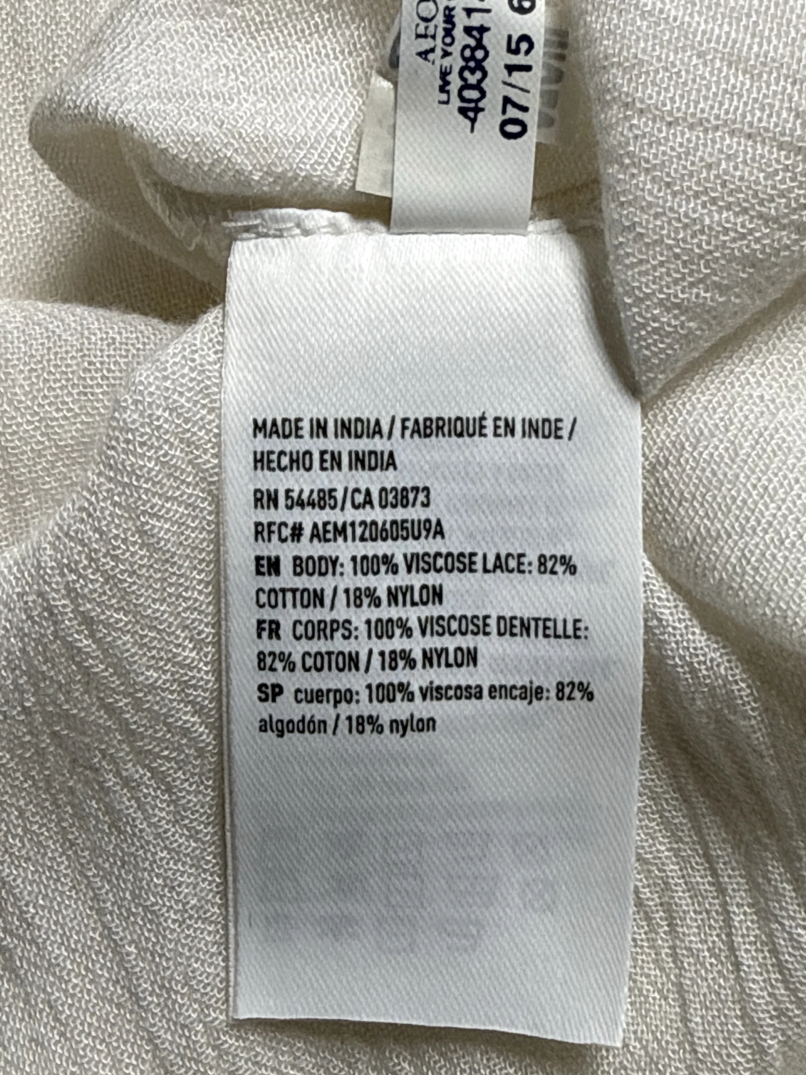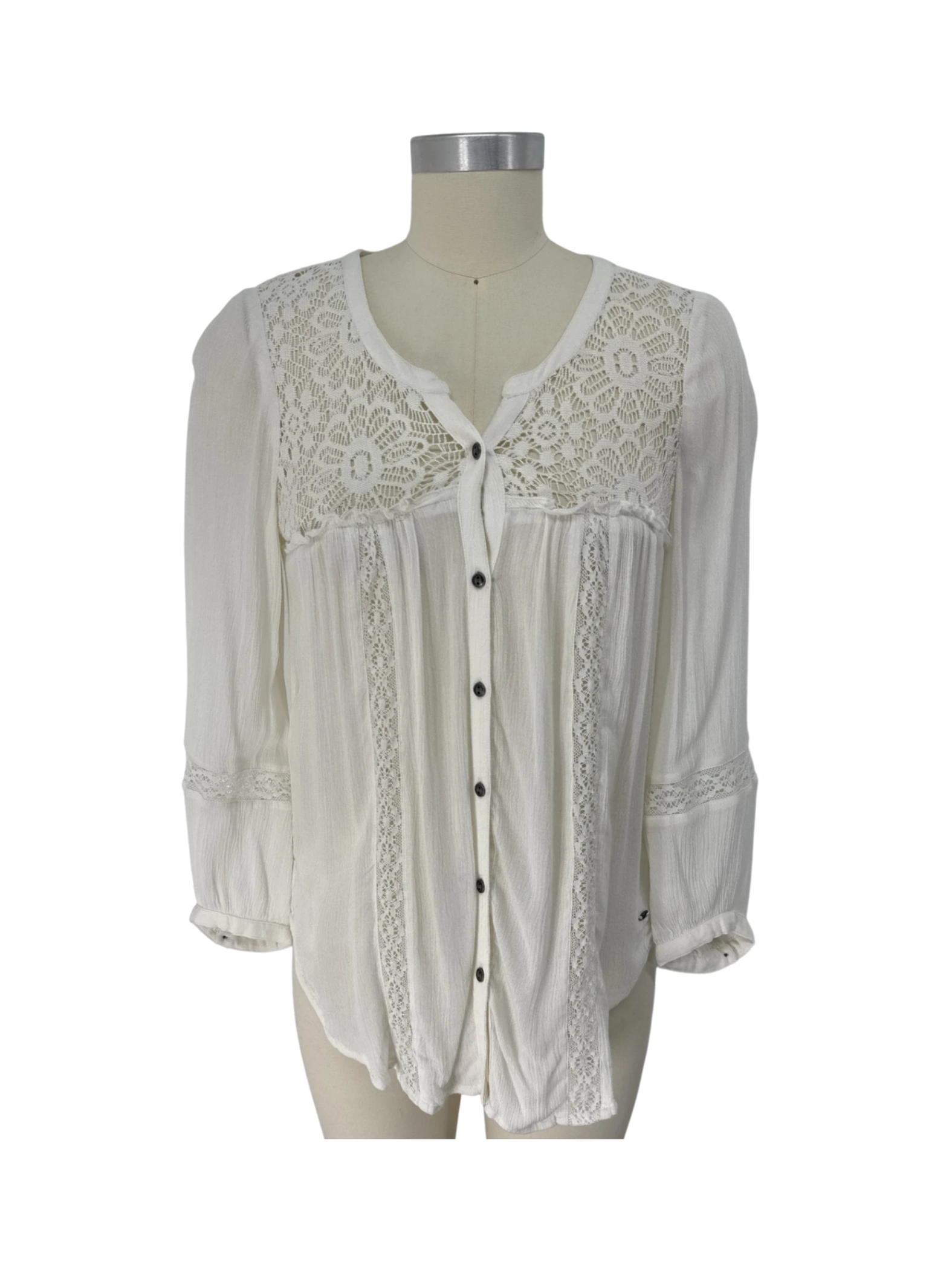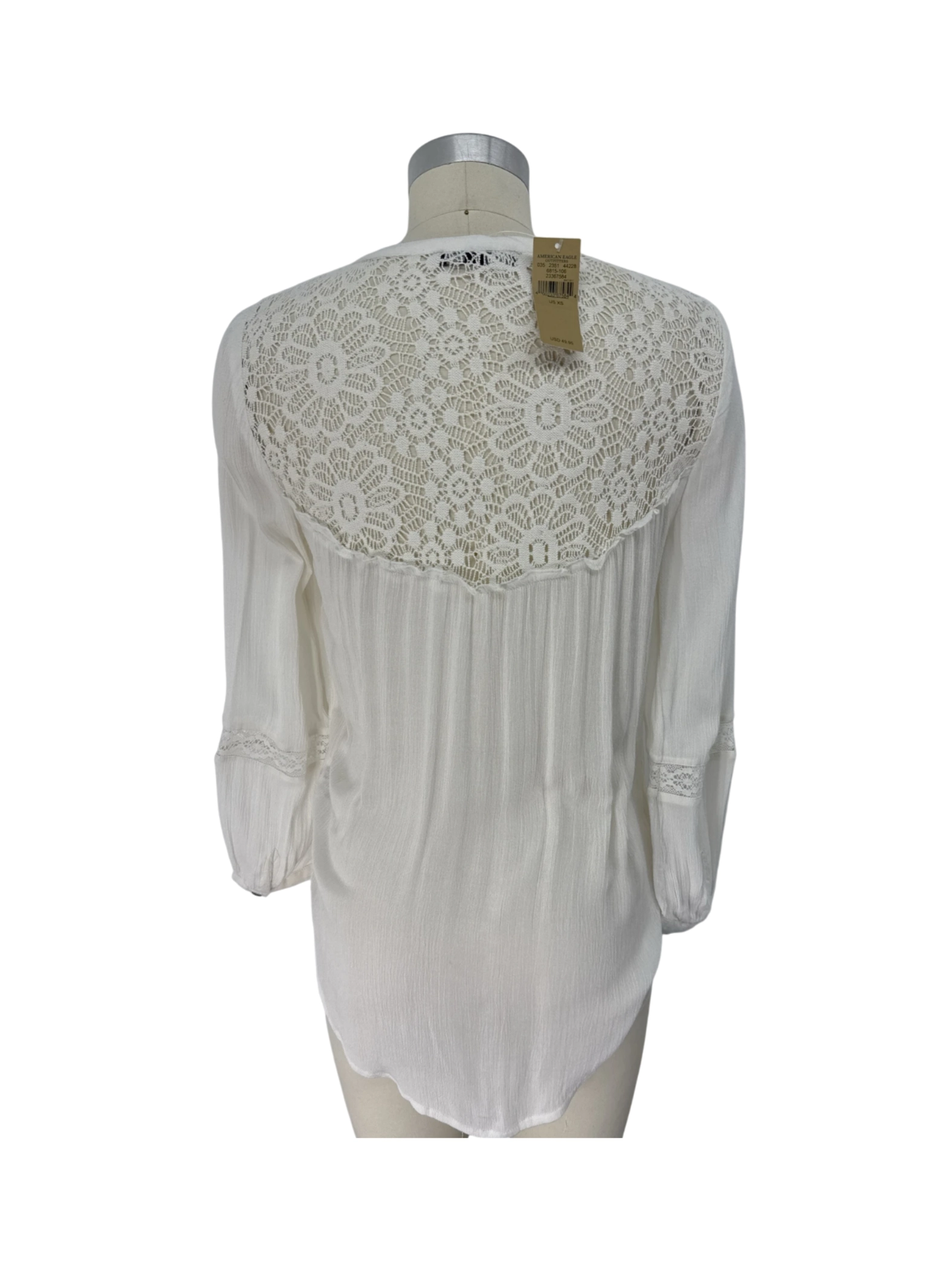 Elevate your wardrobe with this pre-owned American Eagle Outfitters blouse. This stylish top features a delicate white lace detailing, perfect for a breezy summer or spring look. The blouse is designed with ¾ sleeves and a flattering round neckline, offering a versatile addition to any outfit. Made from a blend of viscose and nylon, this top ensures comfort and durability. A perfect piece for casual outings or dressed-up occasions.