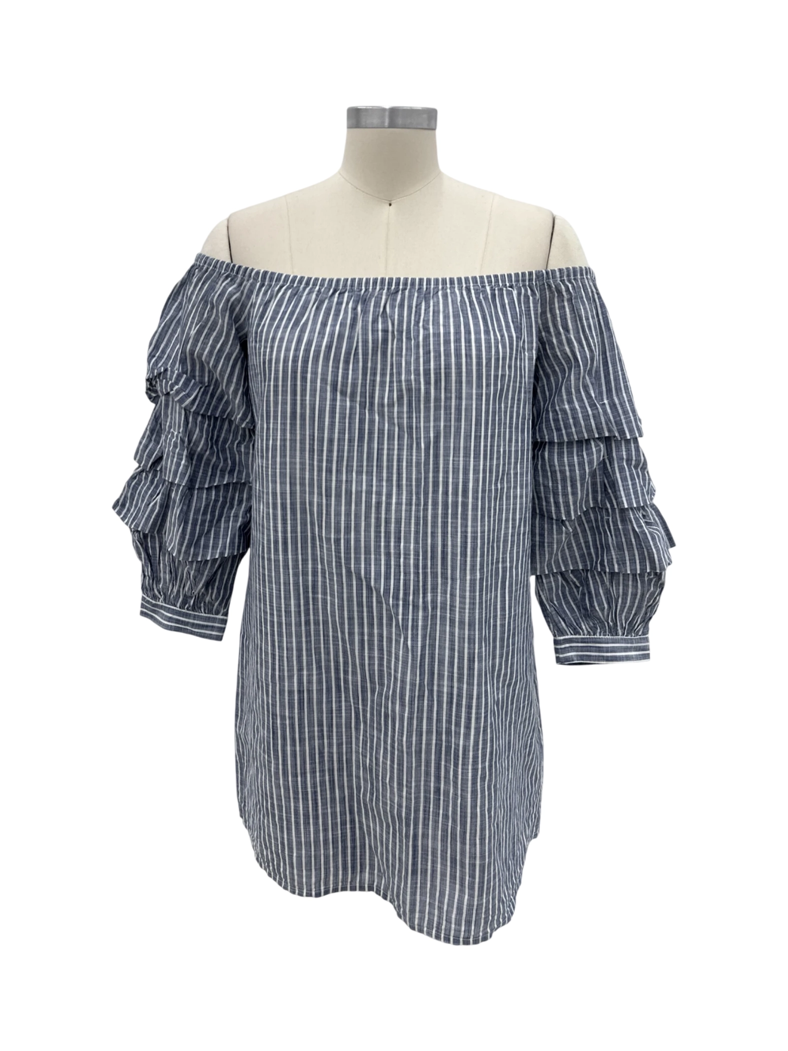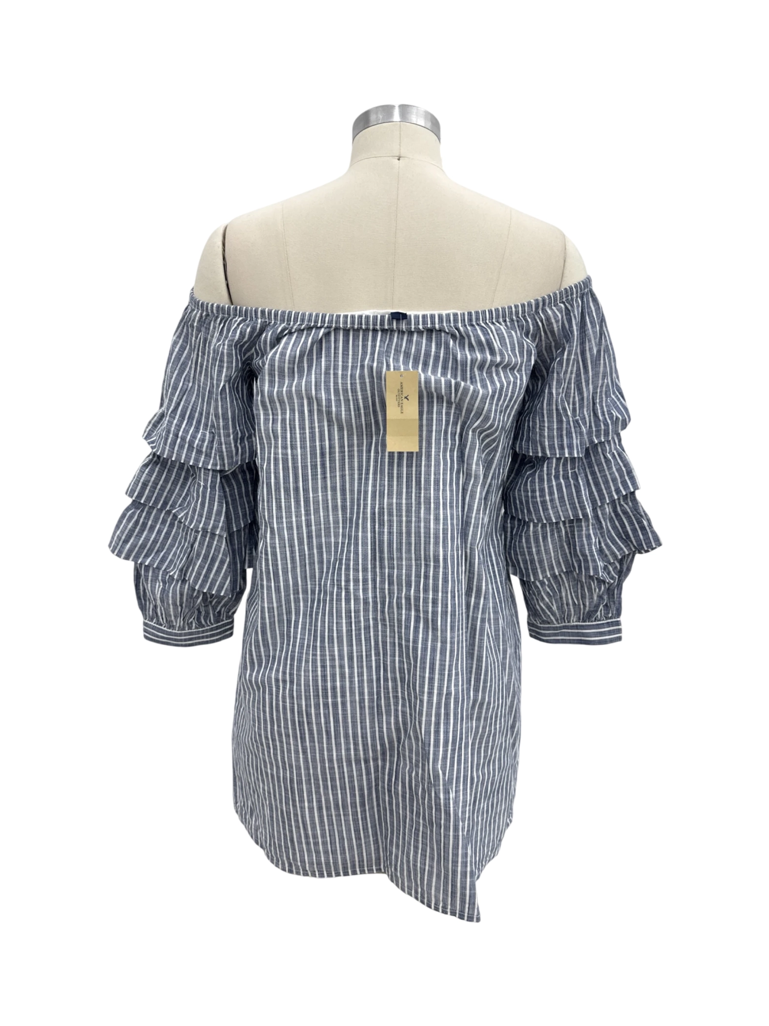 This stylish, pre-owned American Eagle Outfitters dress is perfect for a summer day. Featuring an off-the-shoulder neckline, mid-sleeves, and a flattering A-line silhouette. The dress is made from 100% cotton, and the striped pattern adds a touch of charm. Ideal for a casual outing, this dress is comfortable and fashionable. Pair it with sandals or sneakers for a complete look.