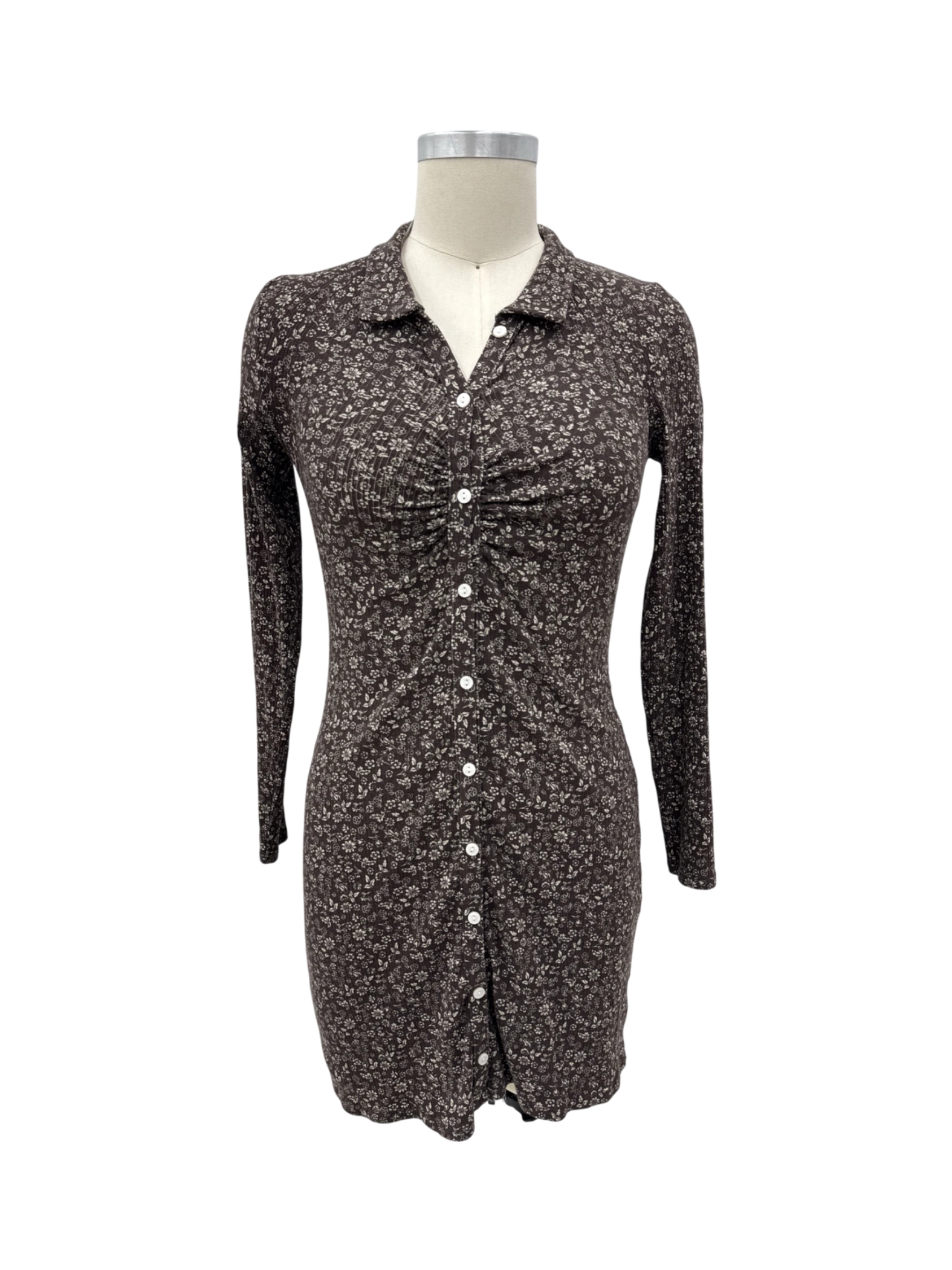 This used American Eagle dress is a stylish addition to any wardrobe. Crafted from a soft cotton blend, this A-line, bodycon dress features a beautiful floral pattern in shades of brown. It offers a comfortable fit with long sleeves and a mini skirt length. Perfect for casual outings in the spring and fall seasons. The dress combines both style and comfort, making it a versatile piece for your everyday wear.