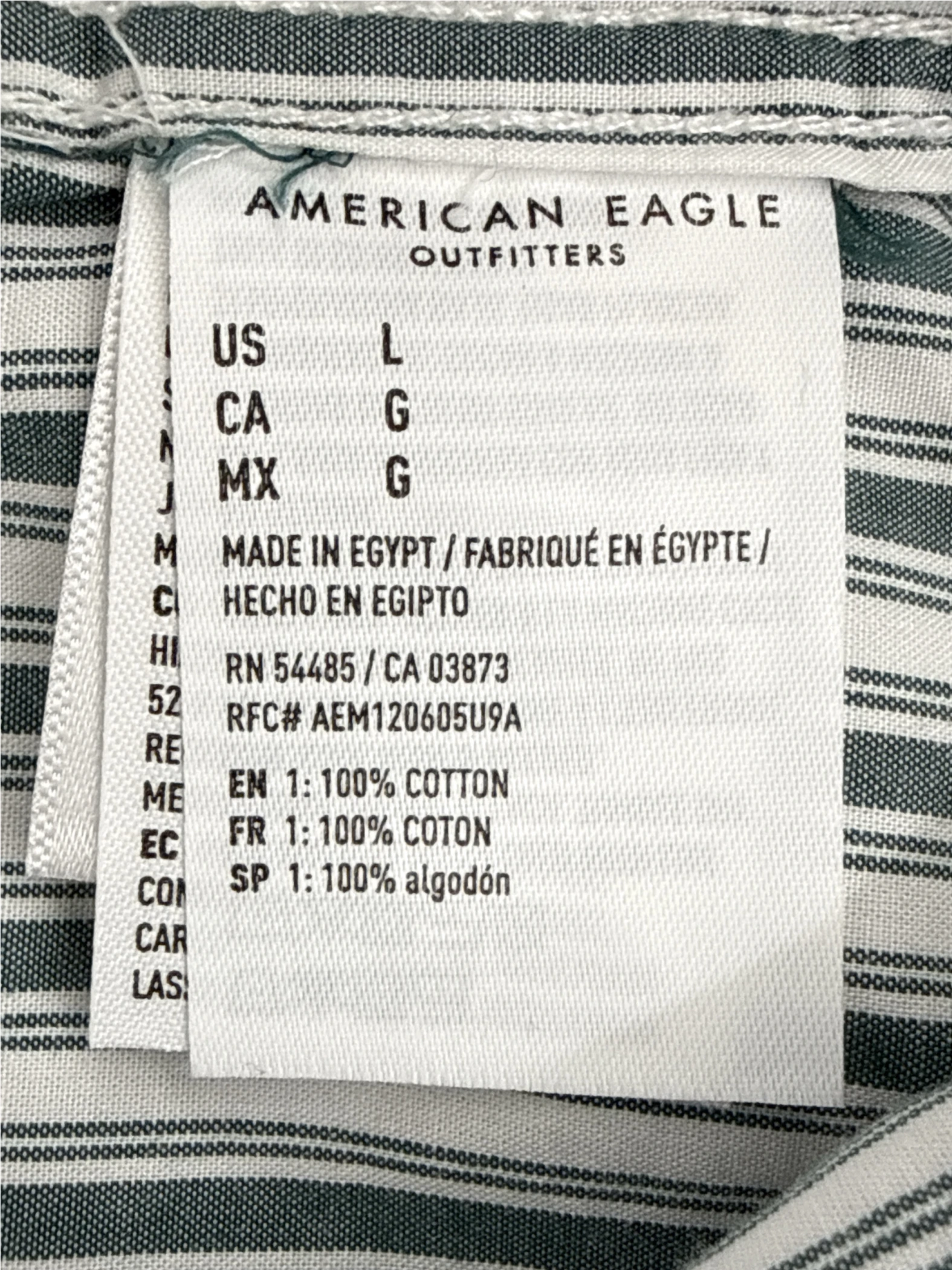 This pre-owned American Eagle men's short-sleeve shirt is a stylish and versatile addition to any wardrobe. Featuring a classic striped pattern, this shirt is perfect for casual or semi-formal occasions. Made from 100% cotton, it offers comfort and breathability. The button-up closure and collared neckline add a touch of sophistication. This relaxed fit shirt is ideal for warmer weather, making it a great choice for summer outings. A timeless and comfortable garment, suitable for any casual setting.