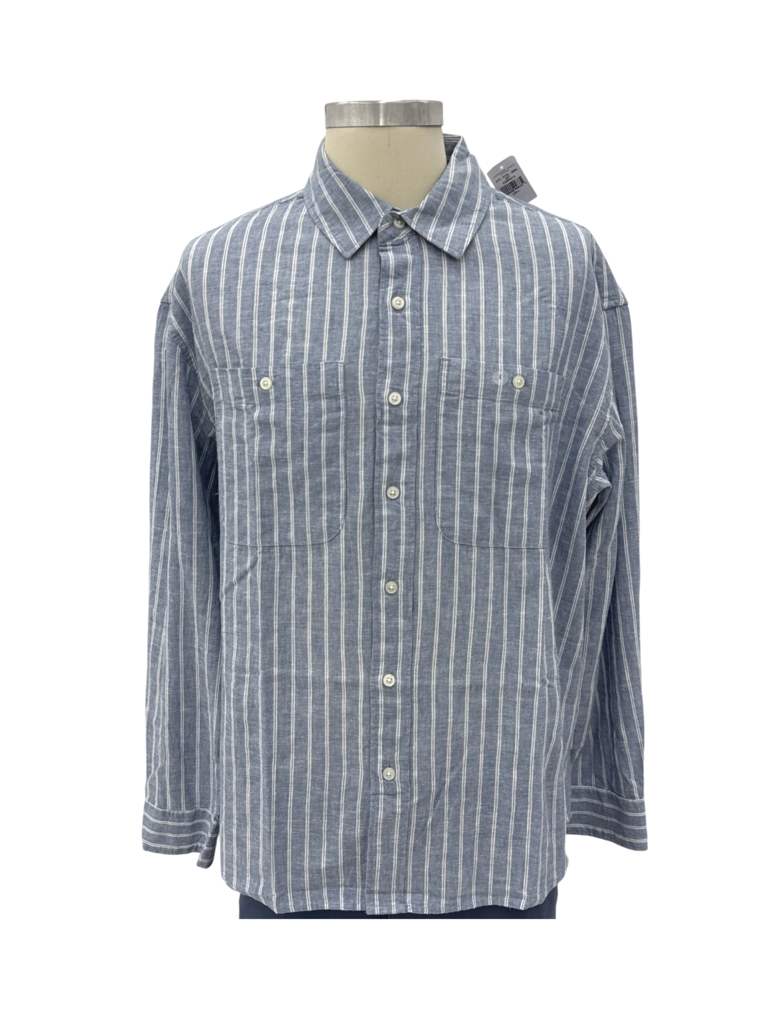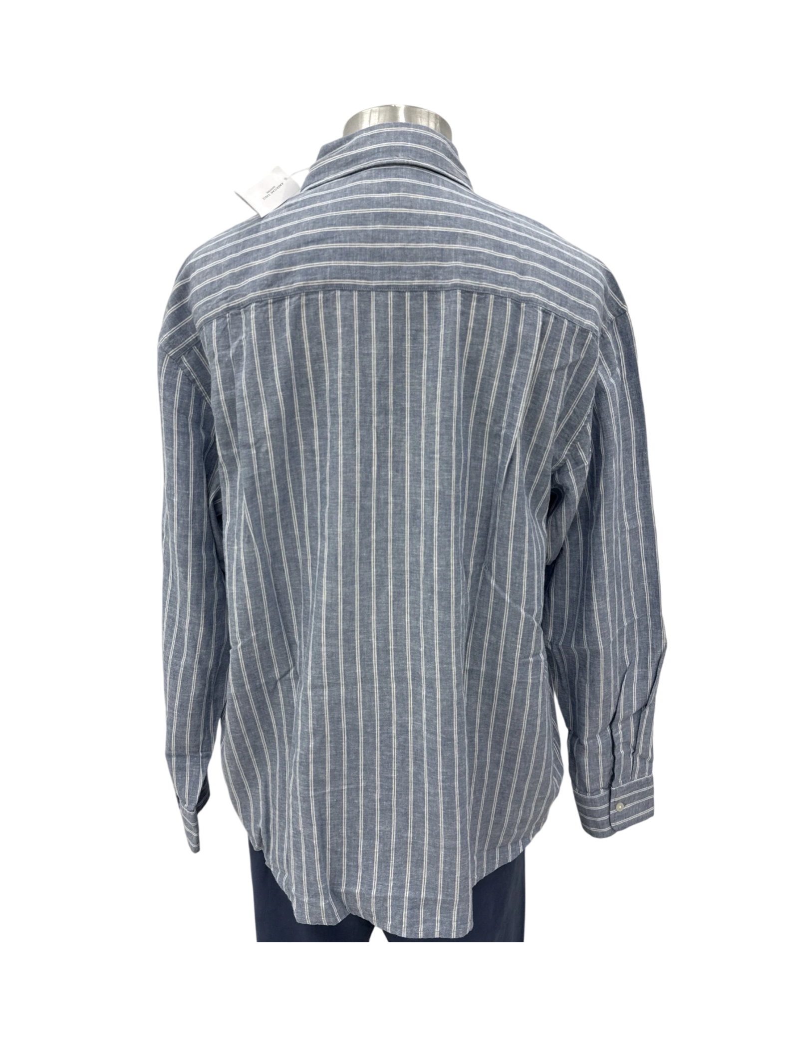Elevate your casual wardrobe with this stylish pre-owned American Eagle long sleeve shirt. This shirt features a classic button-up design, collared neckline, and is crafted from a comfortable linen blend. The blue and white striped pattern adds a touch of sophistication, making it perfect for various occasions. This relaxed-fit shirt is in excellent condition and is ideal for layering or wearing on its own. A must-have for the fashion-conscious individual seeking both comfort and style.