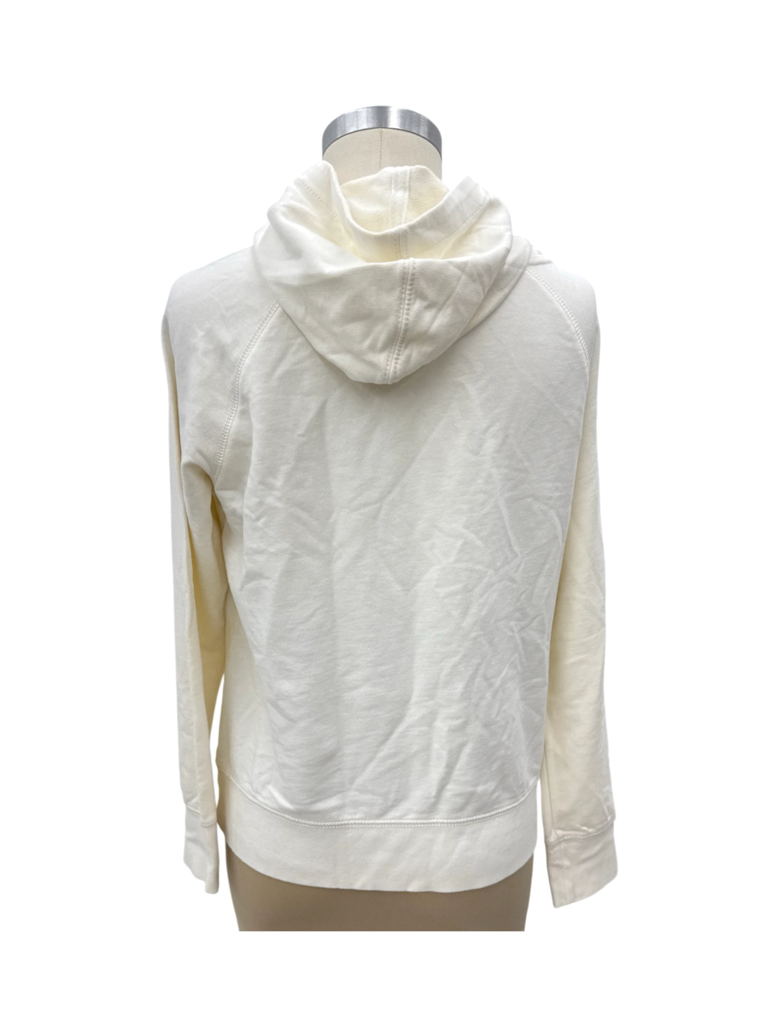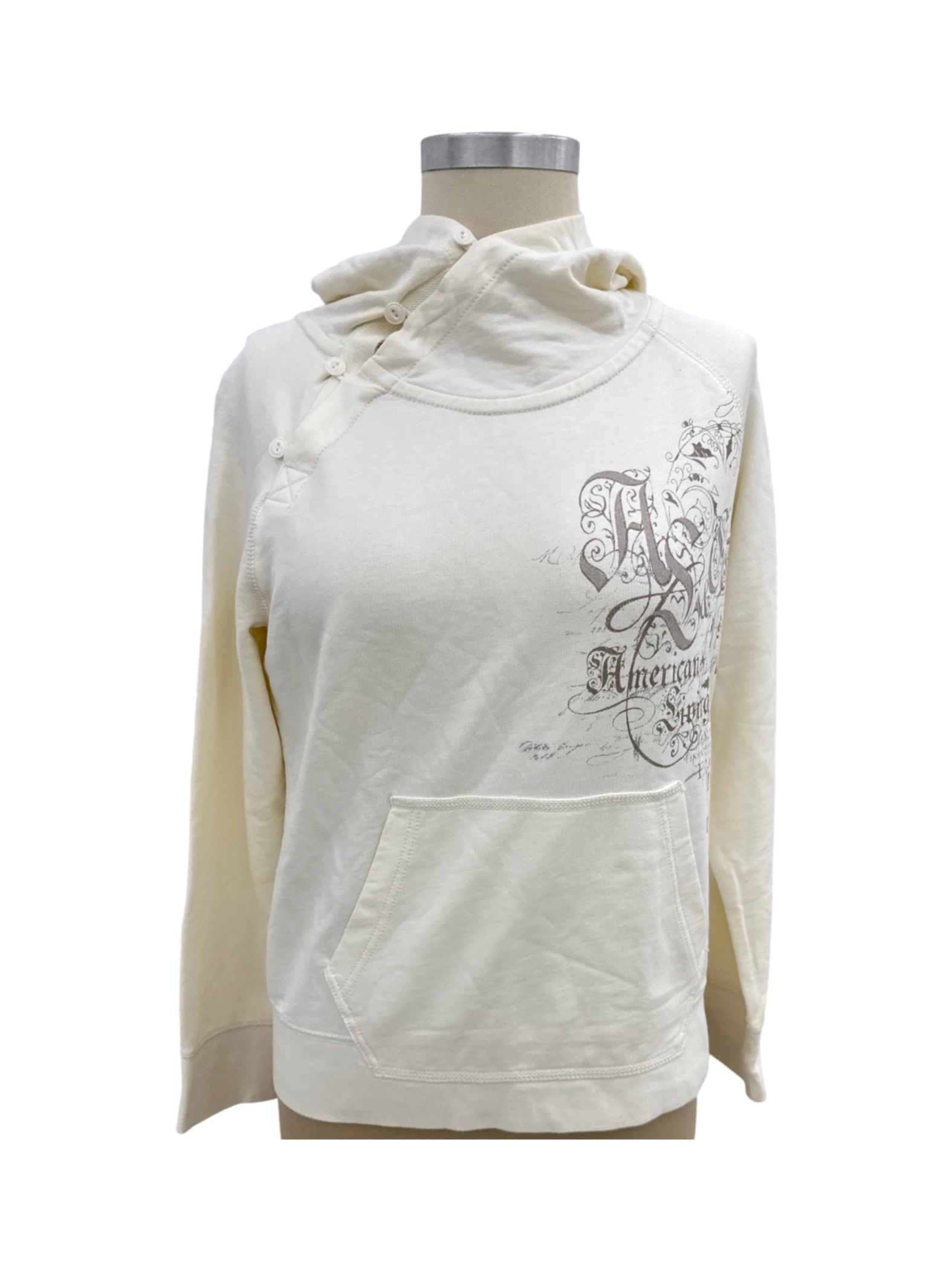 This pre-owned American Living hoodie is a stylish and comfortable addition to any wardrobe. Crafted from 100% cotton in a classic ivory color, this hoodie features a unique button-up design and a convenient kangaroo pocket. Perfect for layering, it's suitable for fall, winter, and spring. The graphic detailing adds a touch of personality. Ideal for casual wear, this American Living hoodie offers both comfort and style.