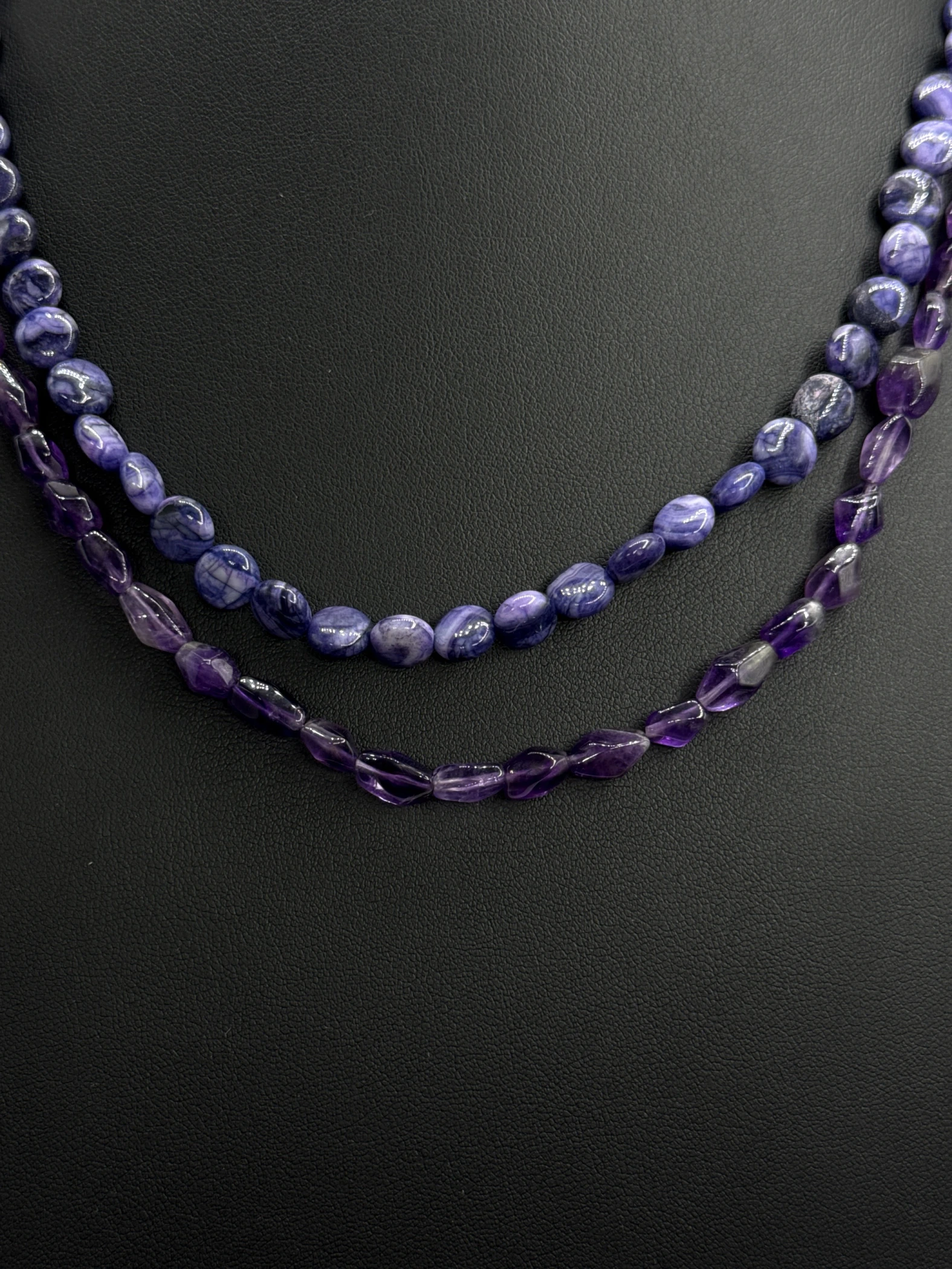 This is a 20-inch necklace made in the Chinese Art Deco style, featuring hand-carved amethyst beads on multiple strands.
