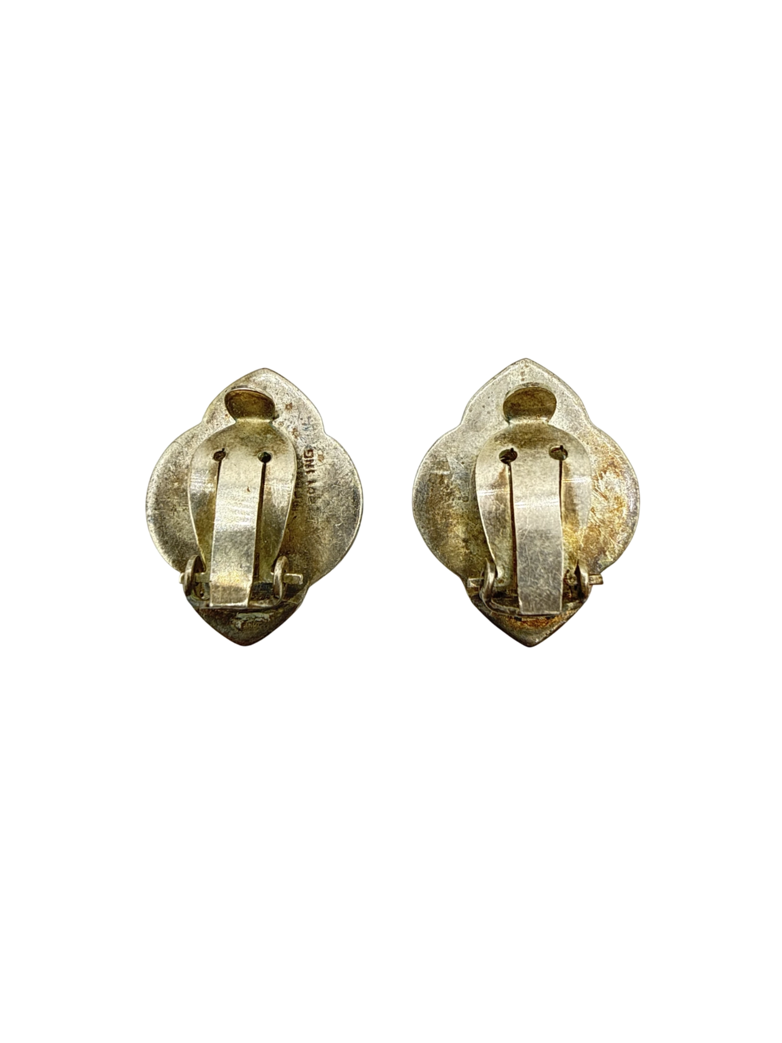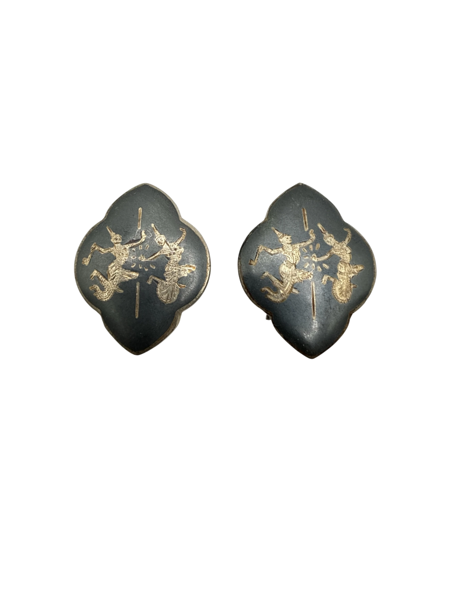 These vintage AMFARCO Sterling clip-on earrings showcase a unique design, made in Siam. The earrings are crafted from sterling silver and feature an intricate bronze-toned motif, adding a touch of vintage elegance. Perfect for women, these earrings are a unique addition to any jewelry collection, offering a blend of history and style. Their distinctive design and materials make them a standout accessory for any occasion.