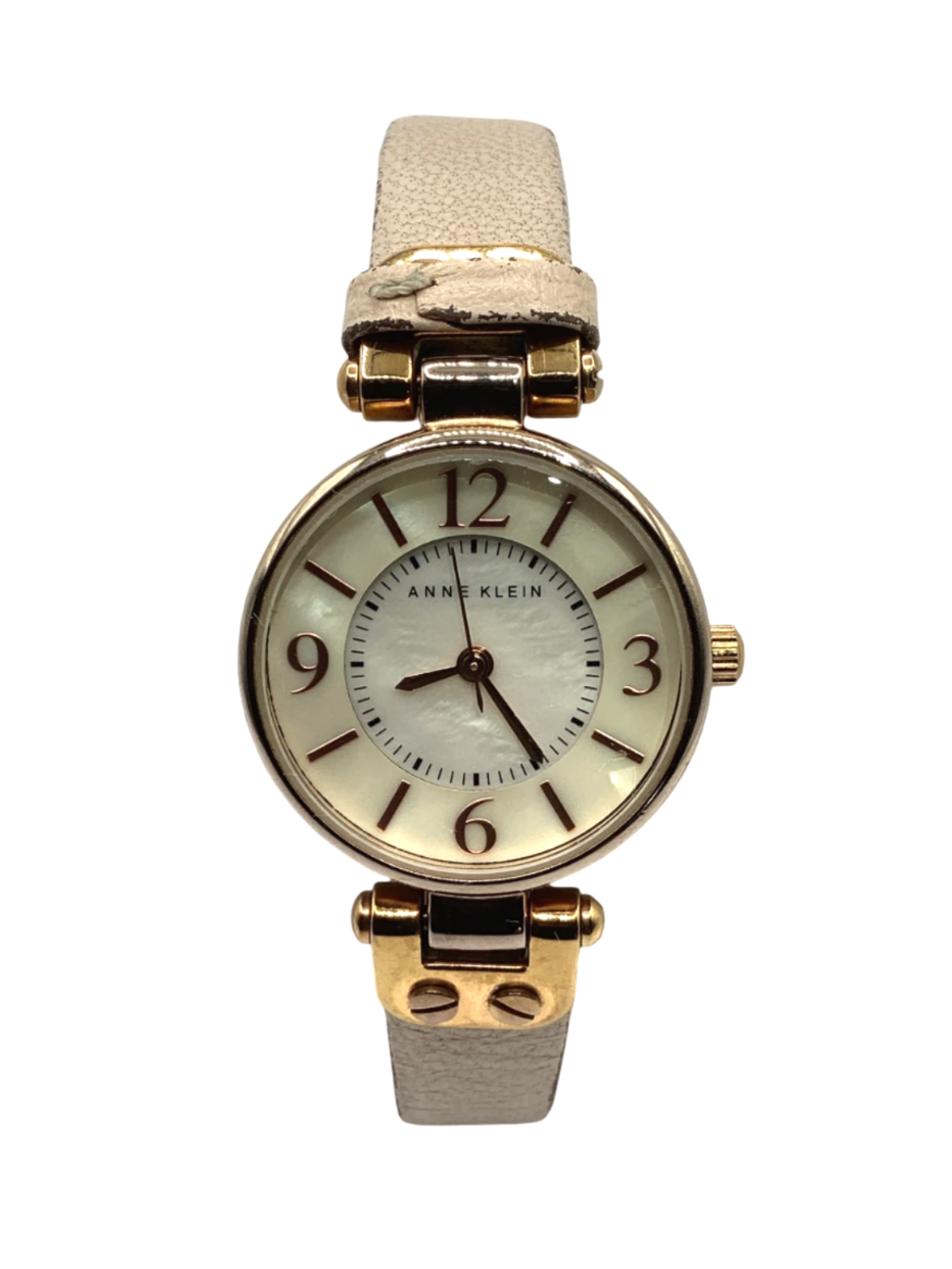 The women's watch by Anne Klein is beige with a gold tone.