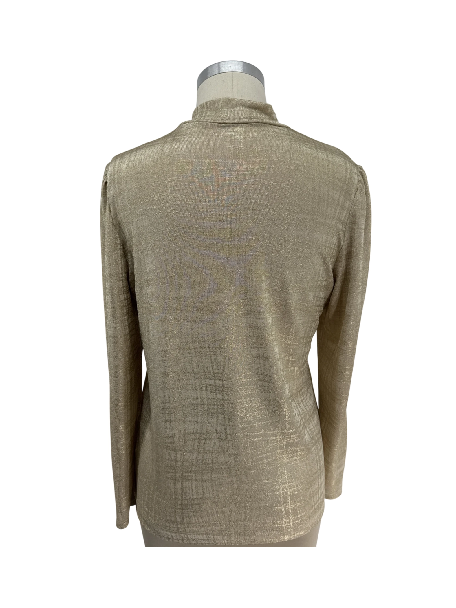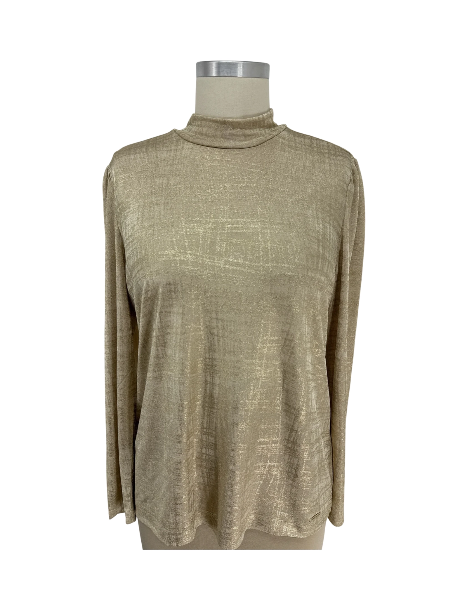 Elevate your wardrobe with this stylish pre-owned ANNE KLEIN top. This elegant top in a shimmering gold color is perfect for adding a touch of sophistication to any outfit. Featuring a mock neck and long sleeves, this piece is versatile and suitable for both casual and semi-formal occasions. Crafted from soft, comfortable polyester, this top offers a flattering fit and a luxurious feel. A must-have addition to your collection!