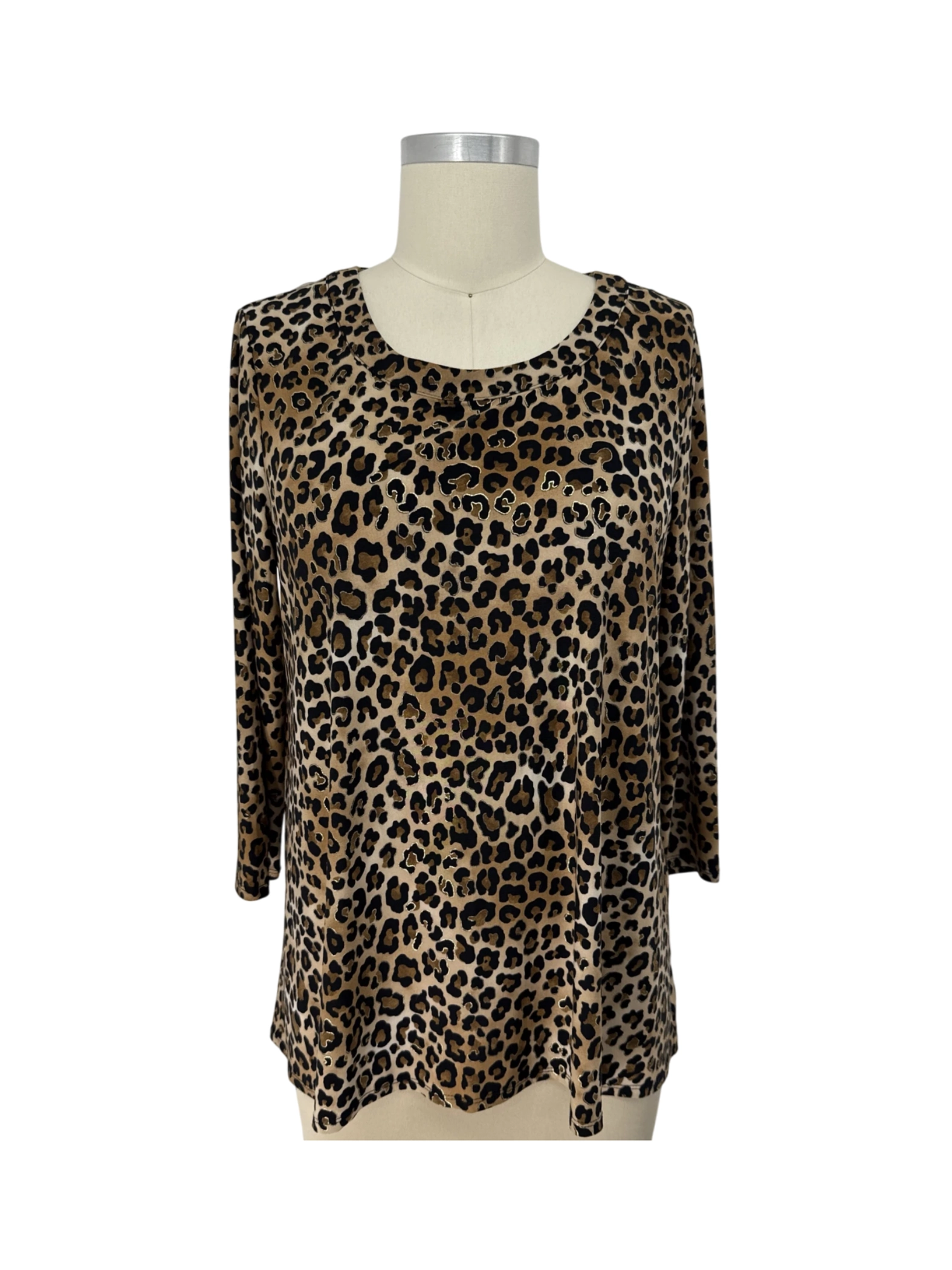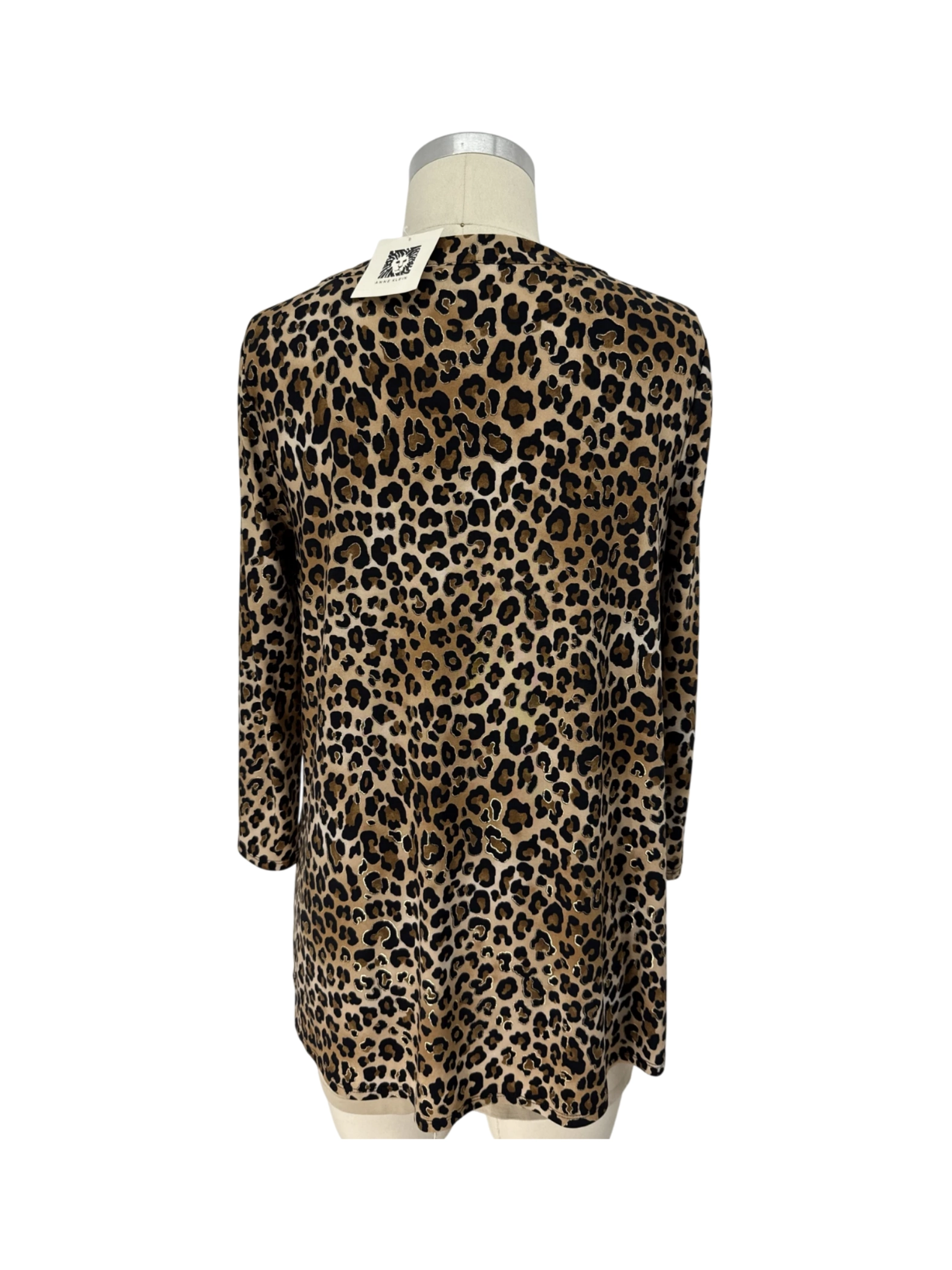 Elevate your wardrobe with this pre-owned ANNE KLEIN top. This stylish tunic features a trendy animal print pattern, perfect for a bold fashion statement. Crafted from a comfortable polyester and spandex blend, it offers a flattering fit with its round neck and 3/4 sleeves. This versatile top is perfect for the fall and winter seasons, offering both style and comfort for any occasion. Great condition, ready to wear!