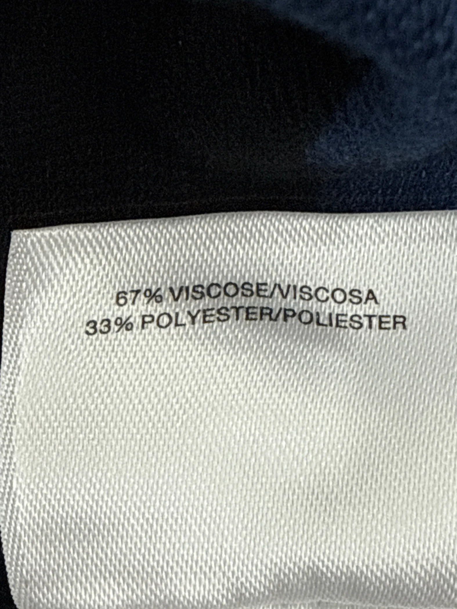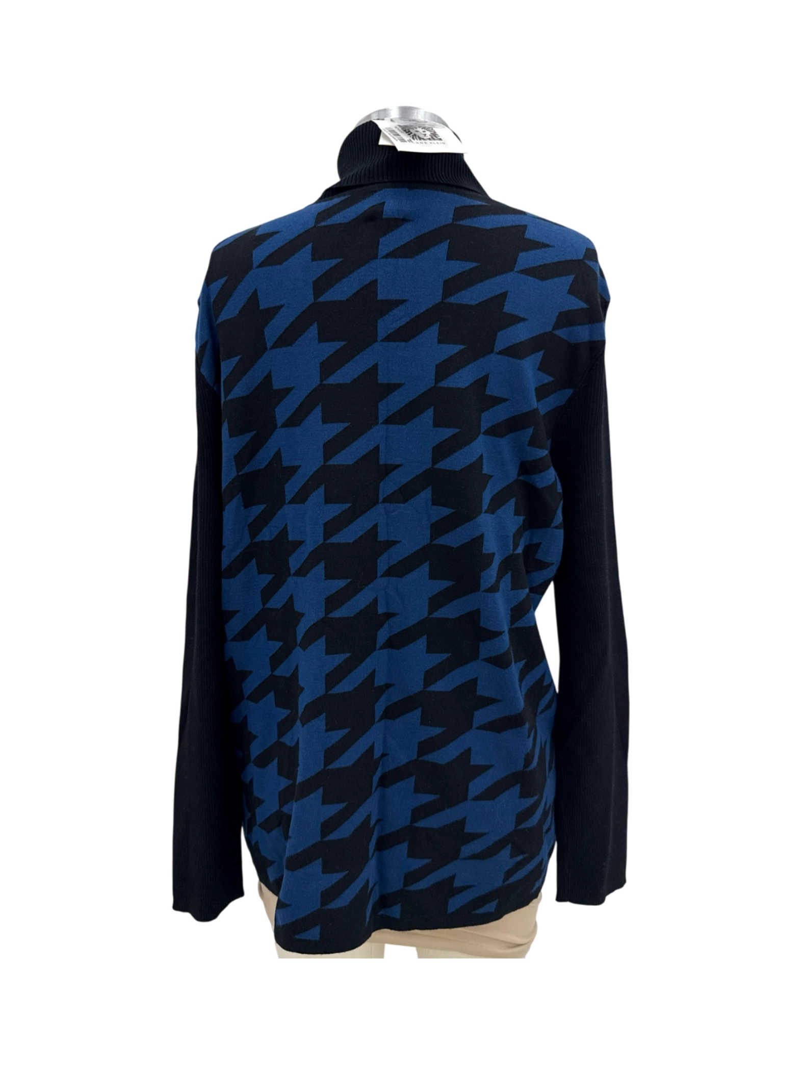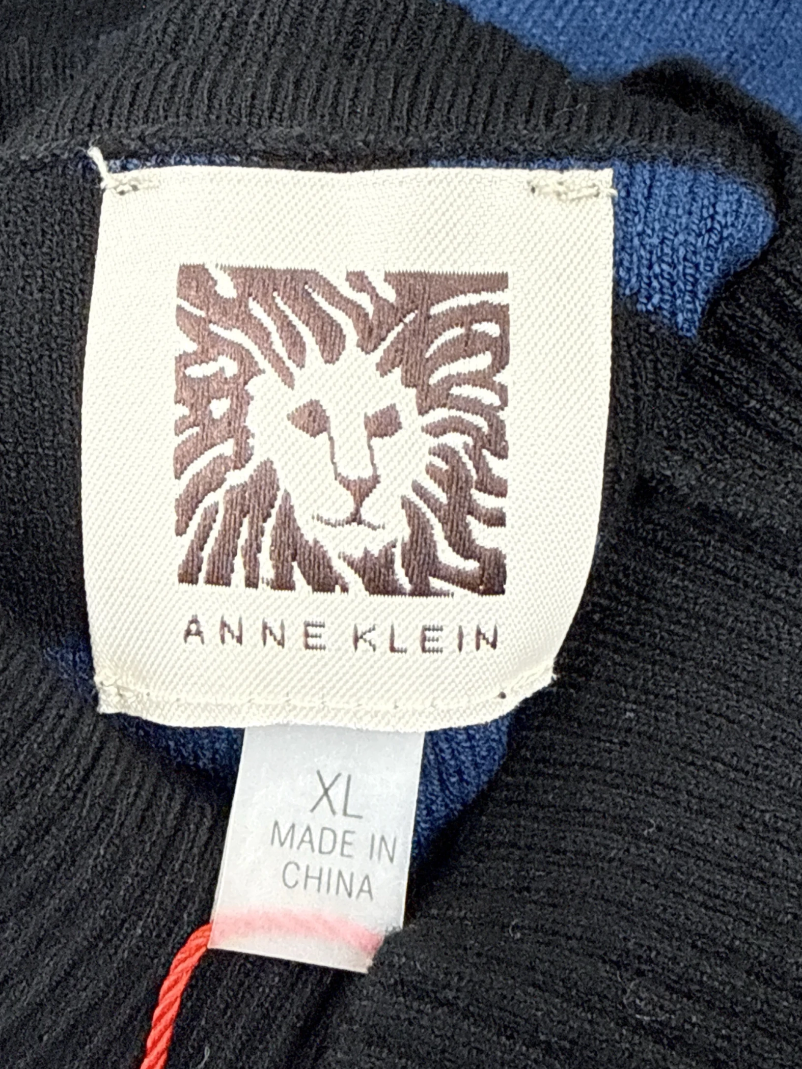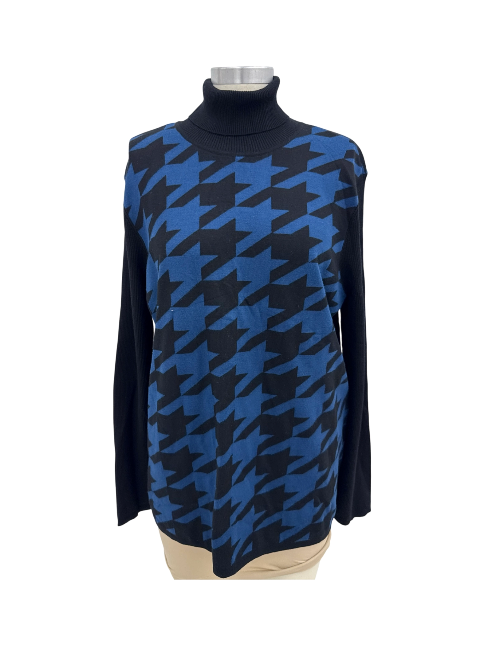 Elevate your cold-weather wardrobe with this stylish pre-owned ANNE KLEIN sweater. Featuring a bold geometric pattern in black and blue, this turtleneck sweater is both chic and cozy. Crafted from a blend of viscose and polyester, it offers a comfortable fit. Perfect for casual wear, pair it with jeans or trousers for a fashionable look. This used sweater is in excellent condition and is a great value for its quality and style.