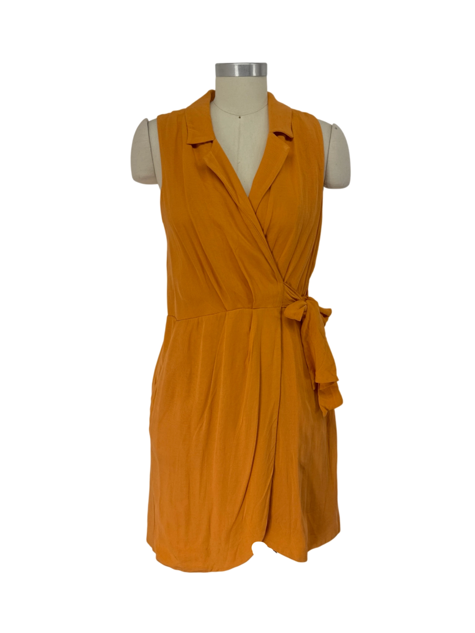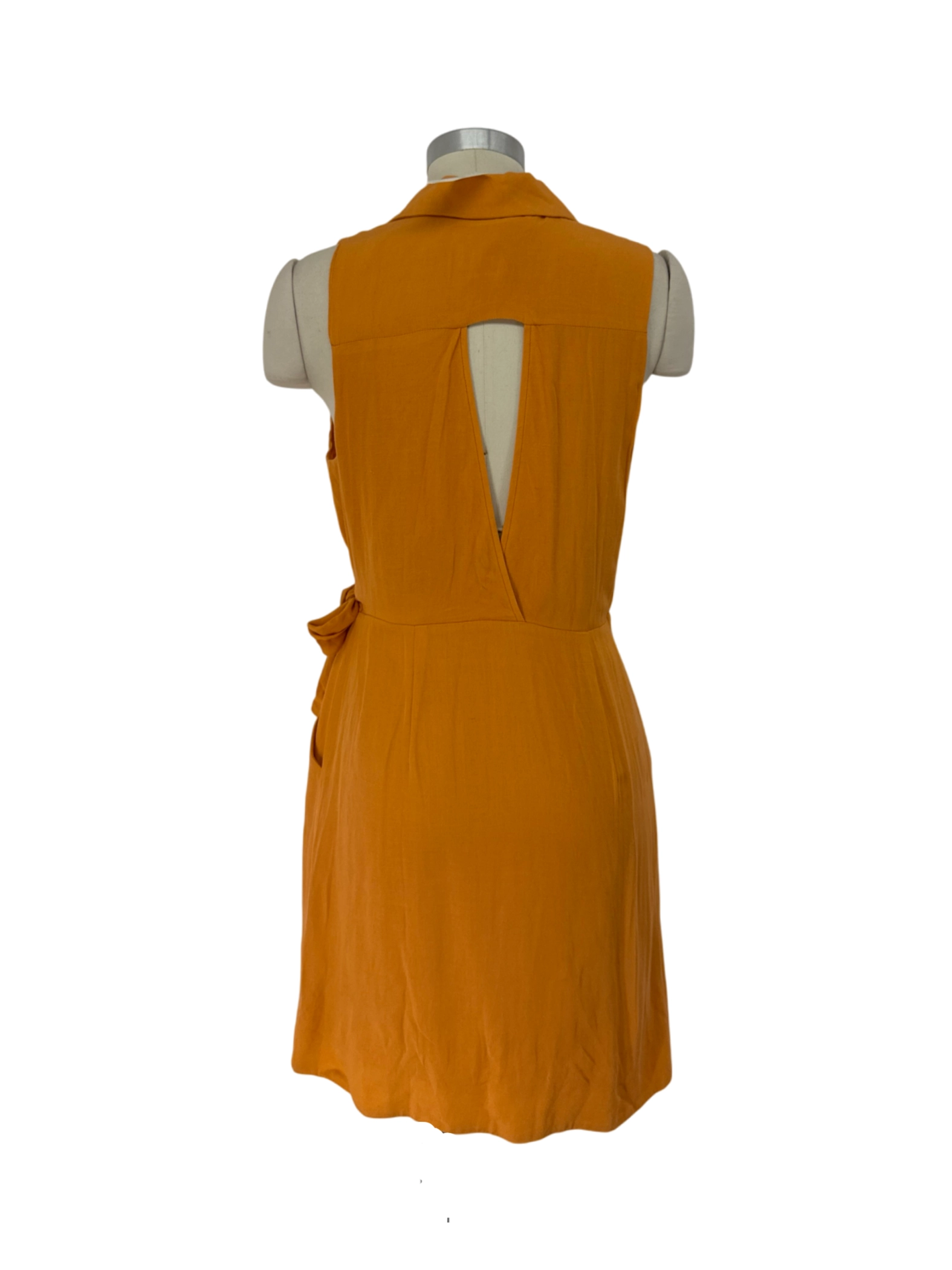 Elevate your summer wardrobe with this chic Anthropologie dress. This pre-owned, sleeveless dress features a flattering A-line silhouette and a vibrant orange hue, perfect for warm days. The dress has a collar neckline and a wrap style, adding a touch of elegance to the casual design. The dress is made of a comfortable material and is ideal for a day out or a casual evening. Embrace effortless style with this unique piece.
