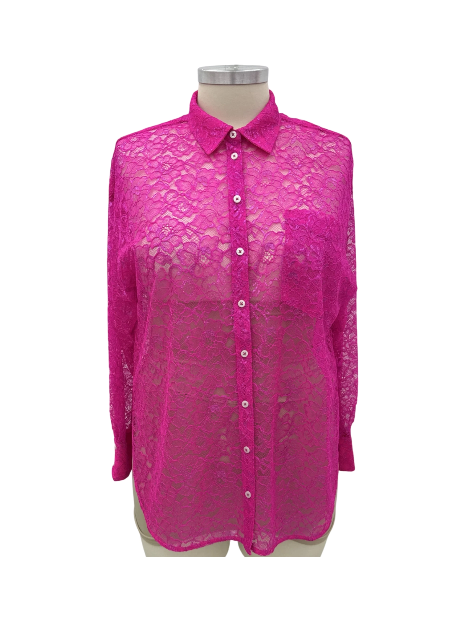 Embrace a touch of romance with this pre-owned Anthropologie lace button-up blouse, perfect for adding a pop of color to any outfit. This vibrant pink blouse, crafted from a delicate lace material, offers a flattering fit and a touch of sophistication. The classic button-up design and long sleeves make it versatile for both casual and dressy occasions. This beautiful blouse is perfect for a night out or any special occasion. A true wardrobe essential.