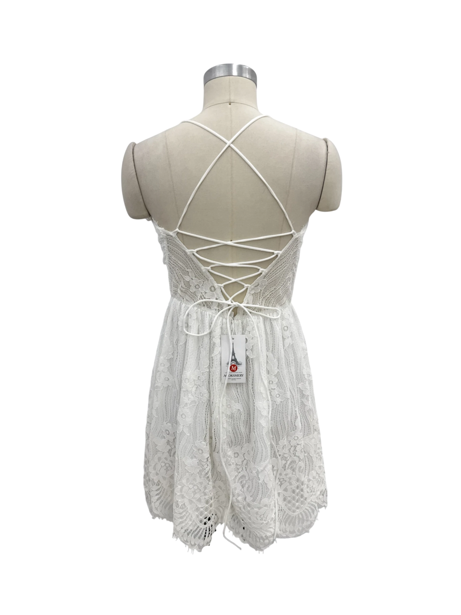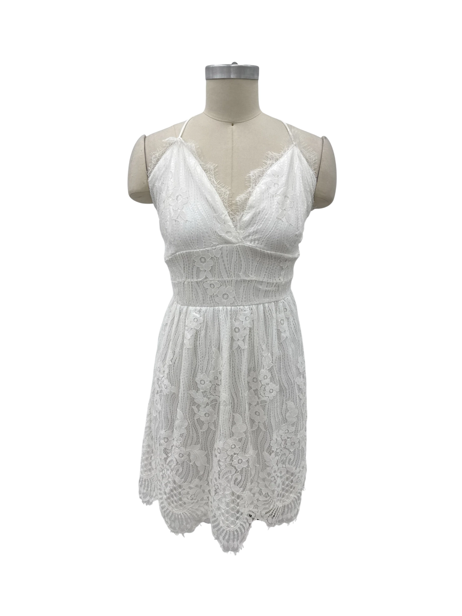 This beautiful, pre-owned Aooksmer dress is perfect for a summer day. Made from a soft blend of cotton and polyester, this dress offers comfort and style. The white floral lace design adds a touch of elegance, while the A-line silhouette flatters your figure. Featuring a V-neck and a mini skirt length, it's ideal for casual outings or a special occasion. With its sleeveless design, you'll stay cool and chic all day long.