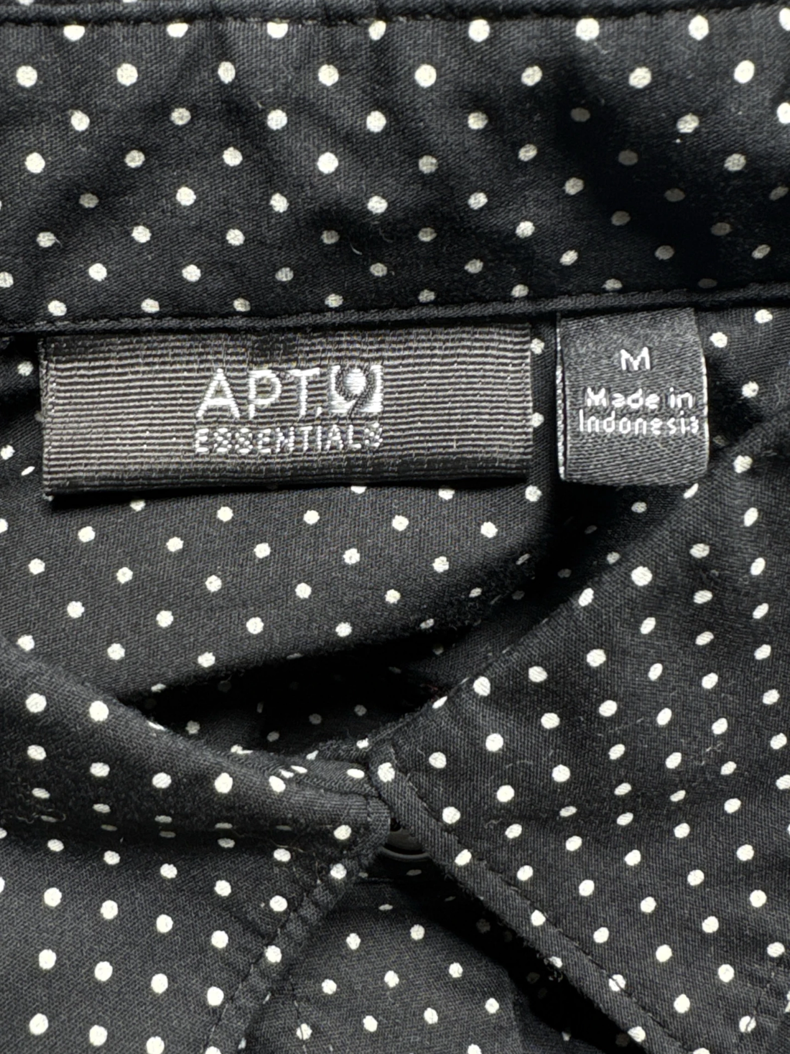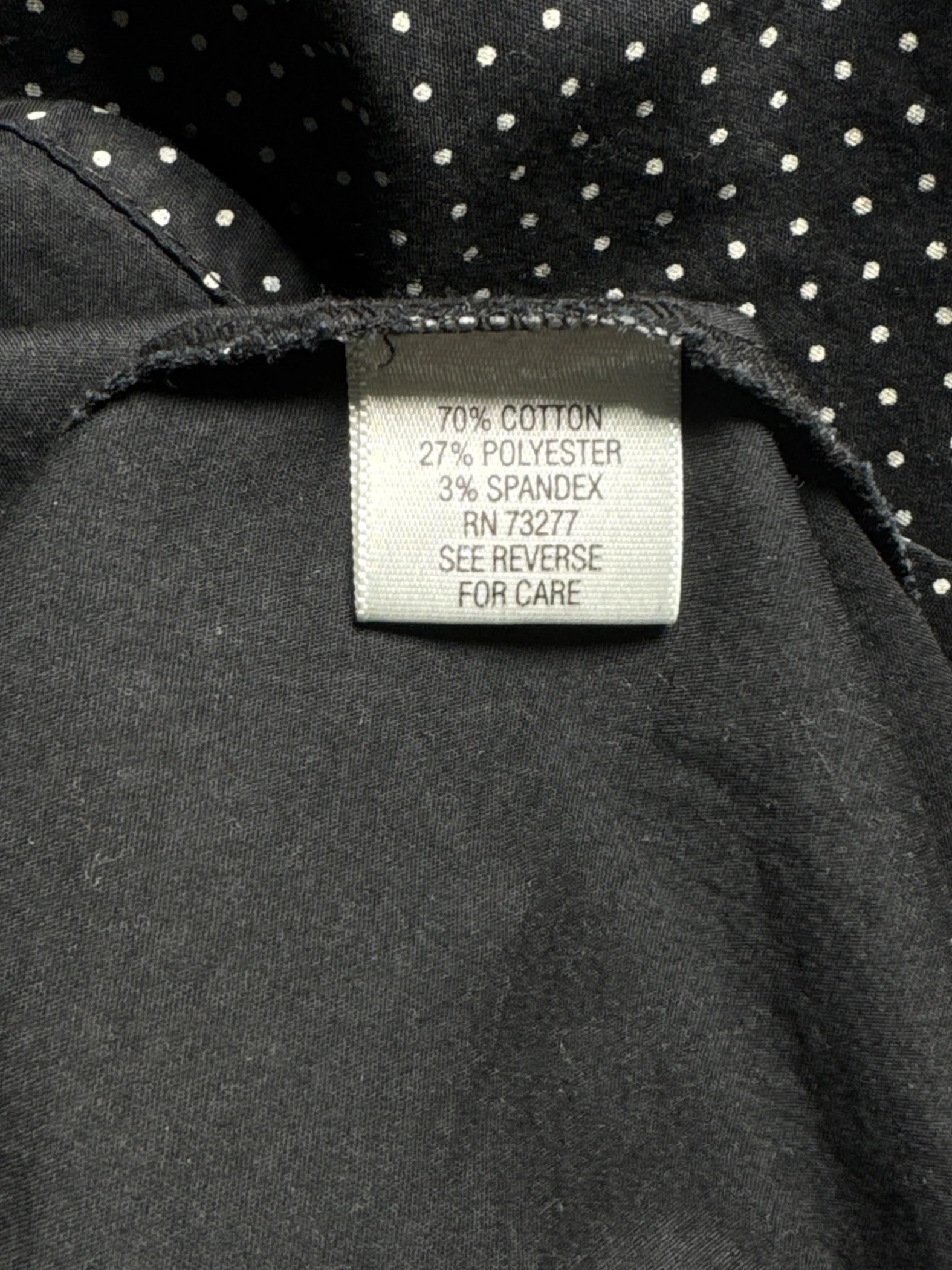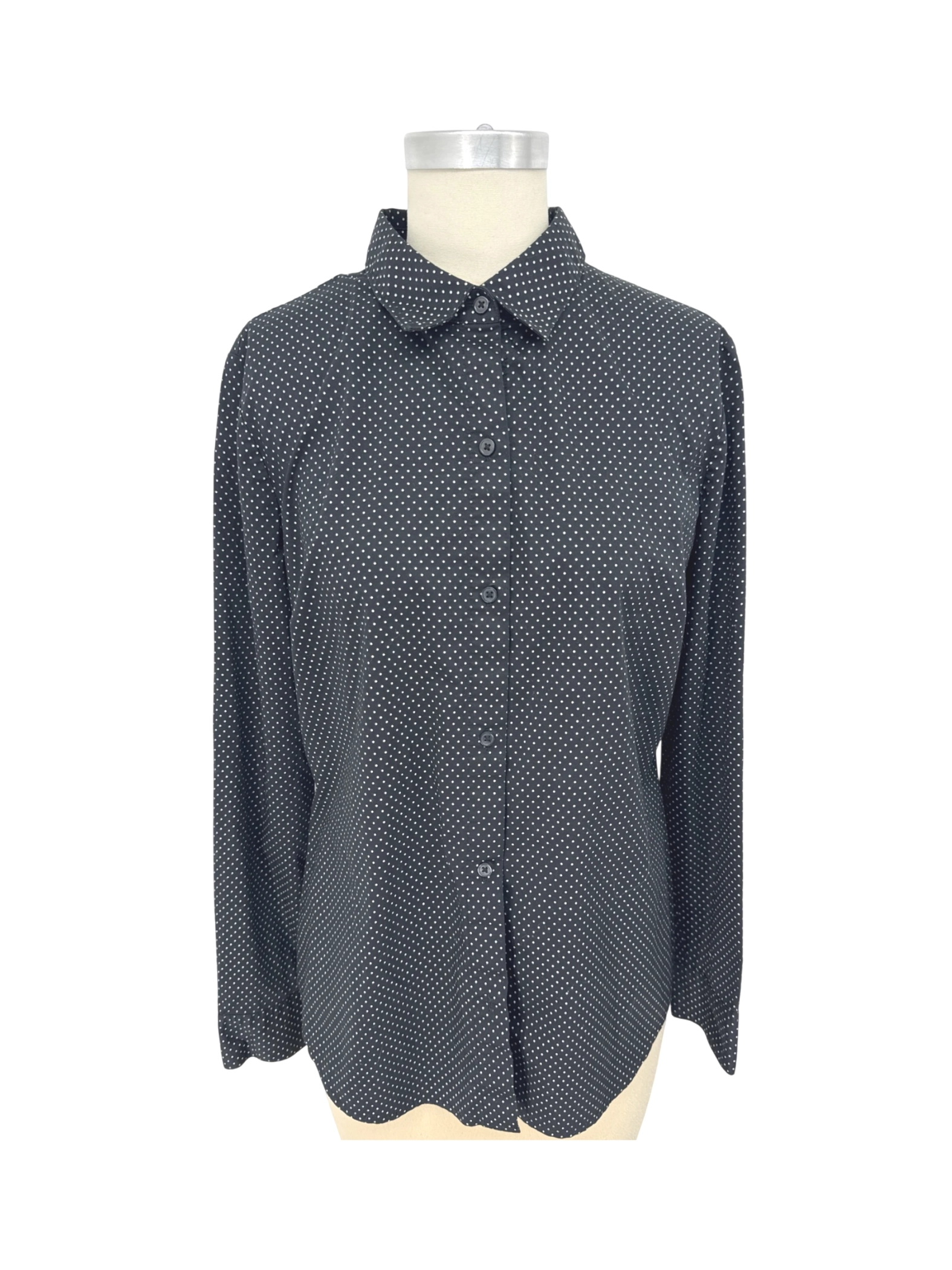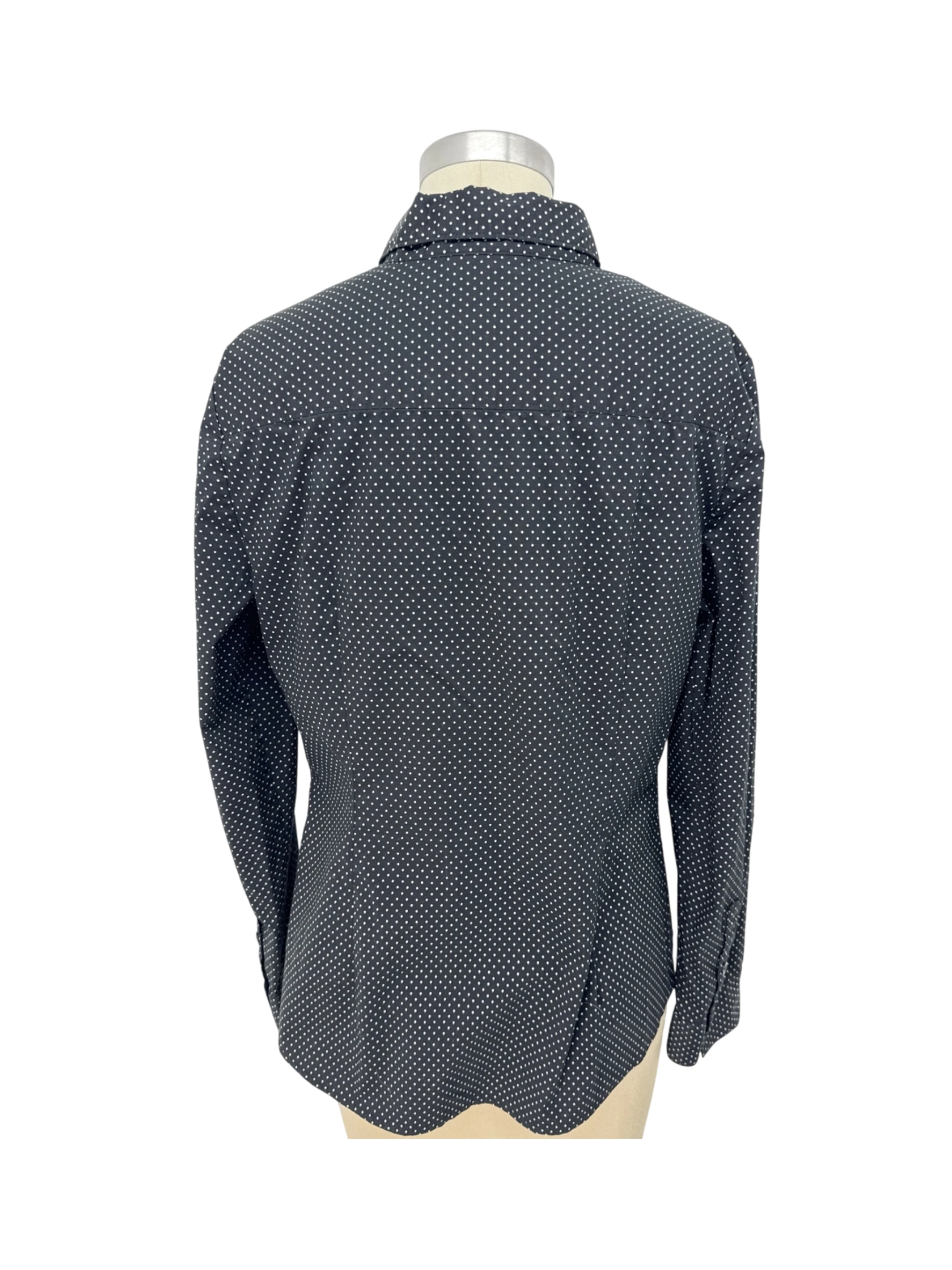 Elevate your wardrobe with this stylish APT 9 Essentials blouse. This pre-owned top features a classic polka dot pattern on a sleek black background, perfect for adding a touch of sophistication to any outfit. The blouse is crafted from a blend of cotton, polyester, and spandex, ensuring comfort and durability. With its timeless design and flattering fit, this blouse is a versatile addition to your collection.