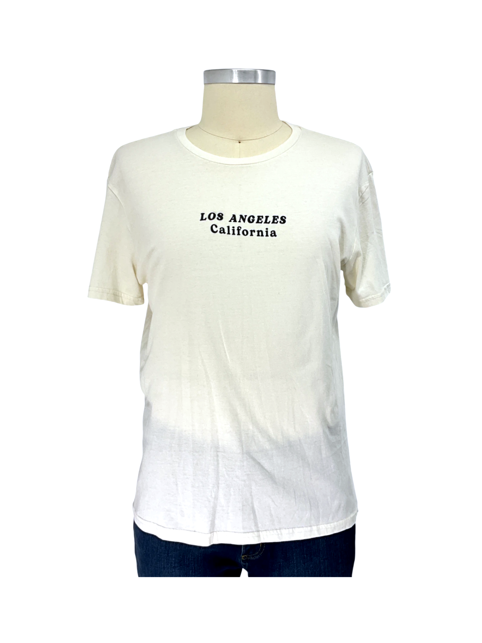 A short-sleeved, round-neck white T-shirt for men in size M.
