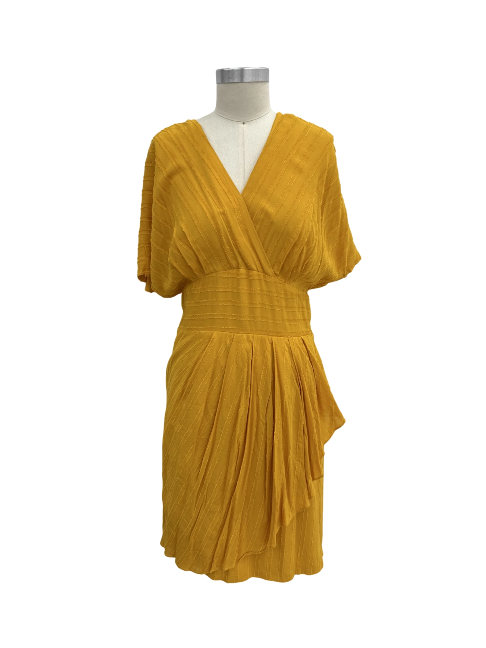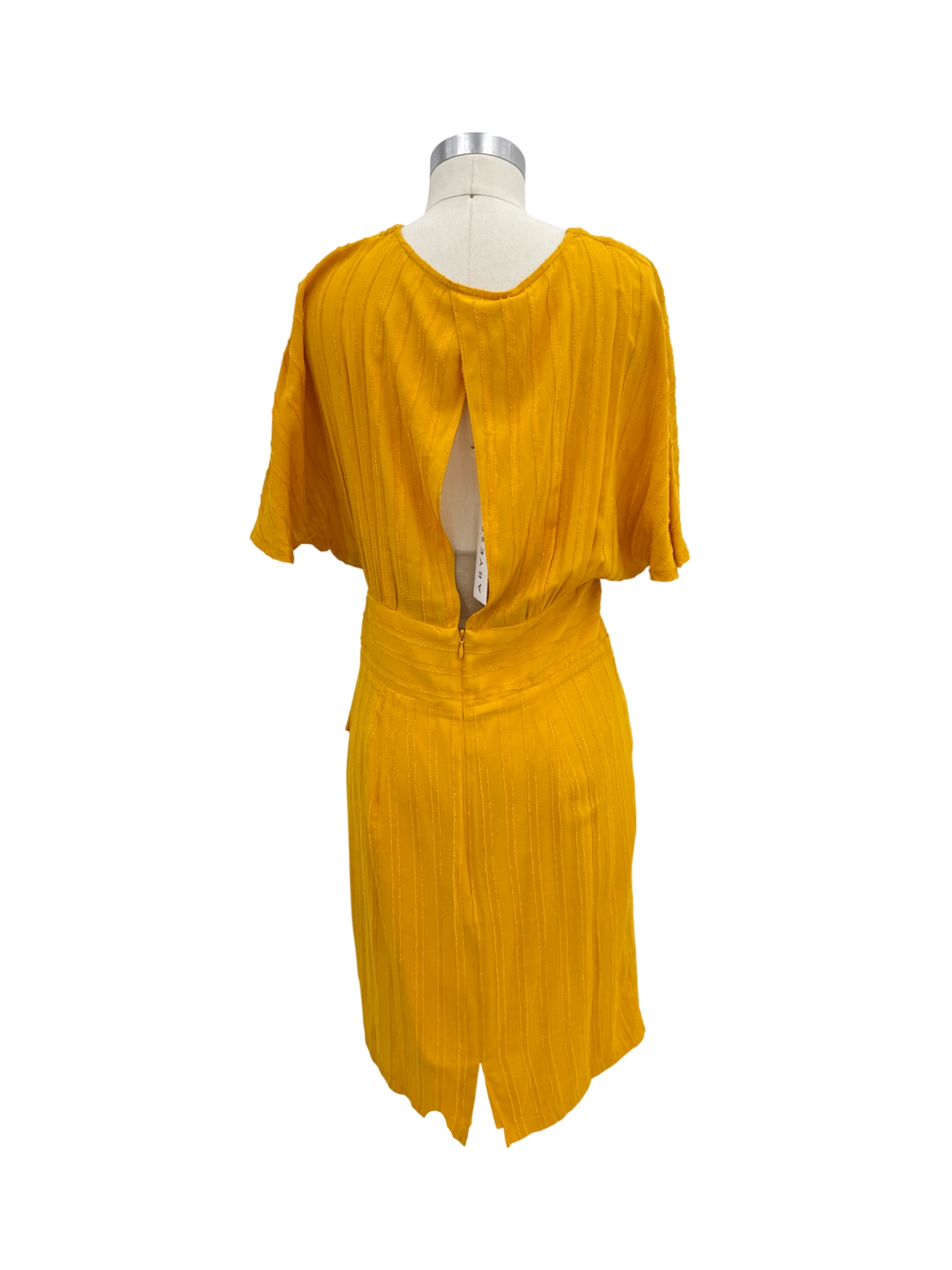 This vibrant pre-owned ARYESSA dress is perfect for warm weather occasions. Featuring a flattering A-line silhouette, this dress has a V-neck and short sleeves. Crafted from a blend of rayon and polyester, the dress boasts a beautiful yellow hue, making it a stylish choice. It is perfect for a casual outing or a cocktail party. Its design and midi skirt length add to its appeal. This dress offers both comfort and style.