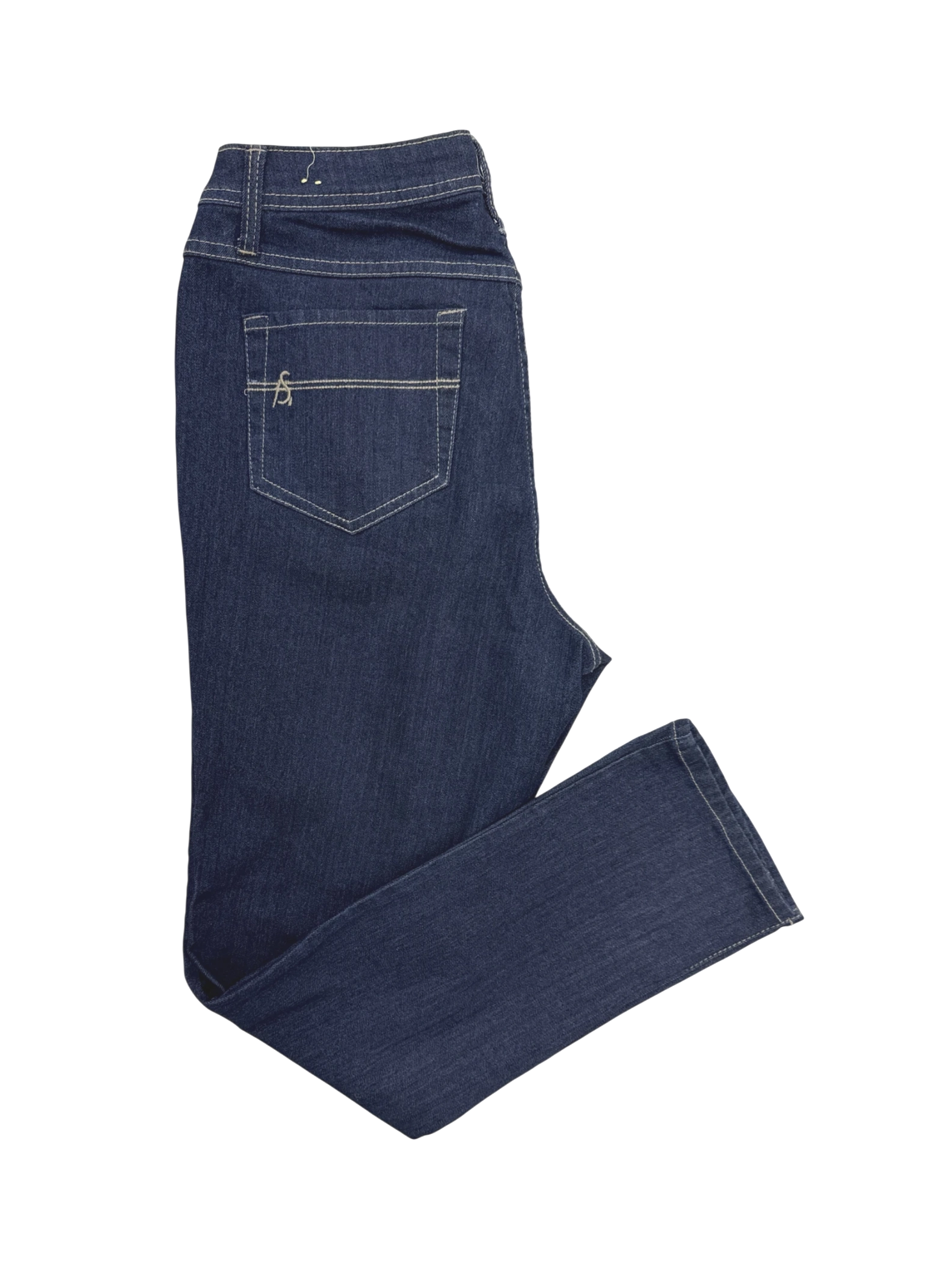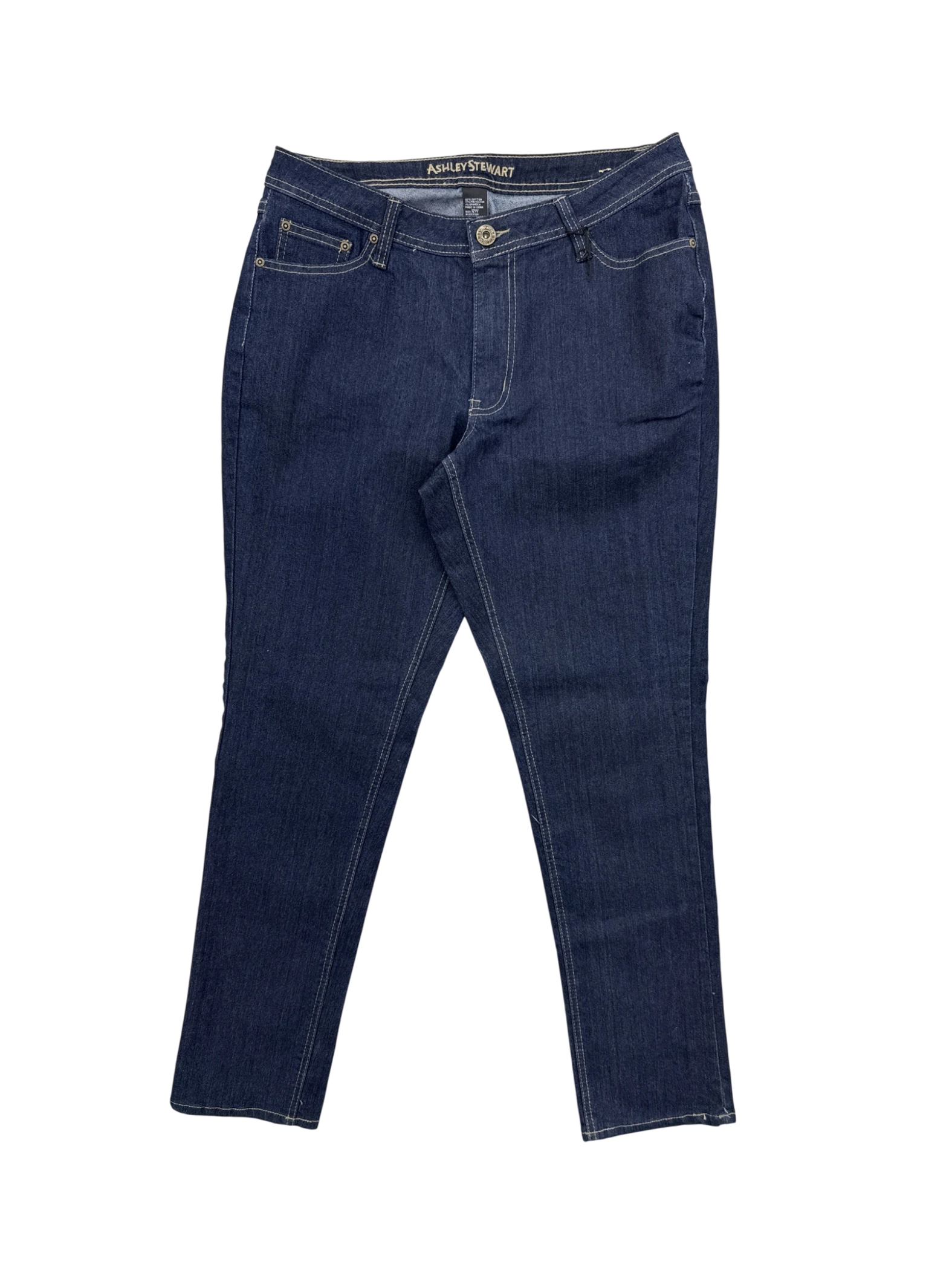 These pre-owned ASHLEY STEWART jeans offer a classic straight leg fit in a dark denim wash. Crafted from a comfortable cotton blend with a touch of spandex for stretch, these jeans provide a flattering silhouette. Perfect for everyday wear, these stylish jeans are a versatile addition to any wardrobe. Ideal for any season.