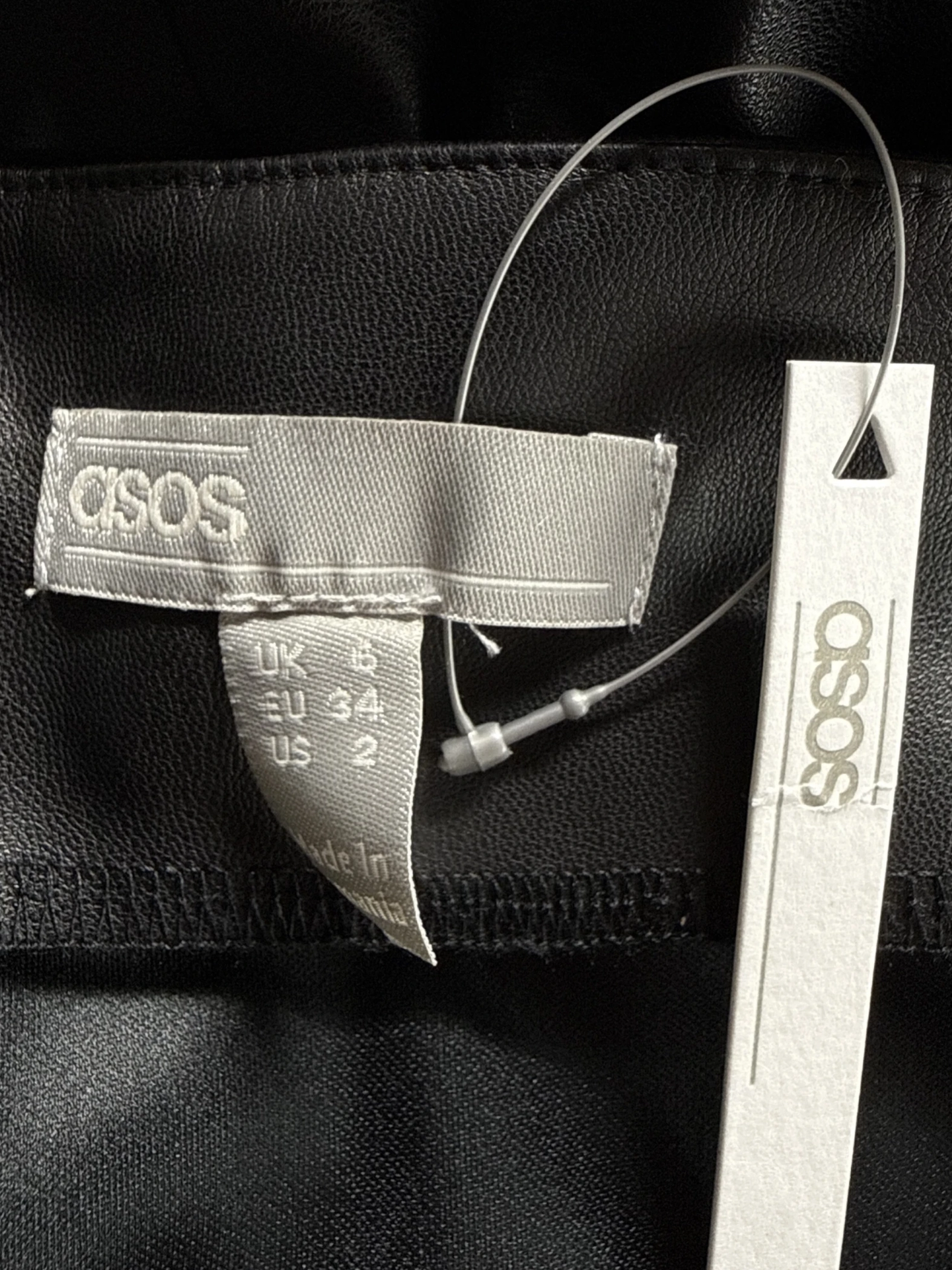 This stunning ASOS bodycon dress is the perfect statement piece for your next event. Crafted from high-quality faux leather, this dress features a flattering off-the-shoulder neckline and short sleeves. The dress hugs your curves in all the right places, creating a sleek and stylish silhouette. Its mini length adds a touch of playfulness, while the black color makes it a versatile addition to any wardrobe. Ideal for cocktail parties or a night out, this dress will turn heads.