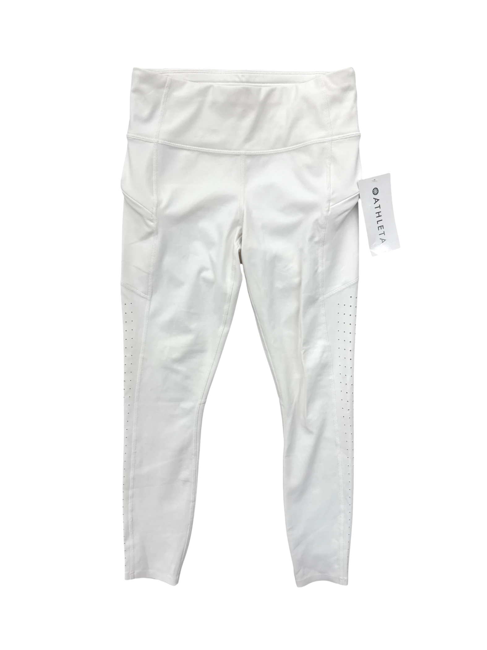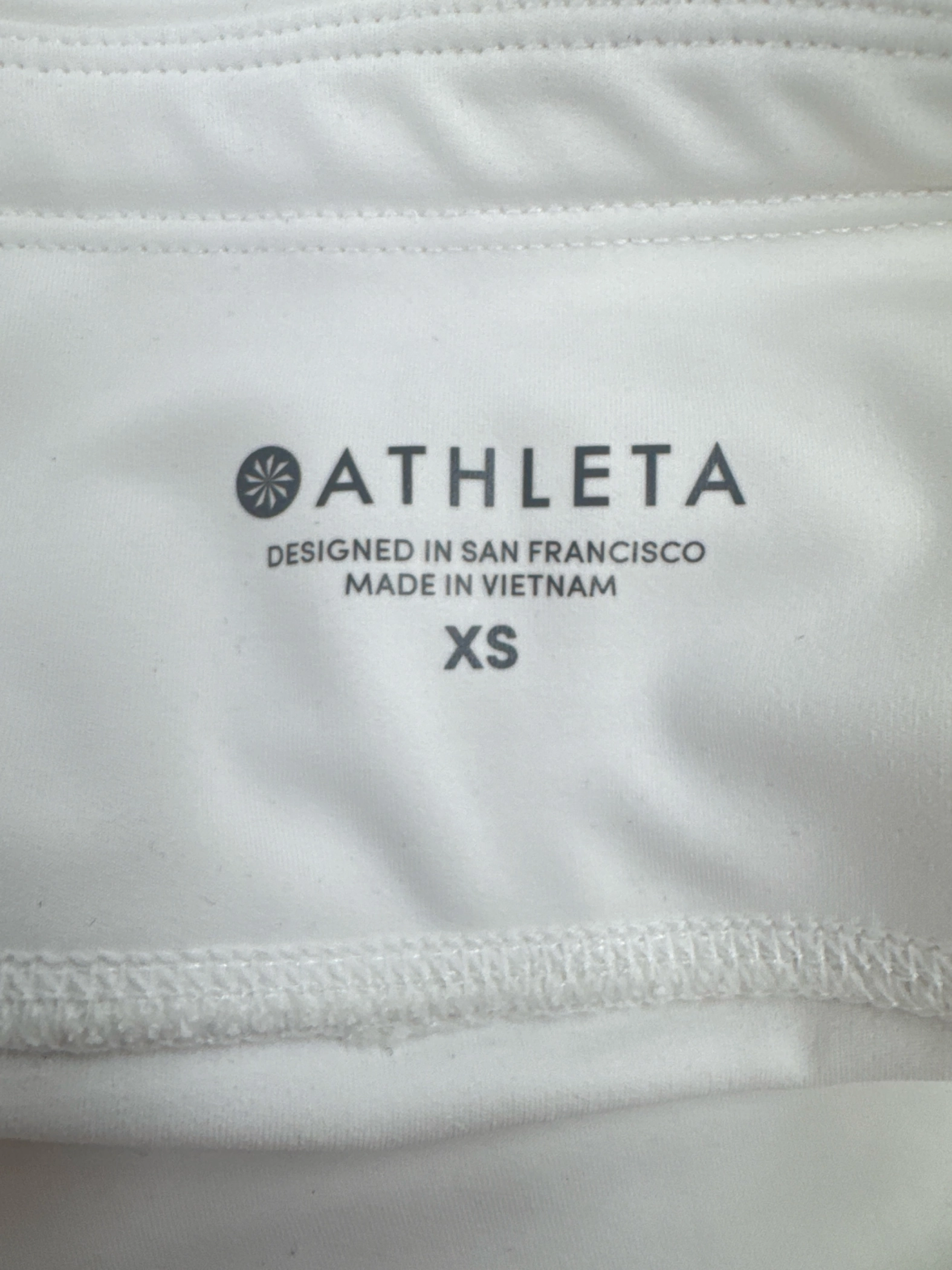 Elevate your workout wardrobe with these pre-owned Athleta Contender Laser 7/8 Tights. These white leggings are crafted from a blend of polyester, spandex and Lycra fabric that offers flexibility, comfort, and performance. Featuring a stylish laser-cut design, pockets, and a flattering fit, these activewear pants are perfect for yoga, running, or everyday wear. They are in excellent condition and made in Vietnam. Get ready to experience comfort and style on the move.