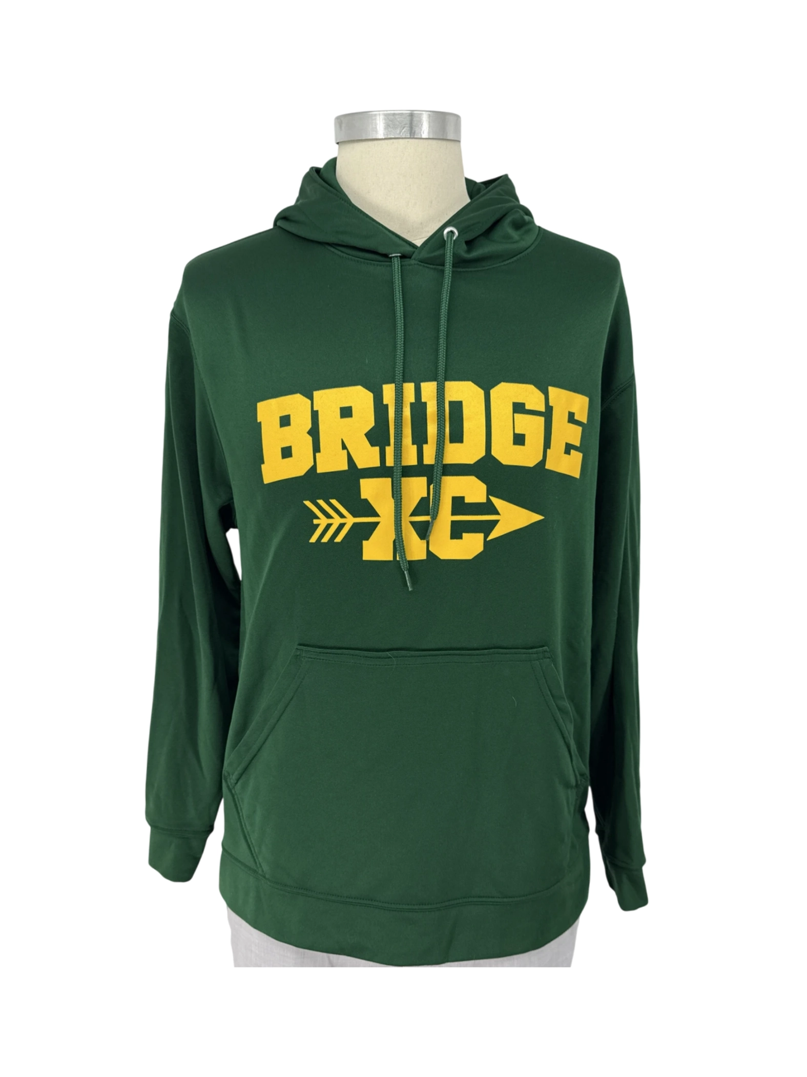 This pre-owned Augusta Sportswear hoodie is a great addition to any activewear collection. Made of comfortable polyester material, this hooded sweatshirt in a classic green color with yellow lettering is perfect for those cooler months. Ideal for casual wear, workouts, or layering during outdoor activities. The design features a Bridge XC logo on the front, and it offers a comfortable fit with a drawstring hood. It's a stylish choice for anyone seeking comfort and durability in their activewear.