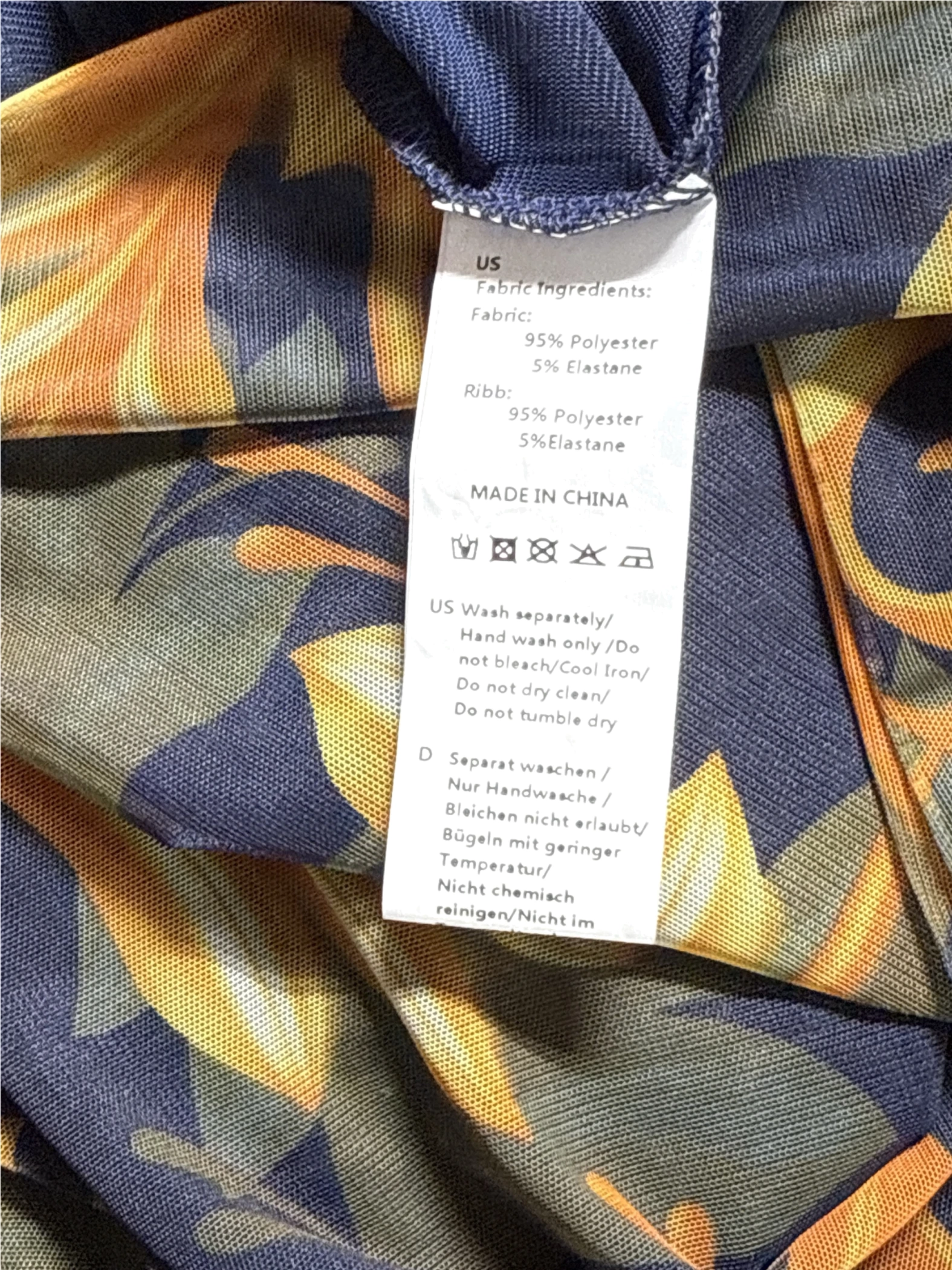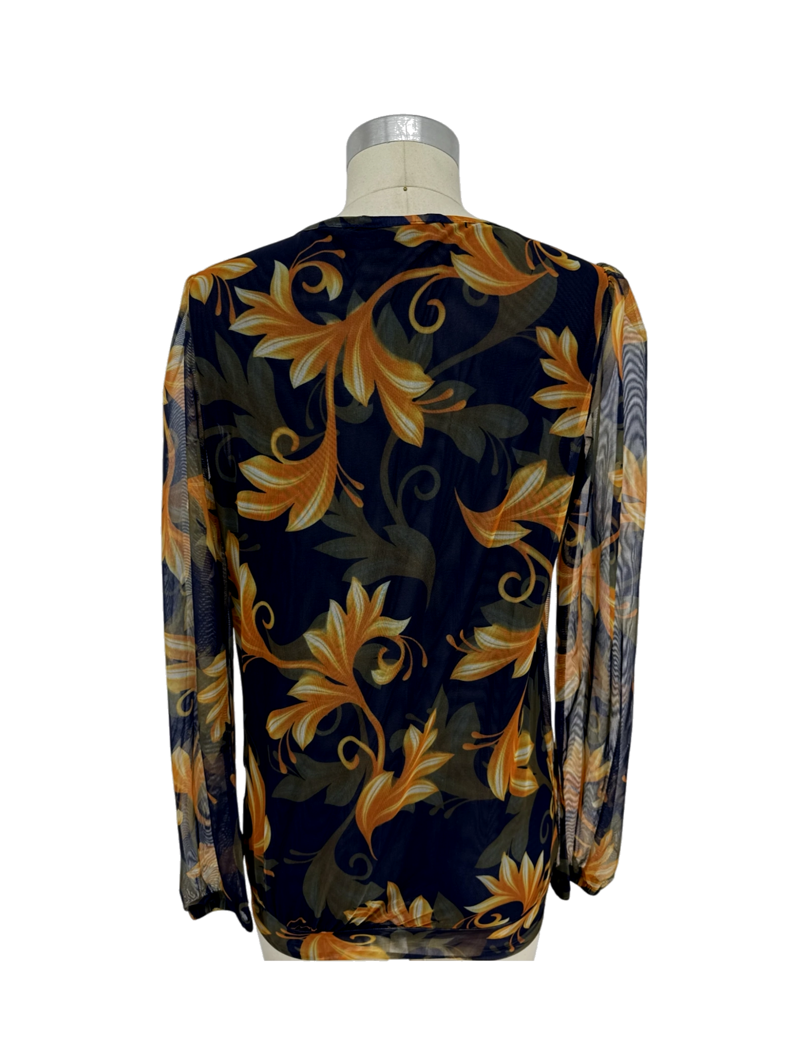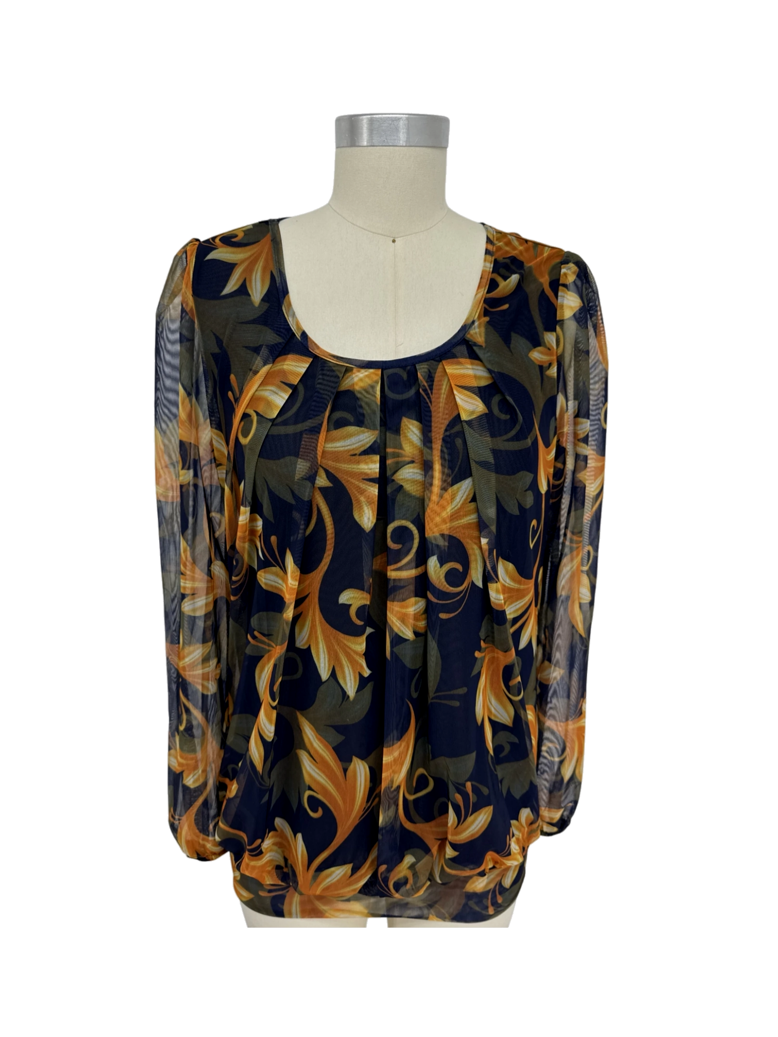 This pre-owned AVTOSRNO blouse is a stylish addition to any wardrobe. Featuring a vibrant floral pattern in shades of orange, green, and navy blue, the blouse offers a light and airy feel, perfect for warmer seasons. With long sleeves and a round neckline, this top can be dressed up or down. Made with a blend of polyester and spandex, this blouse is comfortable to wear. Ideal for casual outings or special occasions.