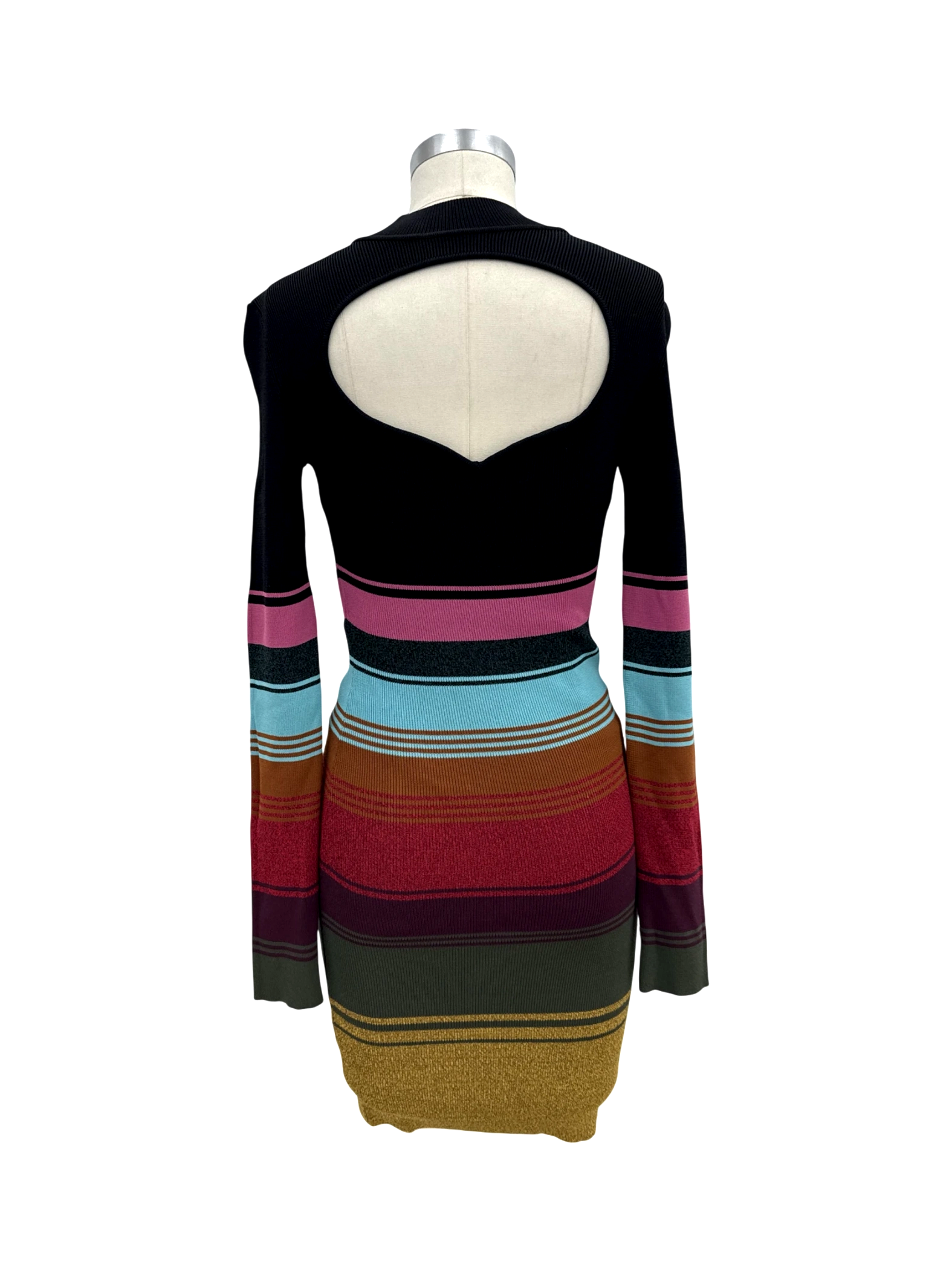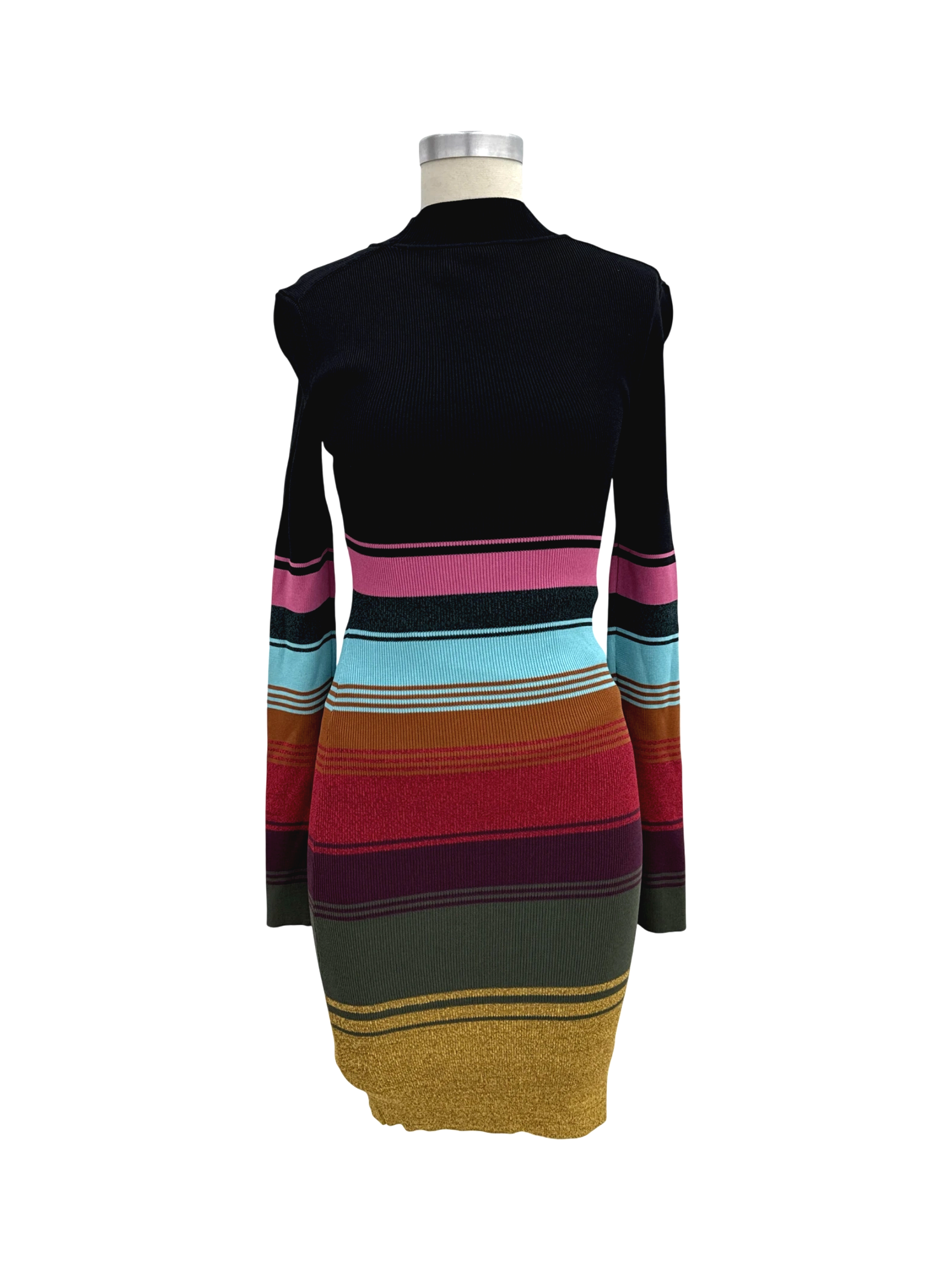 This STAUD bodycon dress is a chic choice for your wardrobe. The dress showcases a flattering silhouette with its sleek, body-hugging design. The vibrant multicolor stripes create an eye-catching look. Crafted from a blend of viscose and nylon, the dress provides a comfortable yet stylish fit. The keyhole detail at the back adds a touch of allure to the dress. Perfect for a night out or a casual gathering. This is a pre-owned dress.