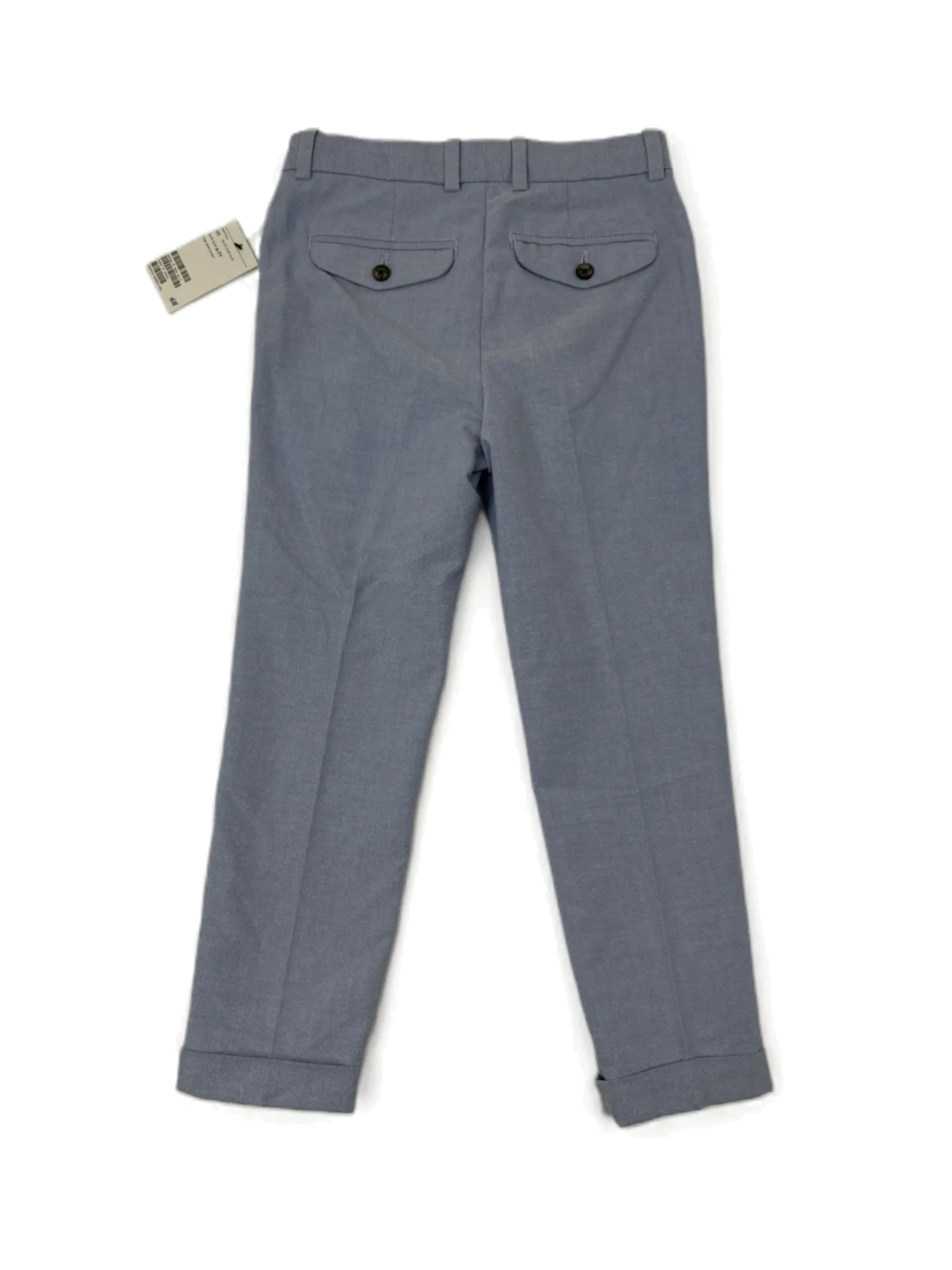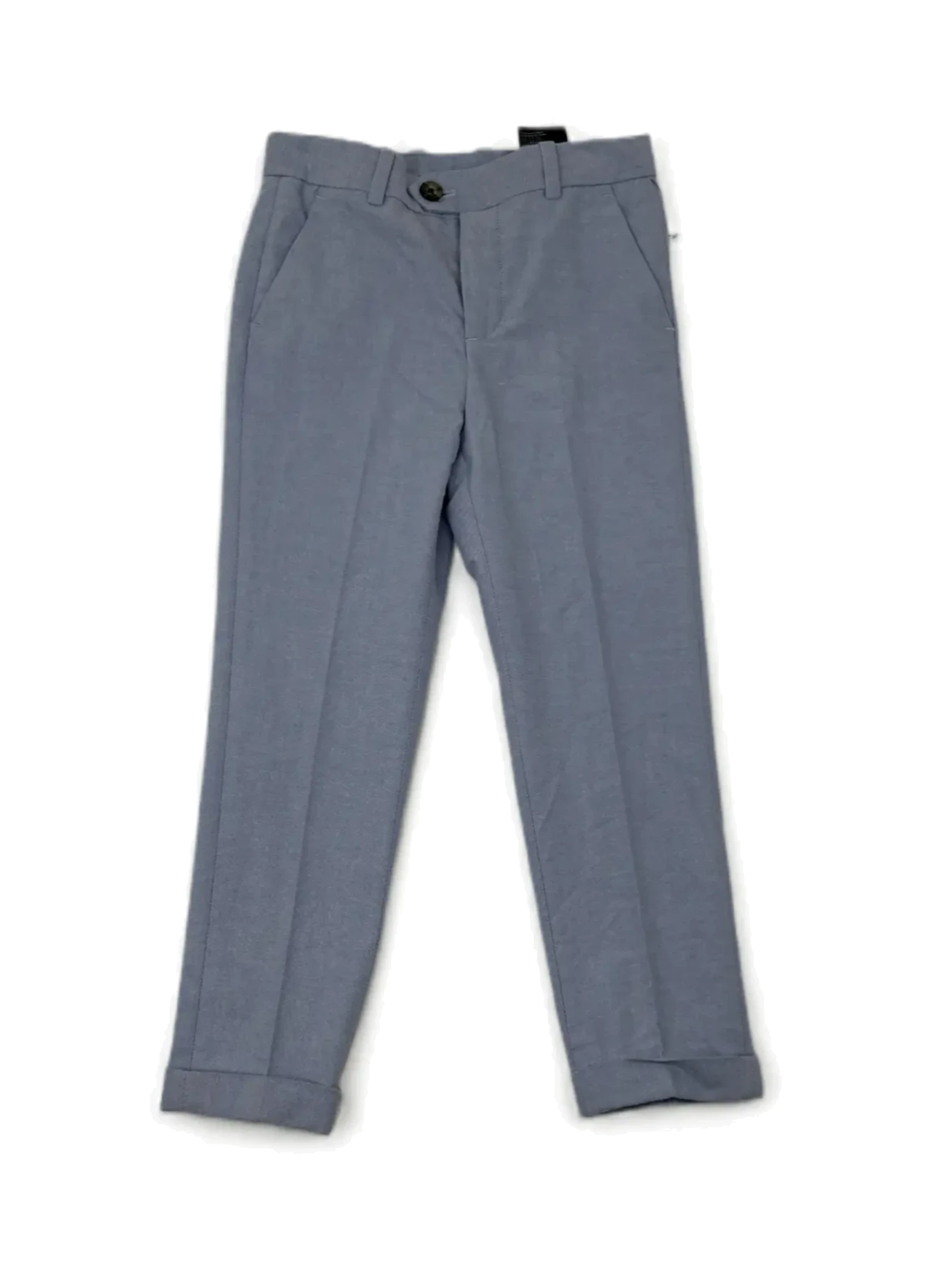 These are Boys slim-fit suit pants made from woven cotton fabric. They feature a zip fly with a button, side pockets, and mock back pockets. The size is 6-7 years.