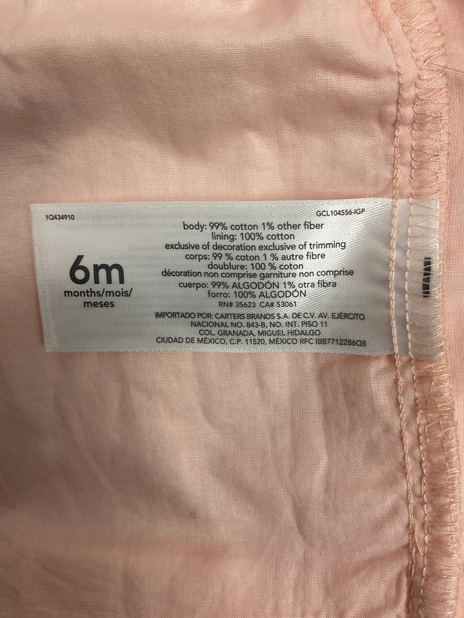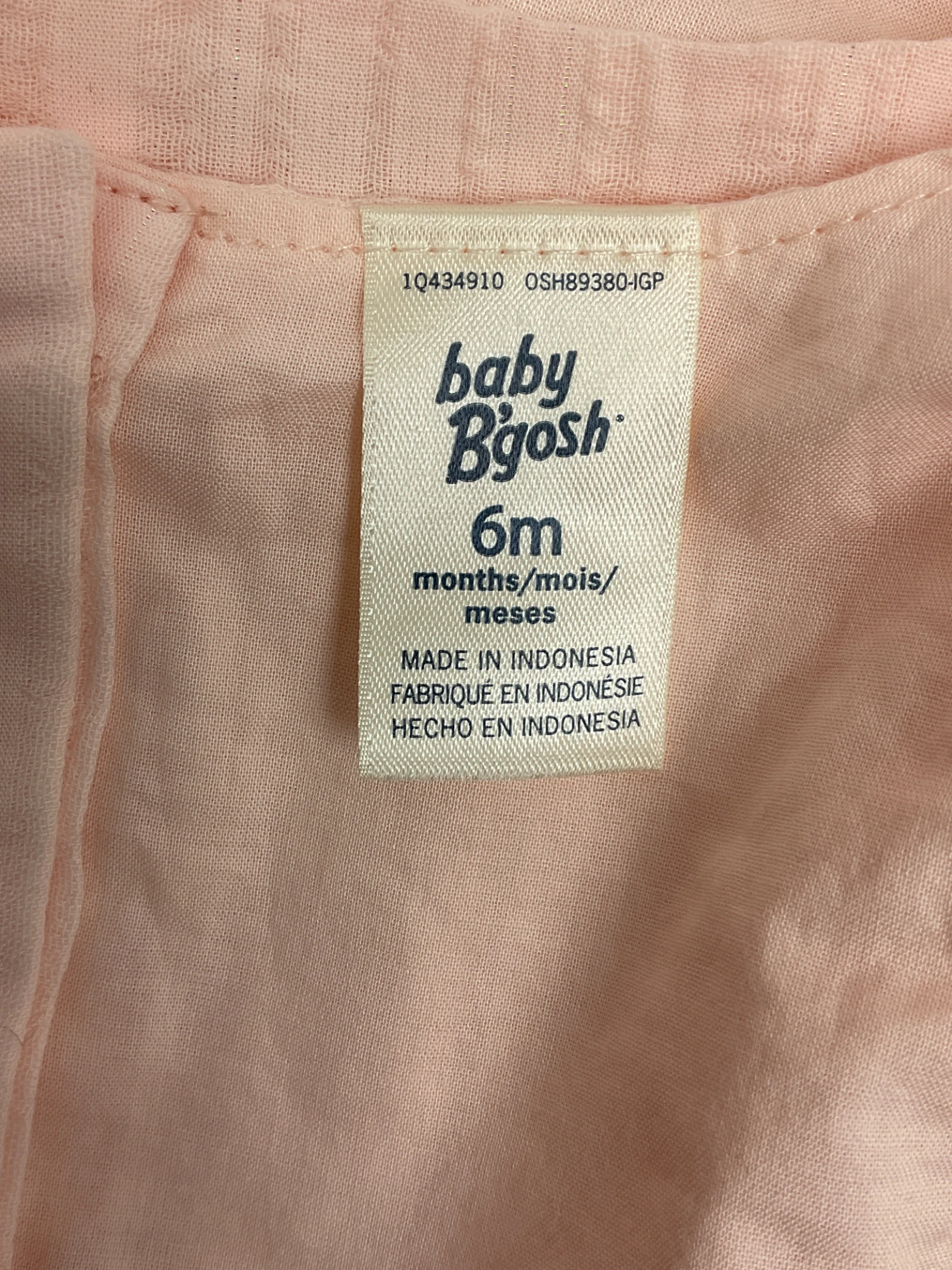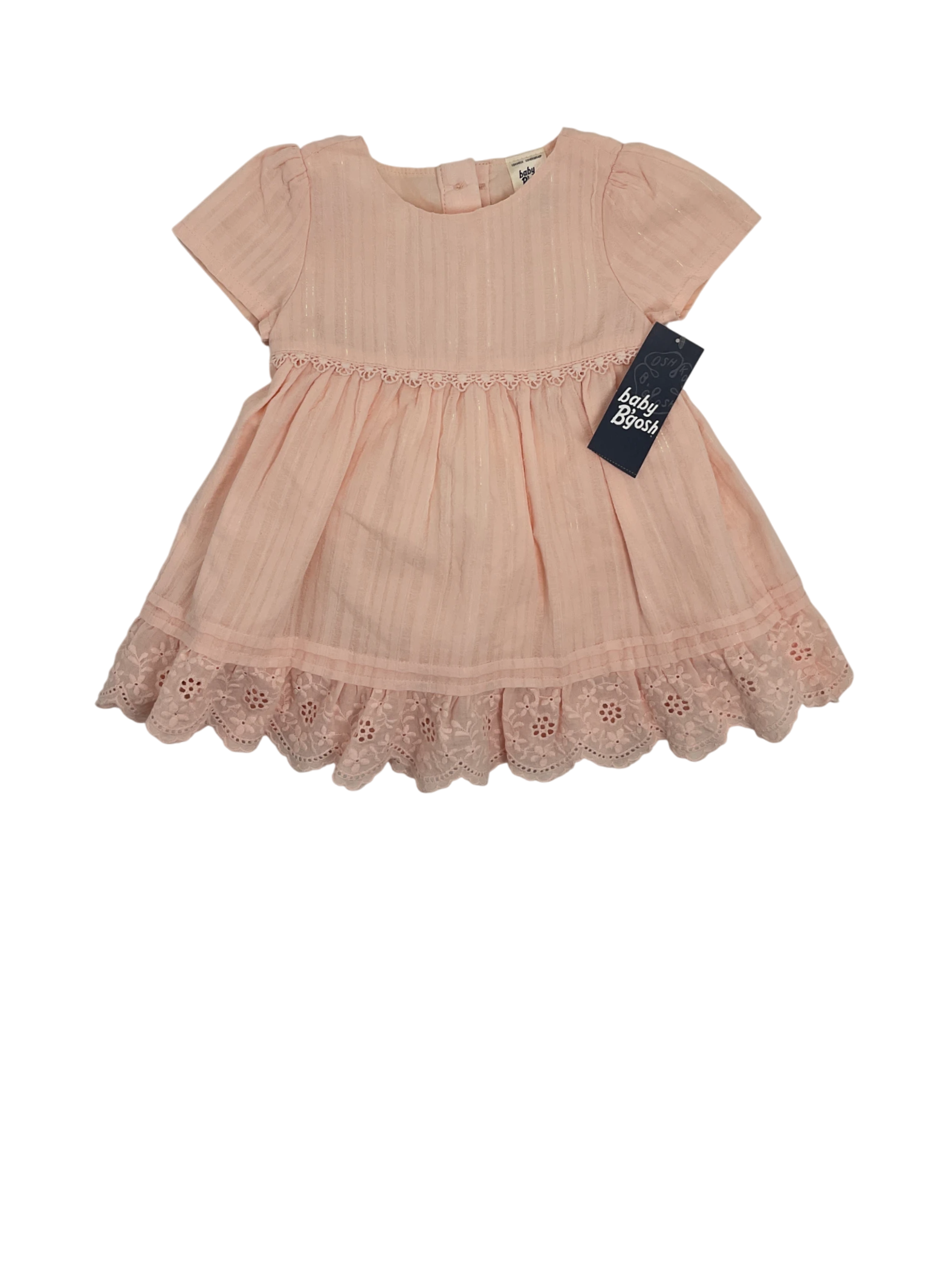 A small pink dress for a baby with a flared skirt by Baby B'gosh, featuring short sleeves and a round neck.