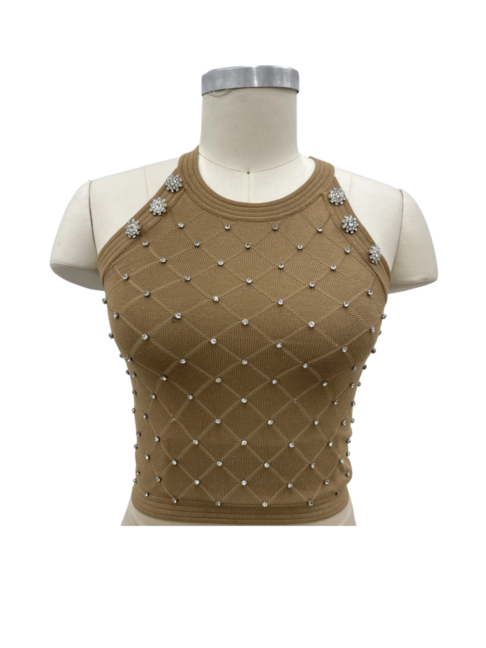 Elevate your style with this pre-owned BALBOA tank top. Featuring a chic brown geometric pattern and embellished with shimmering details, this top is the perfect addition to your wardrobe. Crafted from a soft and comfortable cotton-polyester blend, this tank top offers a flattering fit for a stylish look. Ideal for casual outings, date nights, or layering under a jacket. Shop sustainably and add this elegant top to your collection.