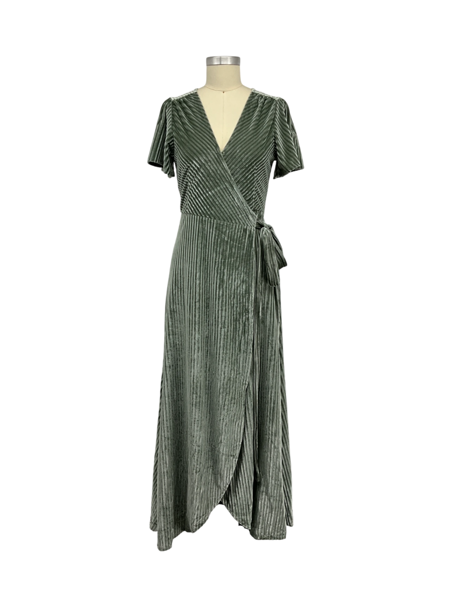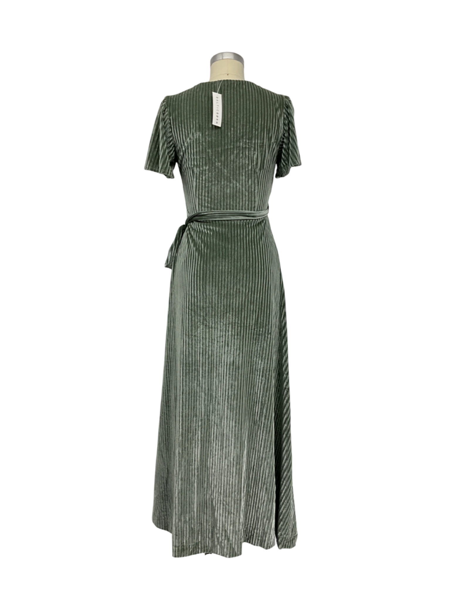 Olive maxi dress for women with short sleeves, a V-neck, and size XS.