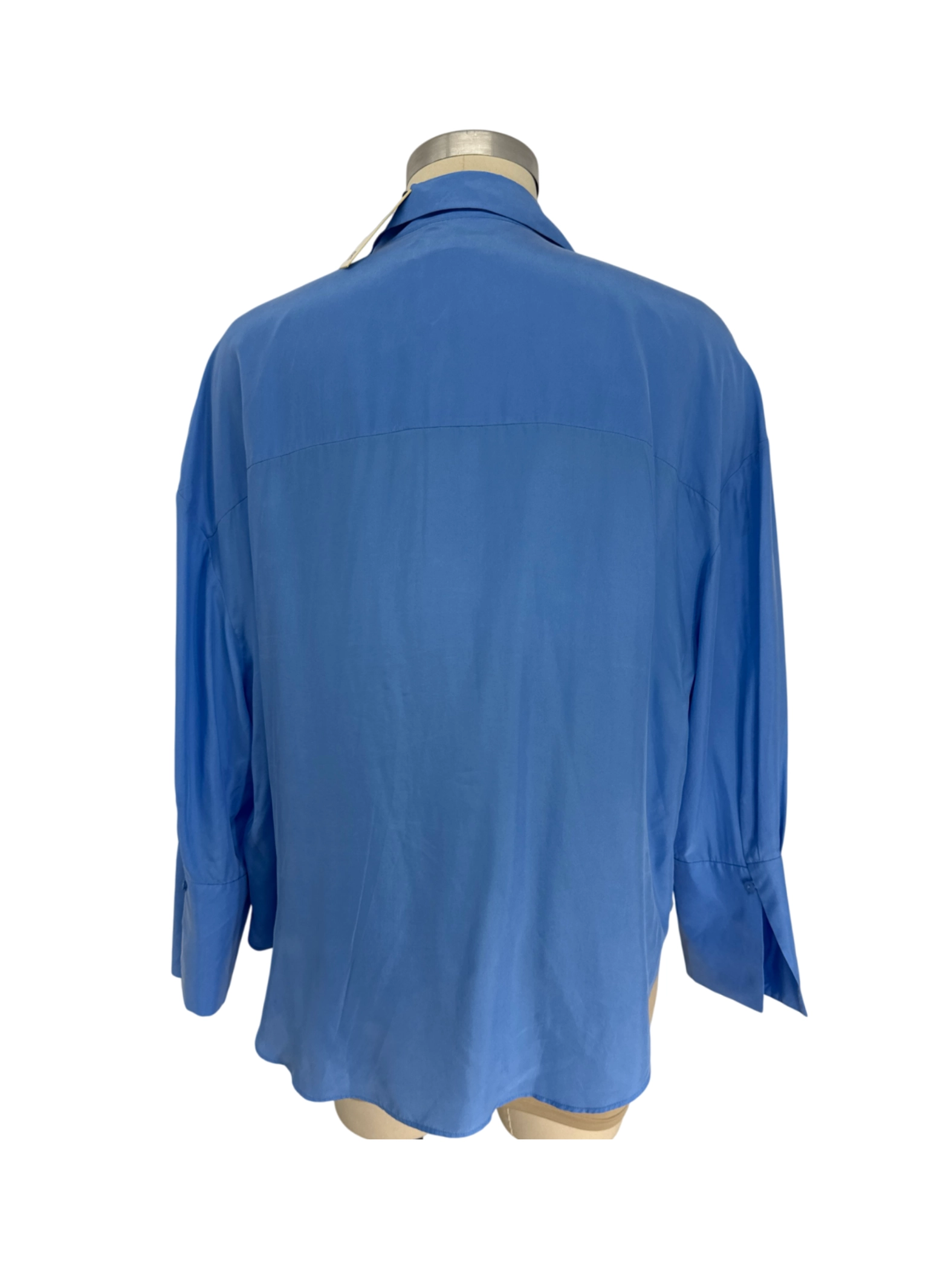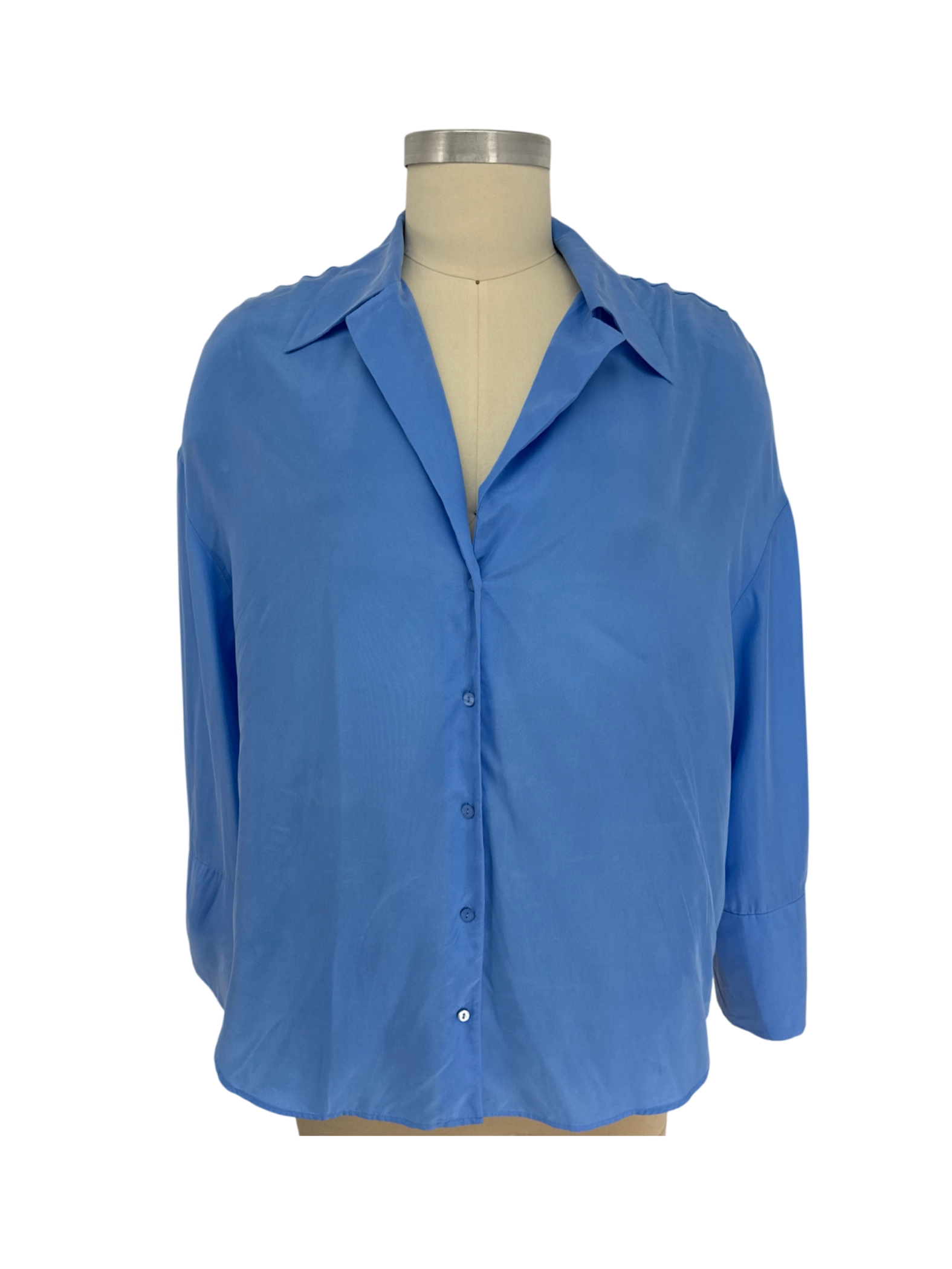 Elevate your wardrobe with this elegant pre-owned Banana Republic blouse. Crafted from luxurious silk, this button-up shirt features a classic collar and a flattering V-neck. The vibrant blue hue makes it a versatile piece for any season. Perfect for adding a touch of sophistication to your casual or work attire. This blouse offers both style and comfort. Pair it with your favorite pants or skirt for a chic and polished look. A timeless piece that adds a touch of luxury to your closet.