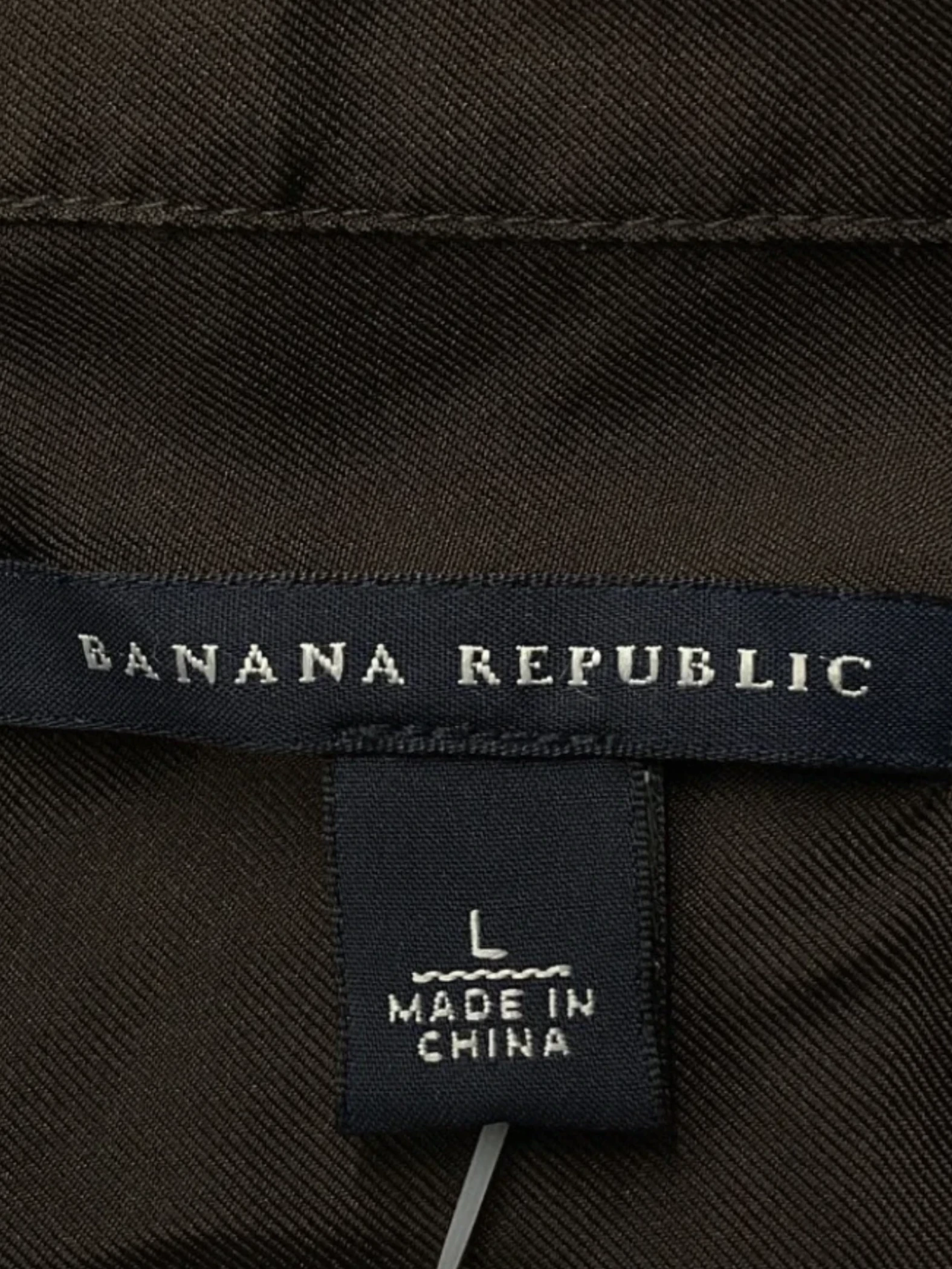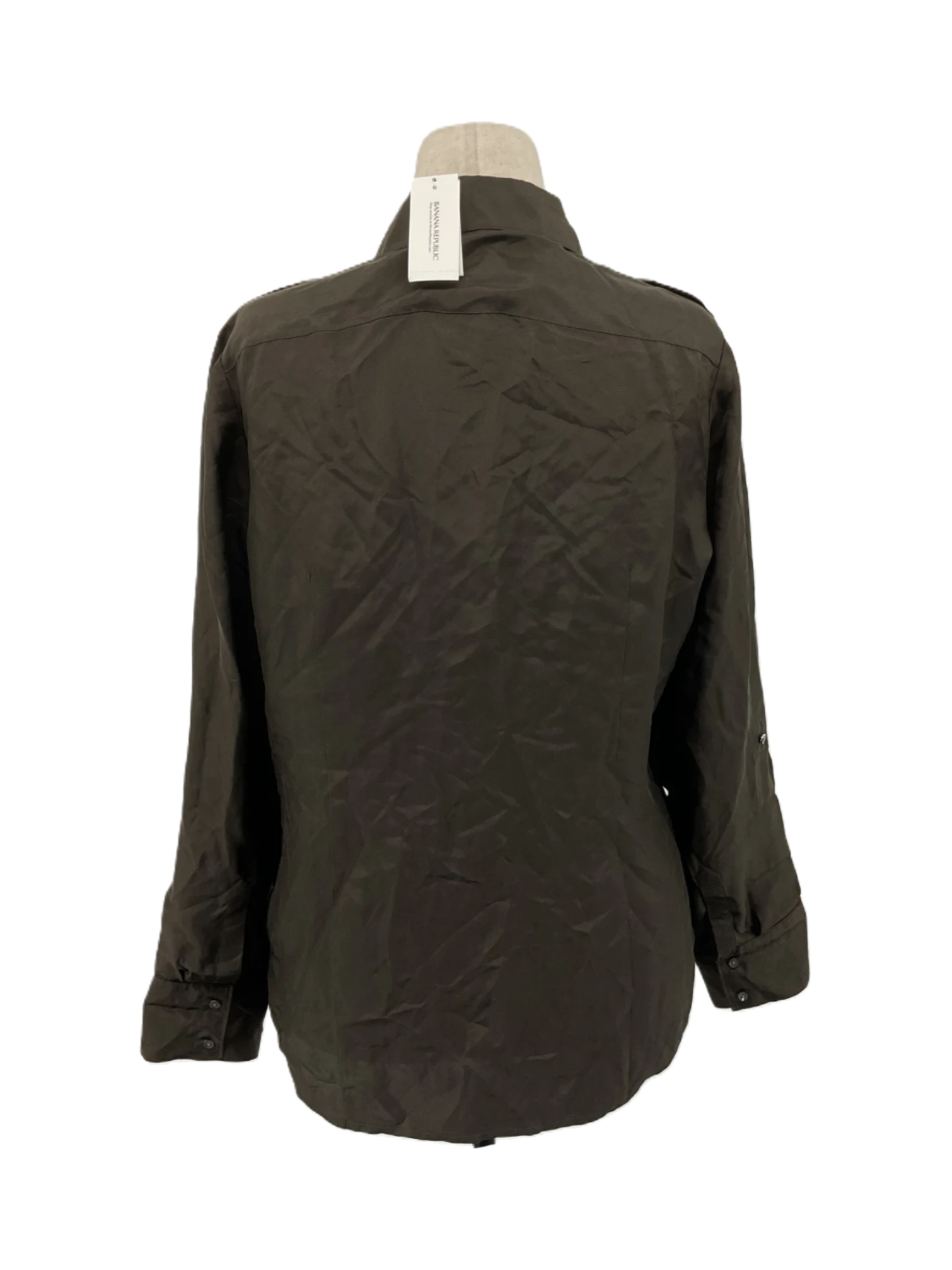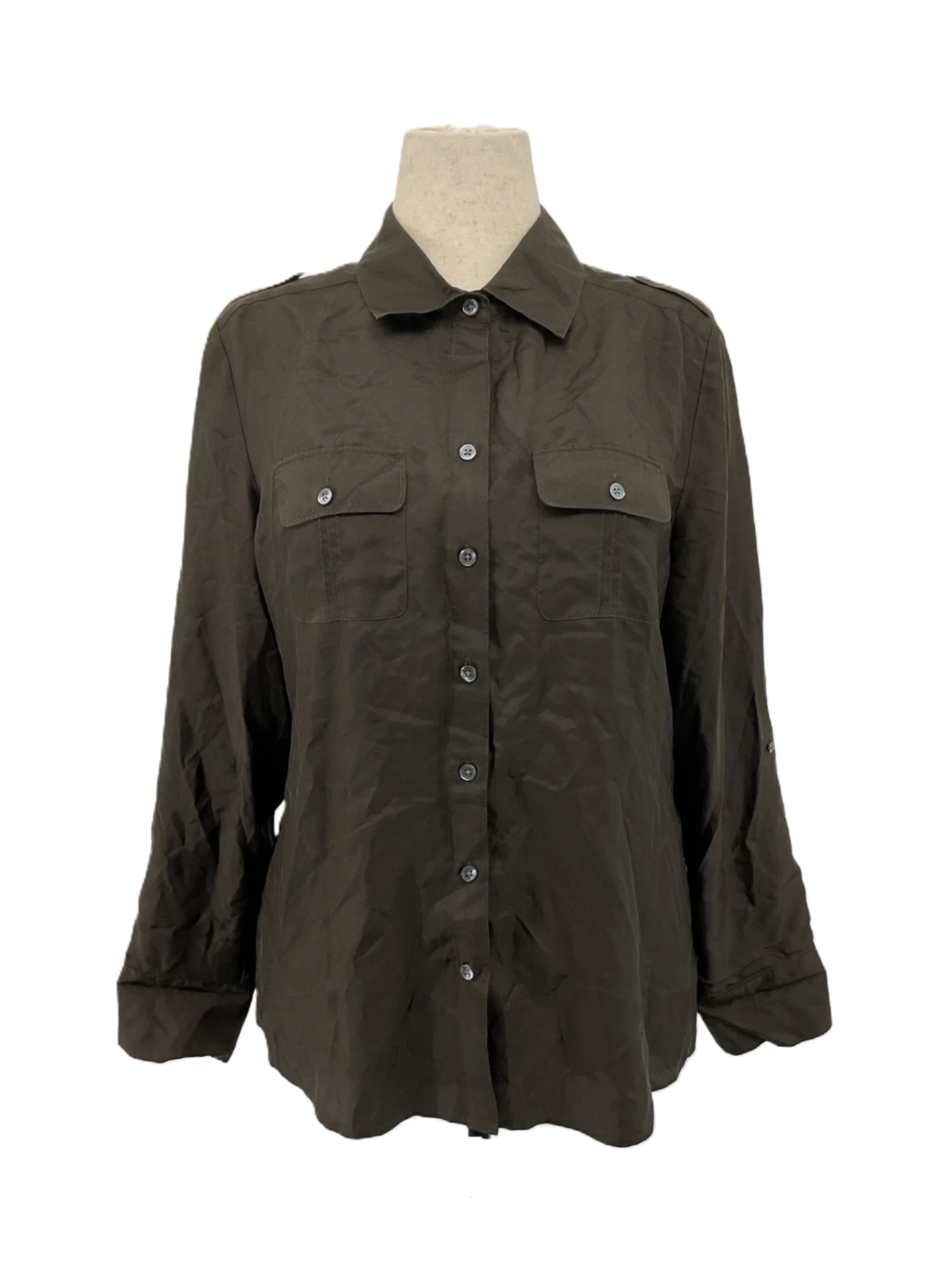 A women's long-sleeve cotton button-up shirt in dark brown, size Large is available.