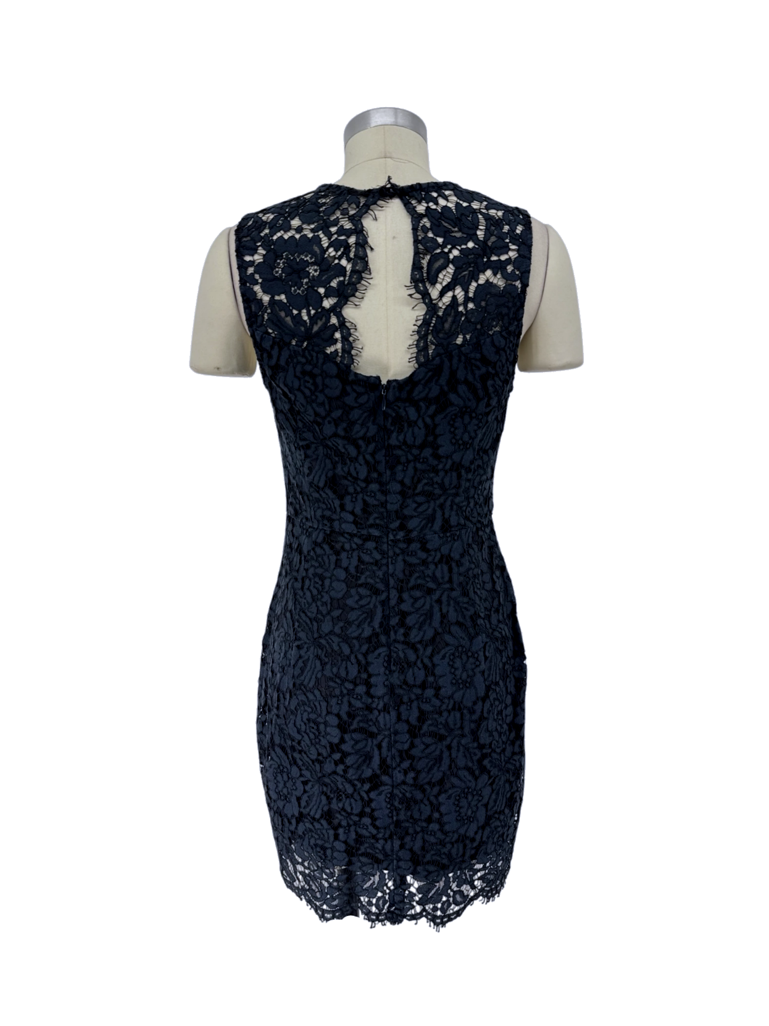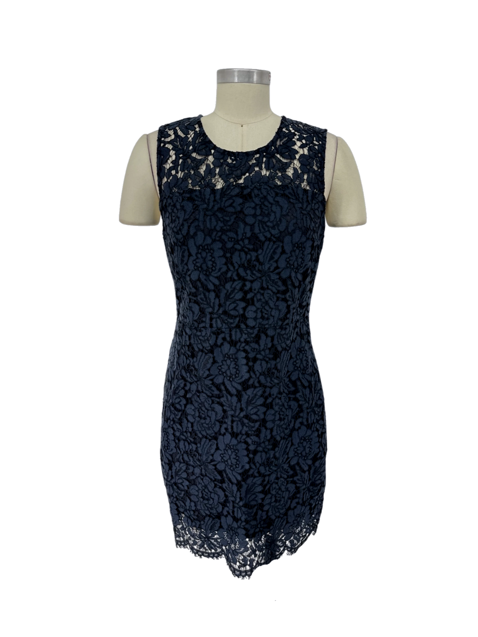 This stunning pre-owned Banana Republic sheath dress is perfect for a night out! Featuring a beautiful black floral lace overlay, sleeveless design, and a flattering sheath silhouette. The dress is made of a mix of nylon, polyester, and cotton for a comfortable fit. Ideal for cocktail parties and formal events. The dress is in excellent condition and ready to elevate your wardrobe.