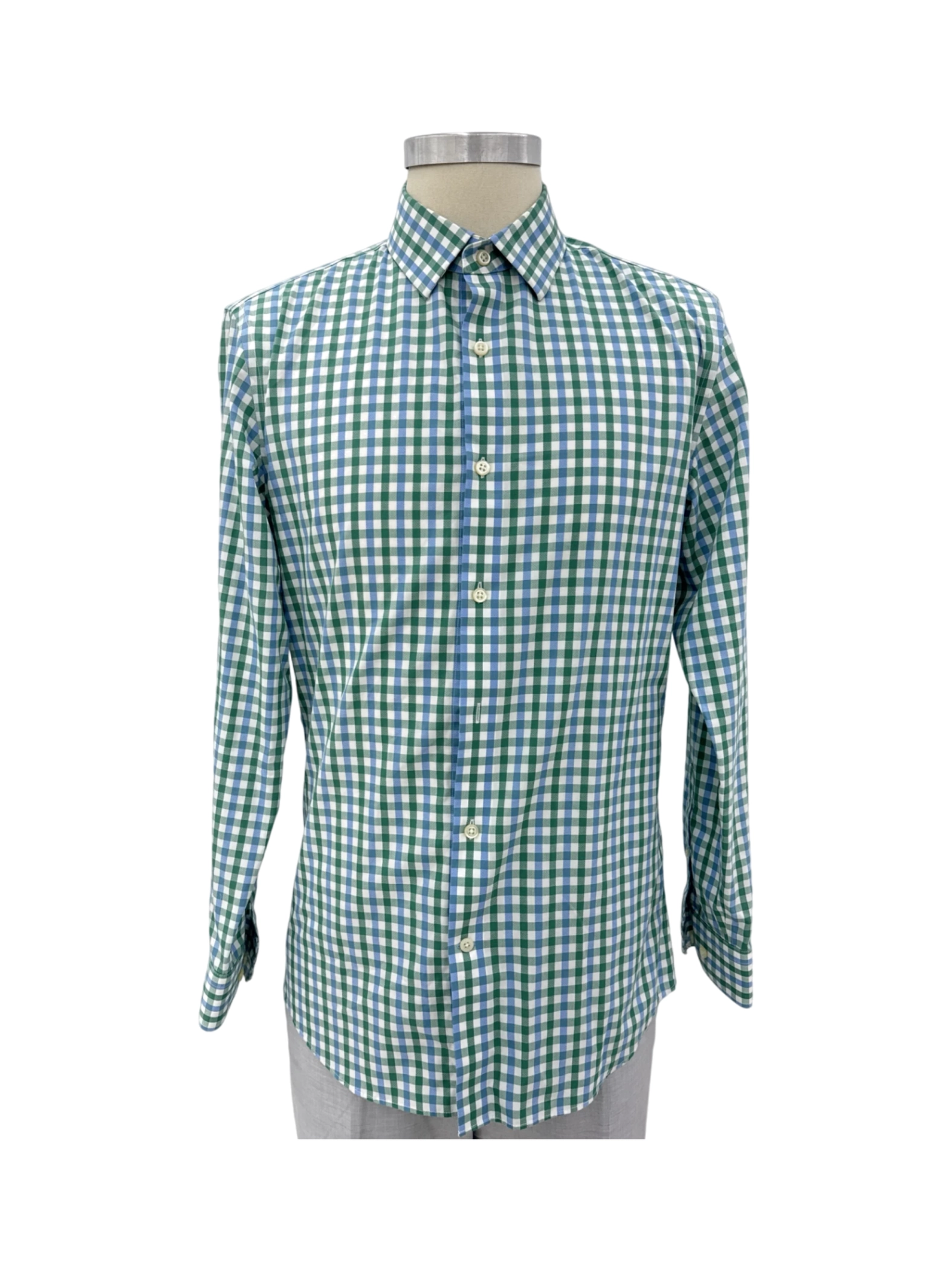 Elevate your wardrobe with this stylish pre-owned Banana Republic men's long sleeve shirt. This shirt features a classic plaid pattern in refreshing green and blue hues, perfect for adding a touch of sophistication to any outfit. Crafted from 100% cotton, it offers both comfort and durability. This shirt is versatile enough for both casual and semi-formal occasions, making it a valuable addition to your collection.