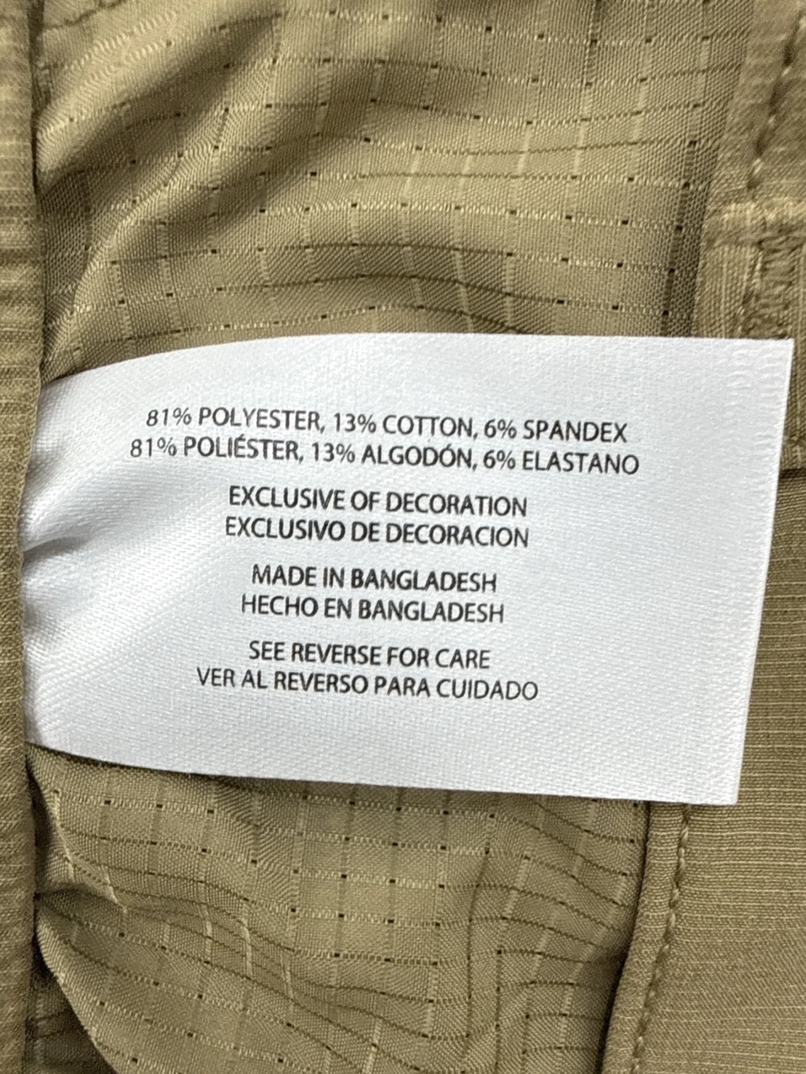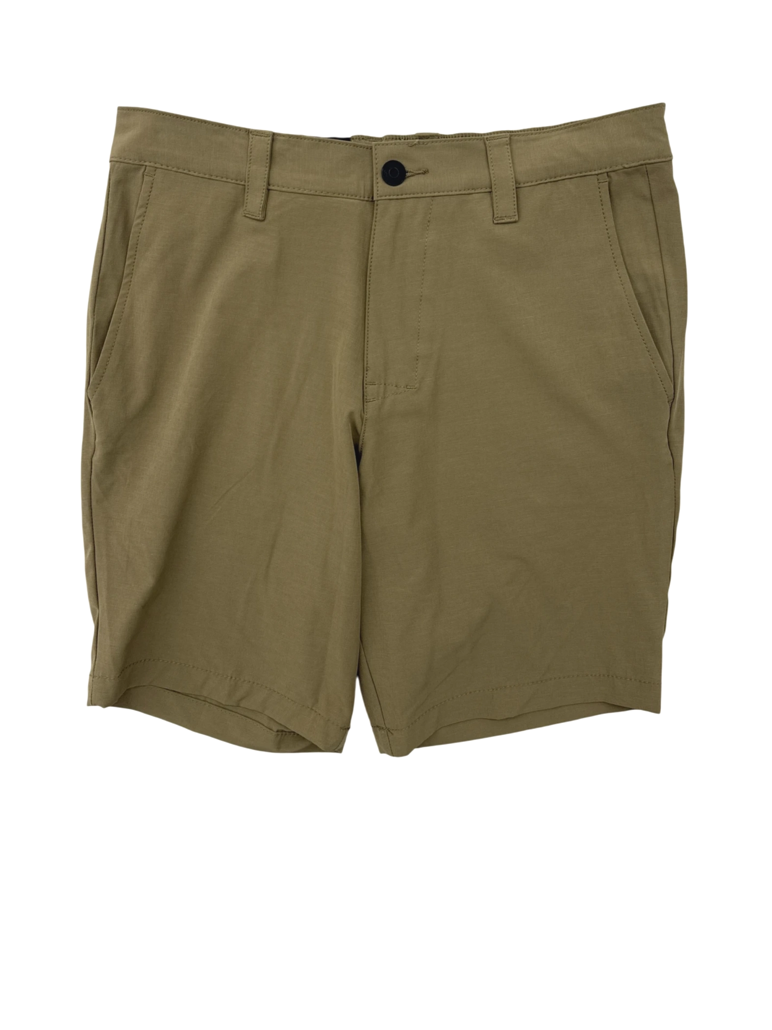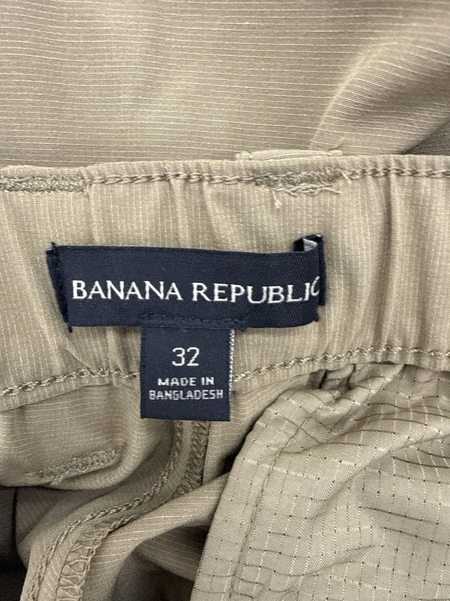 Pre-owned Banana Republic men's chino shorts. These stylish shorts feature a classic design, perfect for casual or semi-formal occasions. They are made from a durable blend of polyester, cotton, and spandex, ensuring comfort and flexibility. The khaki color adds versatility to your wardrobe. These shorts are pre-owned, but they are in excellent condition, offering a great value for a quality garment. Ideal for those looking for a comfortable and fashionable addition to their summer or spring wardrobe.