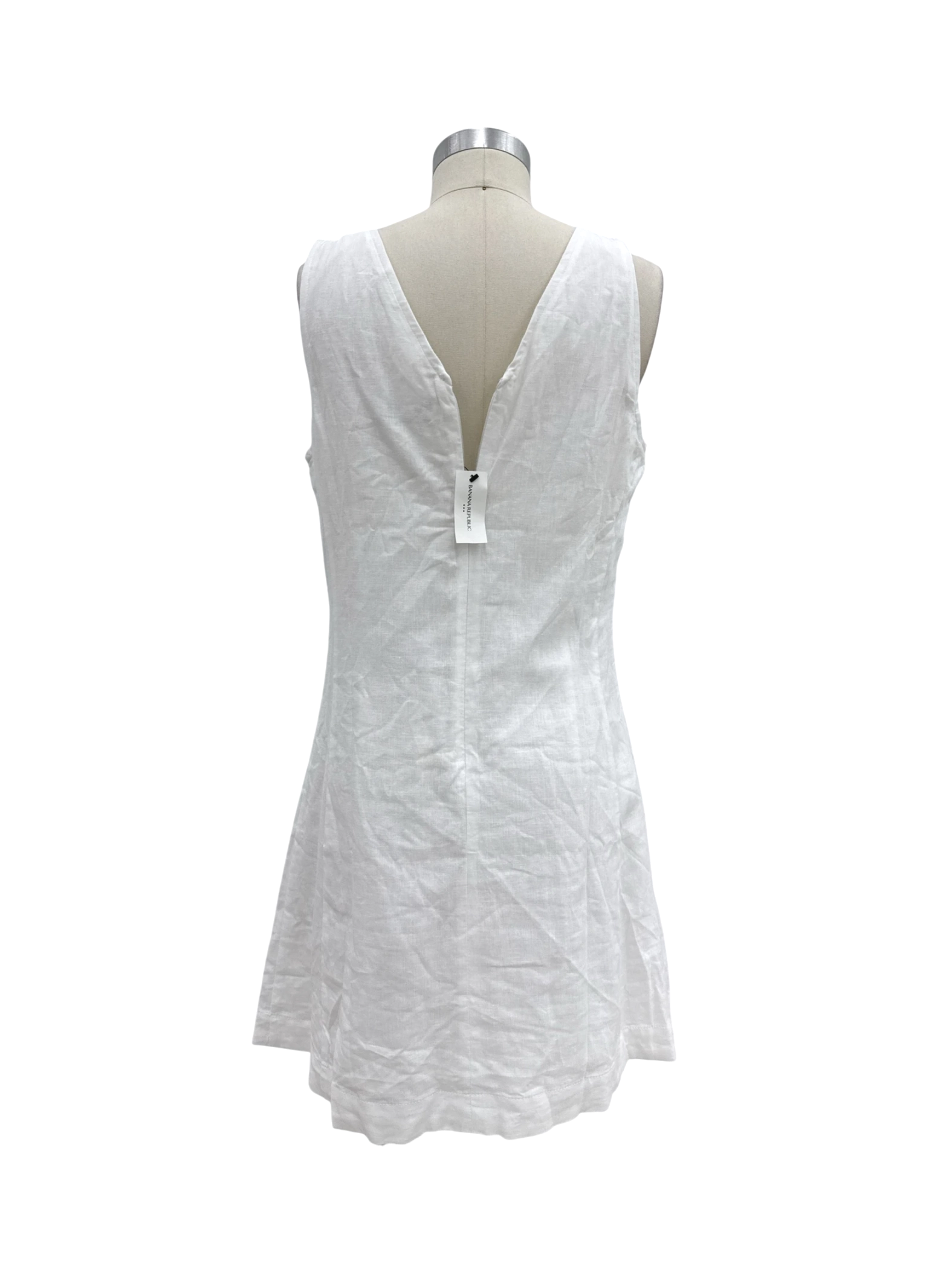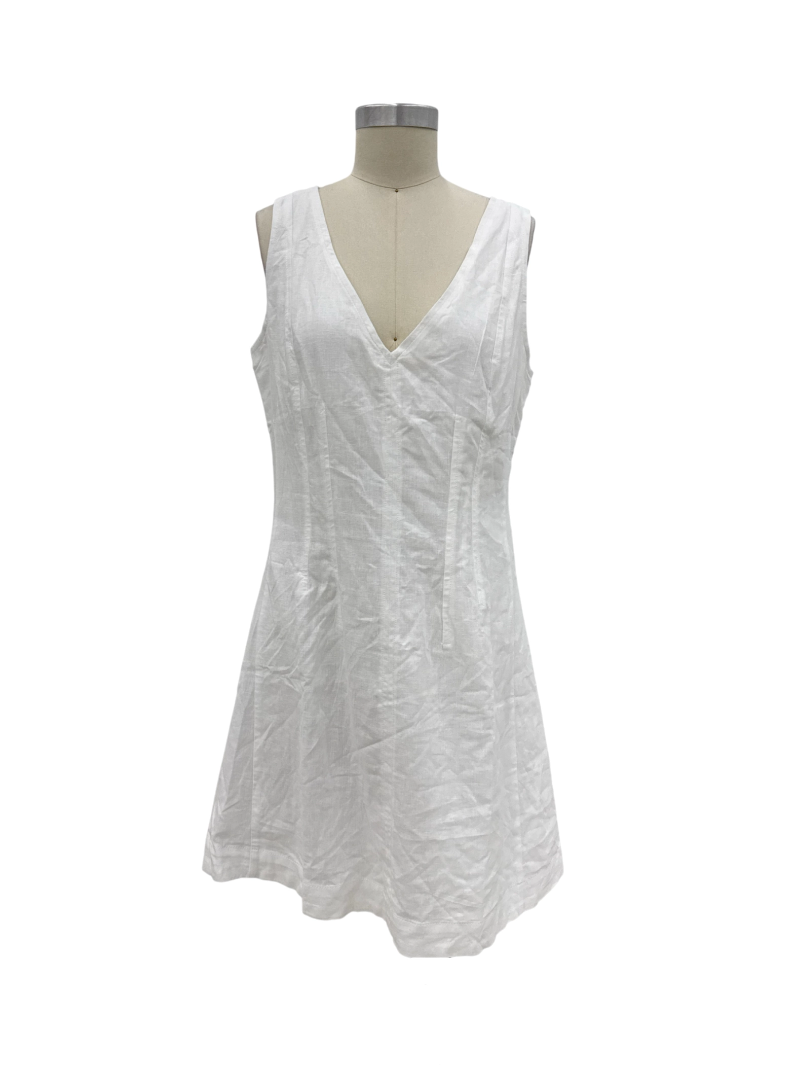 This pre-owned Banana Republic dress is a perfect addition to your summer wardrobe. Crafted from a comfortable linen-blend fabric in a crisp white hue, this A-line dress features a flattering V-neckline and a sleeveless design, ideal for warm weather. The dress is a size 6, offering a classic fit that can be dressed up or down. A versatile piece for casual outings or a summer gathering.