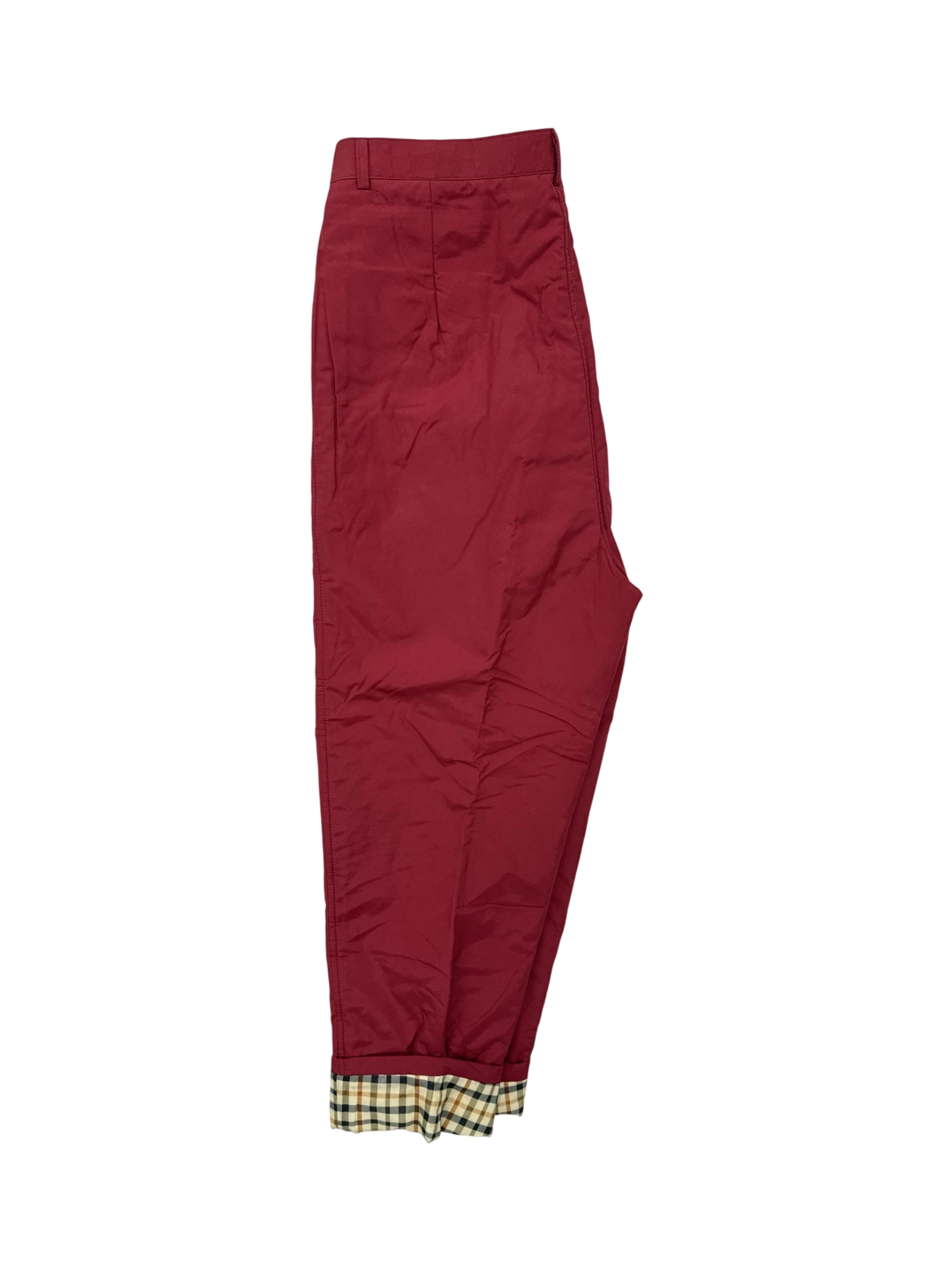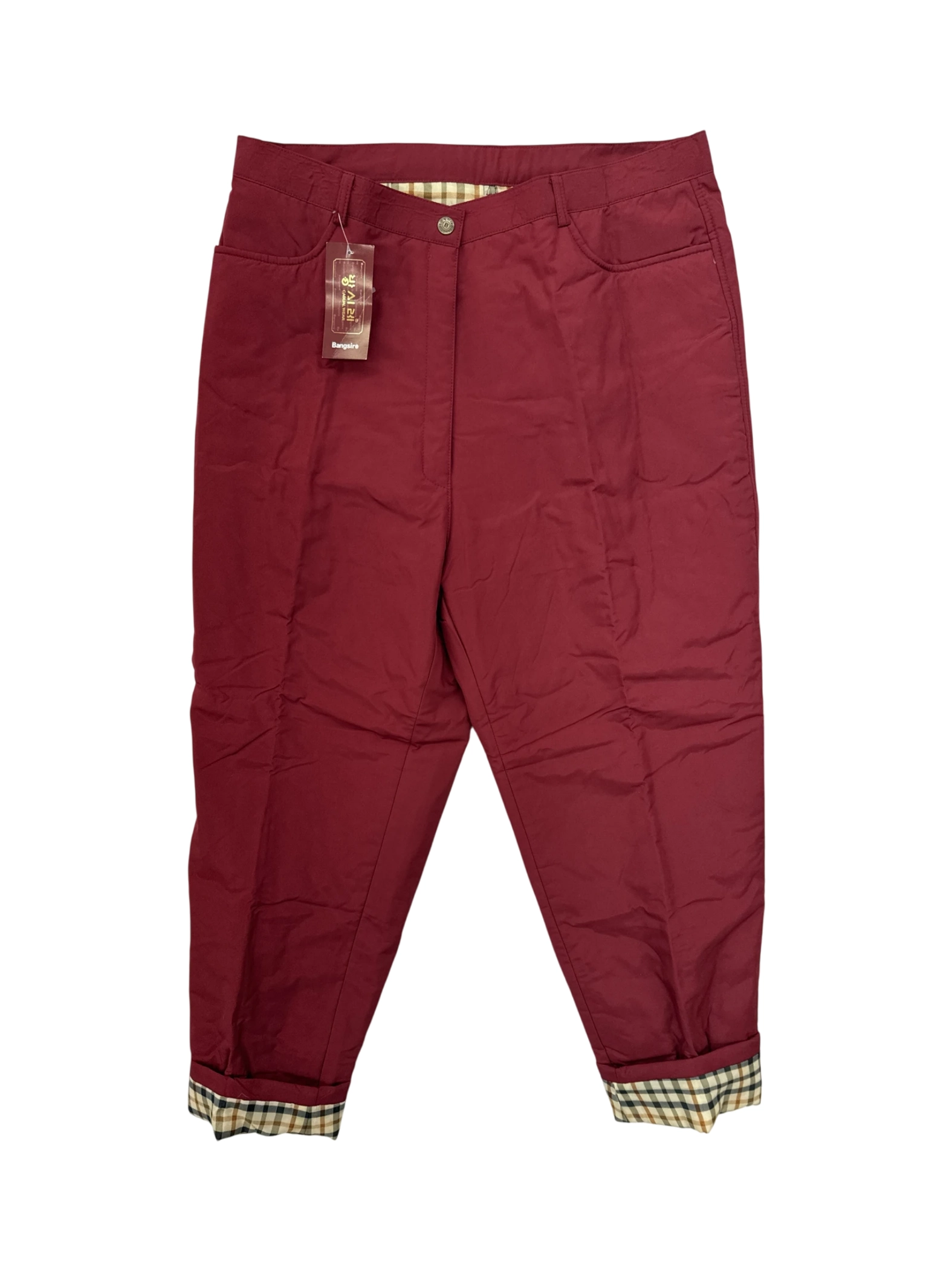 Elevate your wardrobe with these pre-owned Bangsire dress pants. These stylish trousers feature a rich burgundy color and a classic straight leg cut, perfect for fall and winter. Crafted from durable polyester, these pants offer both comfort and sophistication. The unique check pattern on the lining adds a touch of flair. Ideal for any occasion, these pants are a must-have addition to your collection.