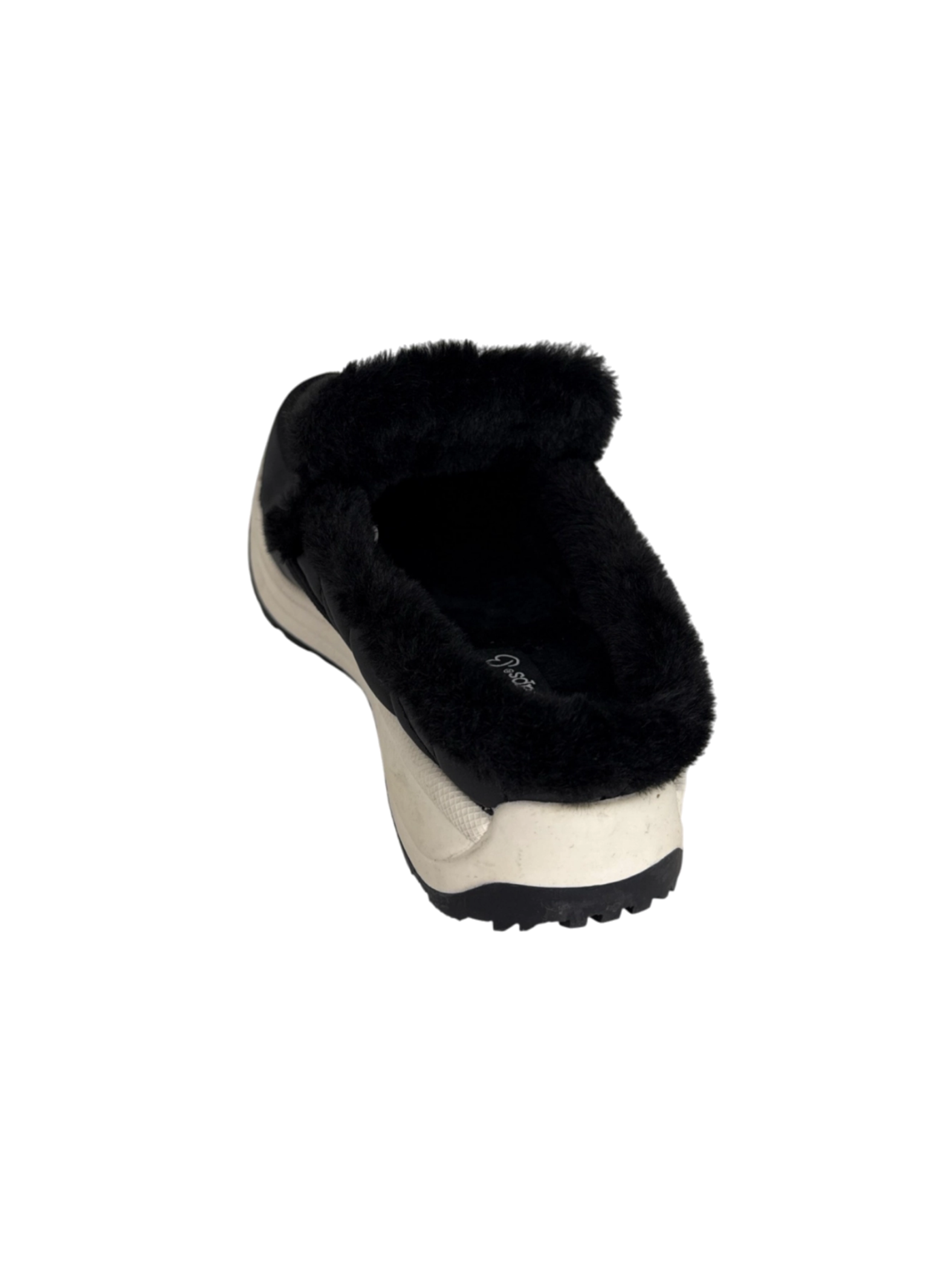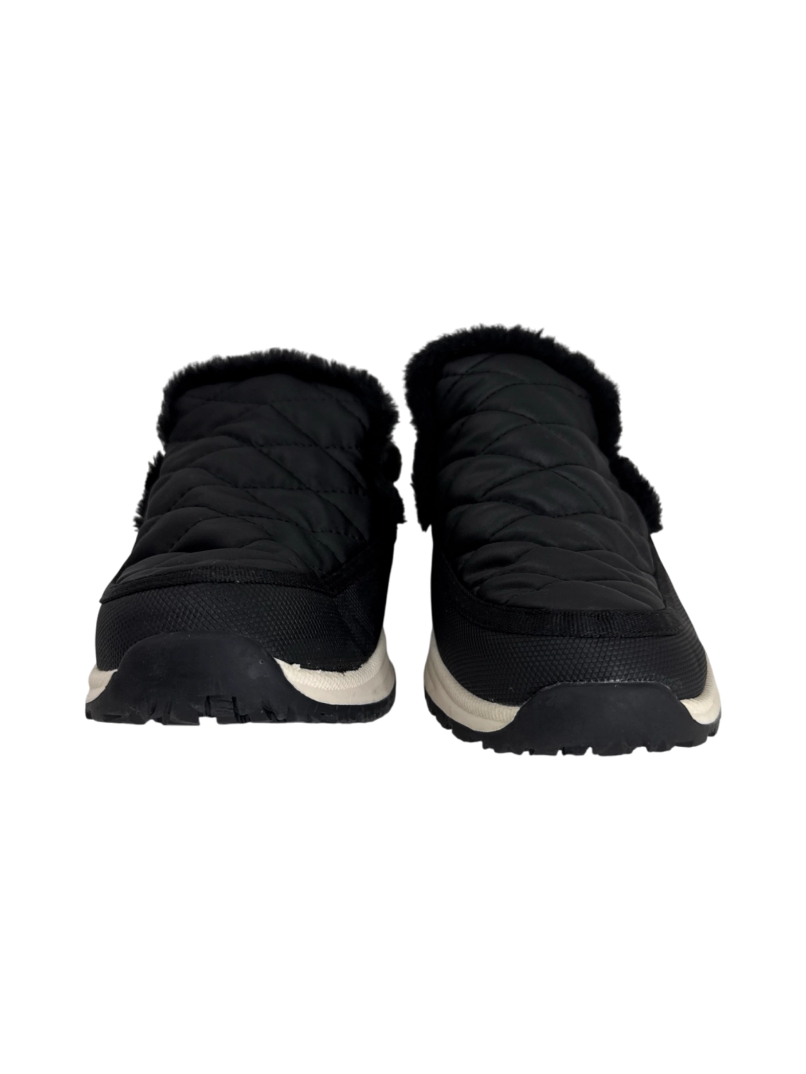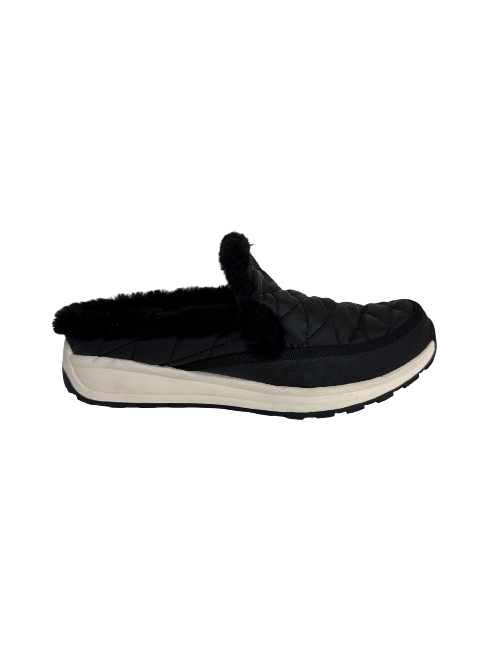 Step into comfort and style with these pre-owned women's slip-on shoes. Featuring a quilted black exterior and plush faux fur lining, these shoes offer both warmth and a touch of elegance. Perfect for cooler seasons, the slip-on design makes them easy to wear, while the durable sole provides reliable traction. The neutral black color ensures versatility, pairing well with various outfits. These shoes are ideal for casual outings or relaxing at home, providing a cozy and fashionable choice.
